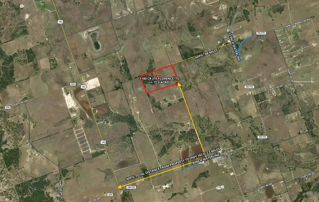 ***DEVELOPMENT POTENTIAL*** 72.75 acres on CR 215 in Florence that is ag exempt, unrestricted, no floodplain, and level. The property has 1420 ft. of CR 215 paved road frontage and is approximately 1.25 miles from HWY 183, 8.5 miles to Georgetown, and 11 miles to Seward Junction which is where HWY 183 and HWY 29 intersect. There is a 12'' City of Georgetown waterline .83 miles away due East on FM 970 and there is a 2'' waterline in front of the house, but the house is on well water. PEC Electric services the property as well. The property is outside of the ETJ and currently has no zoning. The house on the property is a 3 story, 6 bedroom, 6 full bath house that is approximately 6000 square feet. This great piece of property is prime for residential development, commercial development, a RV resort, buy and hold for investors, or for a family that wants the country feel that is close to big city amenities. Potential Buyer's to verify all information is correct and accurate.
