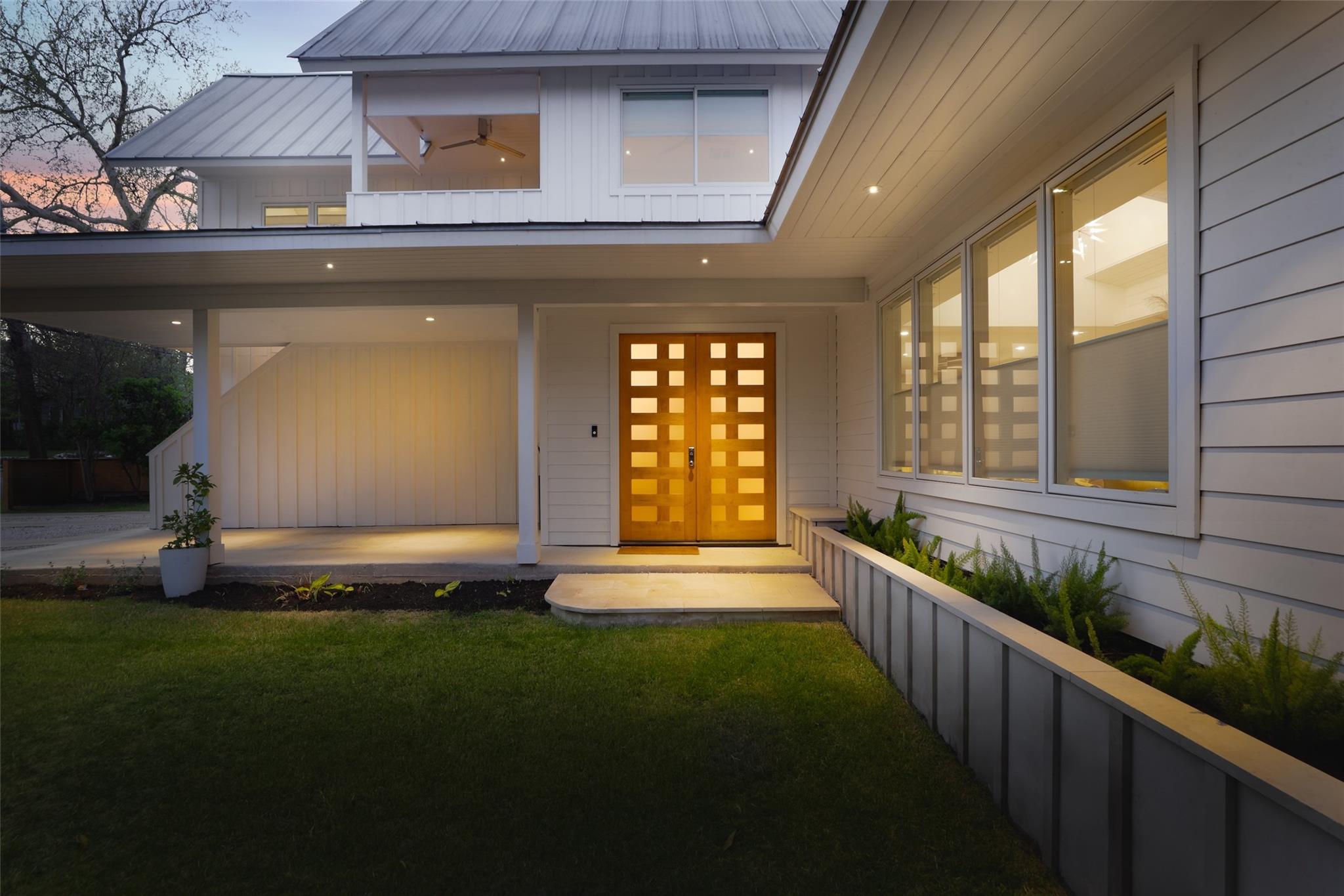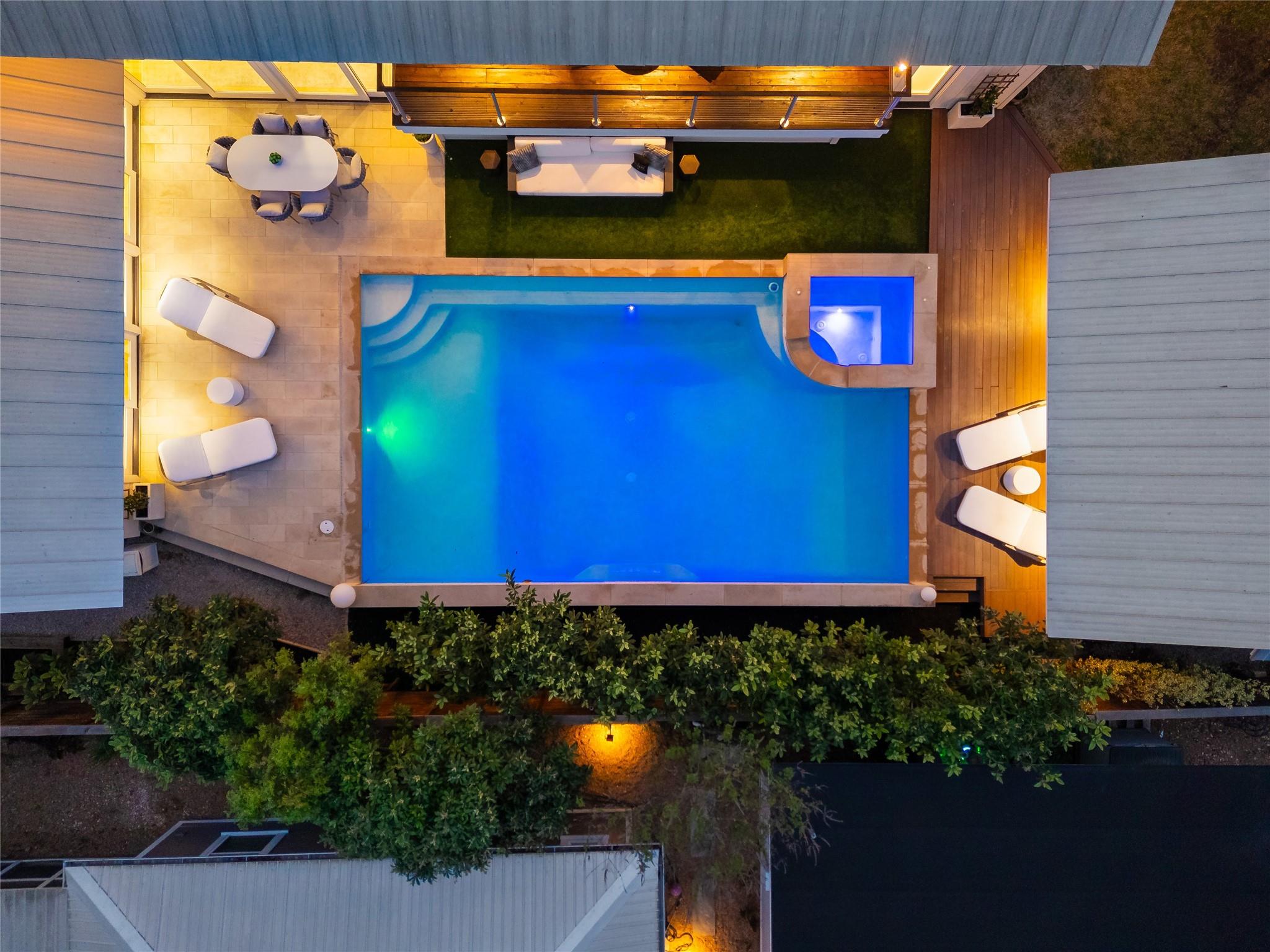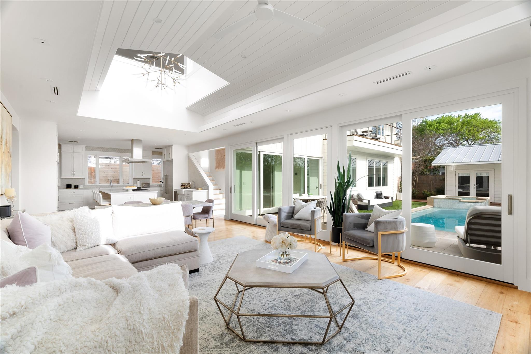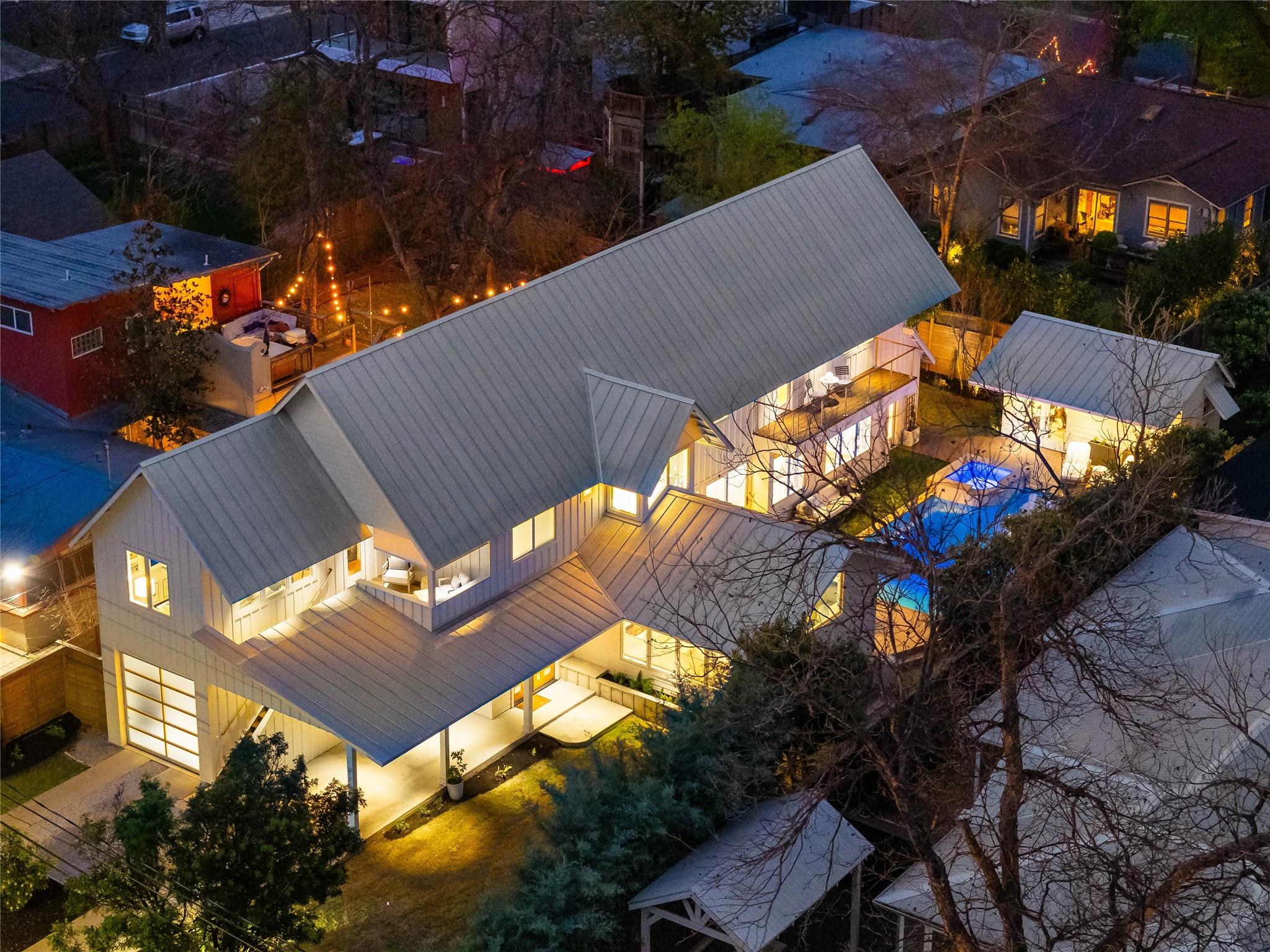 Indulge in the ultimate Austin resort-style living in this sun-drenched 4BD/4.5BA contemporary coastal farmhouse, where carefully planned sightlines and oversized windows and skylights capture wide-open views and sunlight throughout. Step into the secluded outdoor oasis where an expansive, 8-foot-deep heated pool, spa and cabana give the entire home a waterfront ambiance. A spacious yard area provides ample space for outdoor activities and play. Inside, the light and bright open-plan interiors include a vaulted great room with a dramatic clerestory window and a gourmet kitchen filled with Thermador appliances. Luxurious bedrooms begin with a main-floor Owner's retreat with a grand champagne closet and a spa bath opening directly to the outdoor hot tub. Enjoy three lovely secondary bedrooms, a game room, a home office, plus a separate well-appointed apartment with a private entrance — perfect for guests or rental income. Conveniently located near Zilker Park, Music Lane, and Austin's finest dining spots, this unique retreat offers an unparalleled blend of comfort and luxury. Don't miss out on this exceptional opportunity. Pool cabana provides an additional 202 square feet of space with a full bath for added convenience.