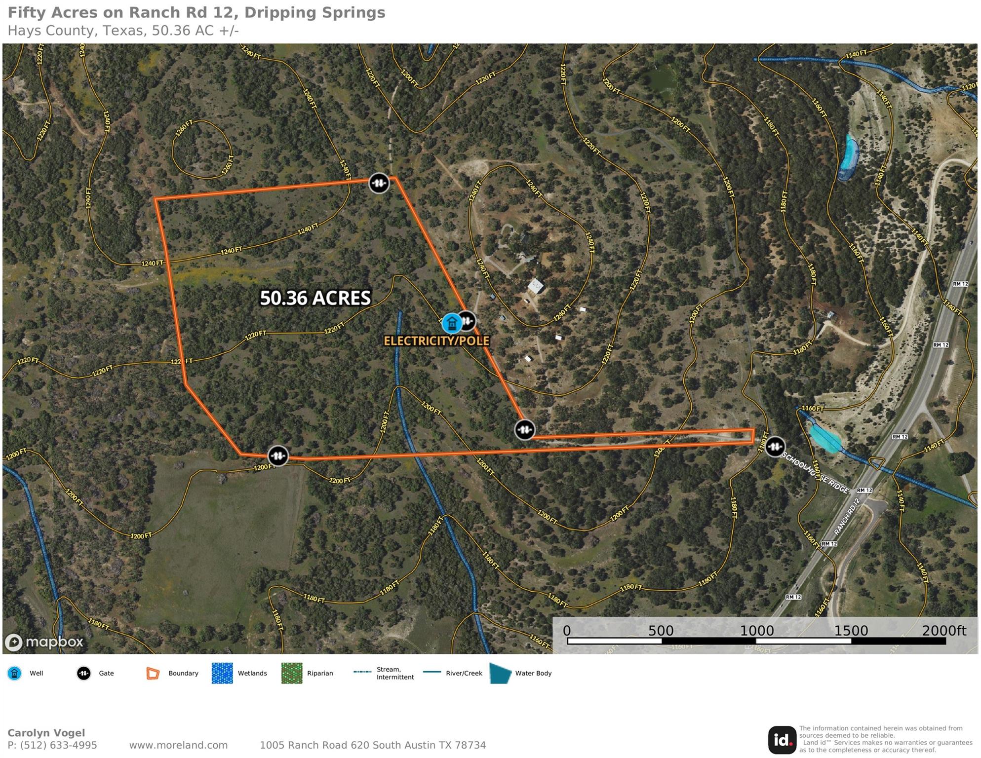 Midway of Dripping Springs and Wimberley on Schoolhouse Ridge, with entrance on Ranch Road 12, is this fifty acres of prime land: heavily wooded, with well water and electricity, and complete perimeter fencing. Offering the opportunity to be a family ranch or compound(s) as the fifty can be subdivided into two twenty-five acre parcels with each having residence, guest house, barn and associated out buildings. Access from Ranch Road 12 is gated and is a shared paved driveway with a road maintenance agreement. A wildlife valuation [exemption] is in place. Large landholdings surround the property creating scenic vistas.