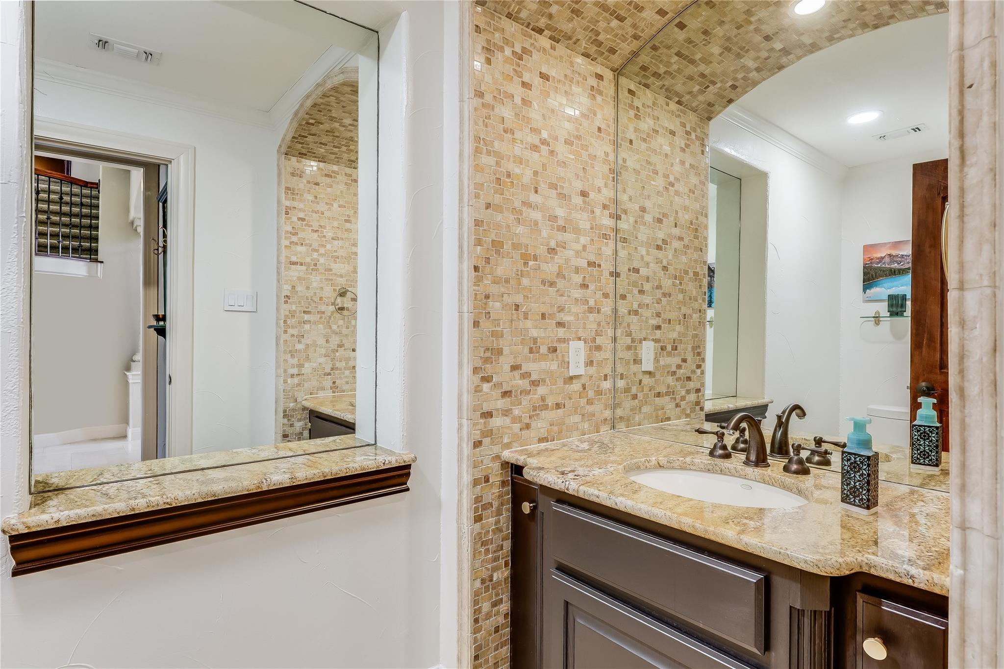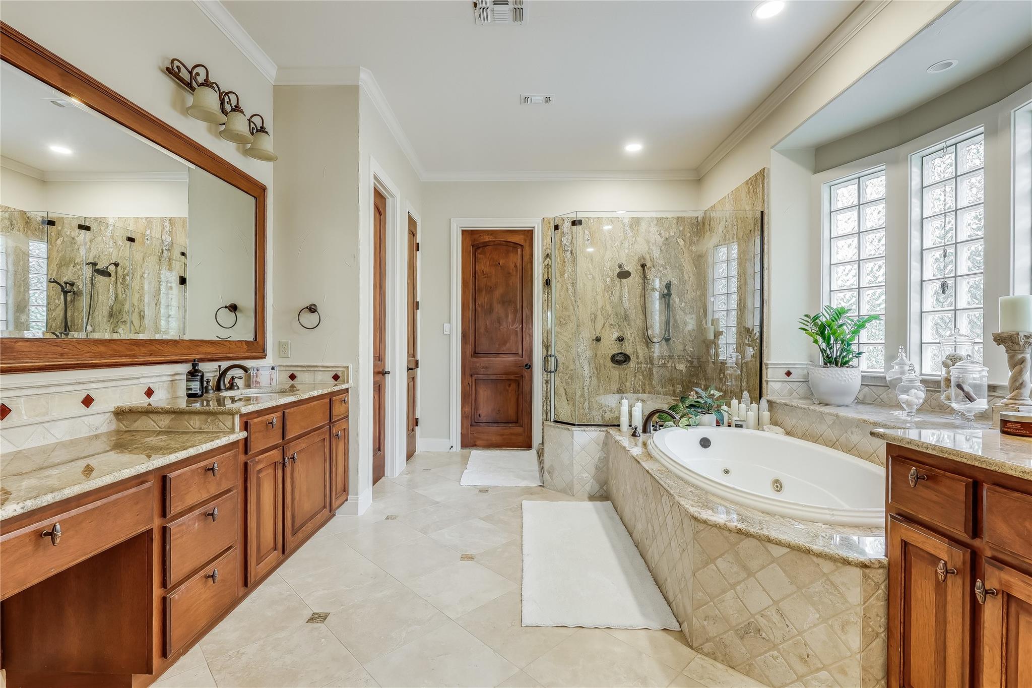 Retreat to the main-floor primary suite, where direct access to the covered patio awaits. A spacious walk-in closet and a sumptuous en-suite bathroom, featuring separate granite-topped vanities, an oversized frameless walk-in shower, and a deep jetted tub, offer a serene sanctuary.