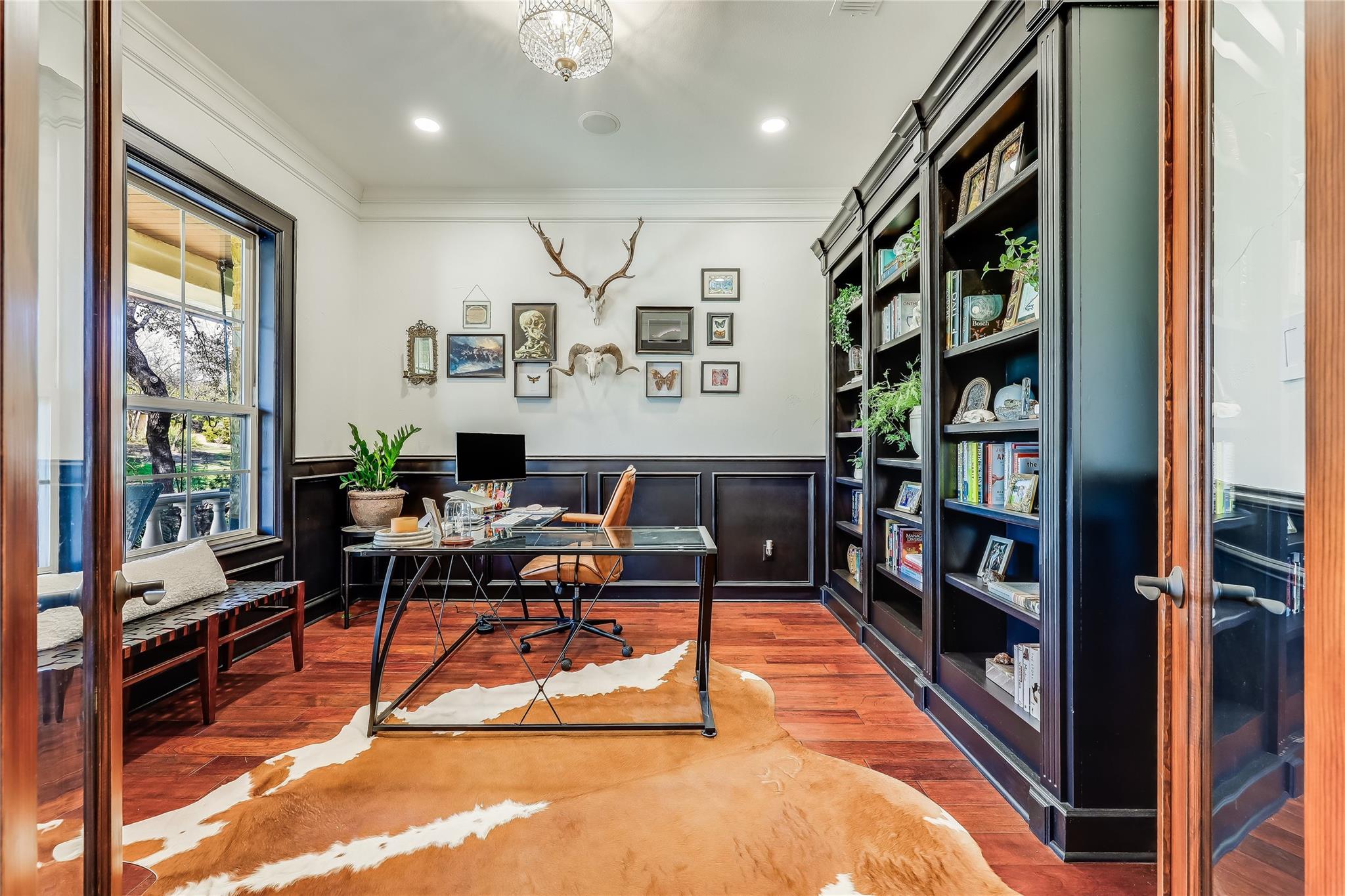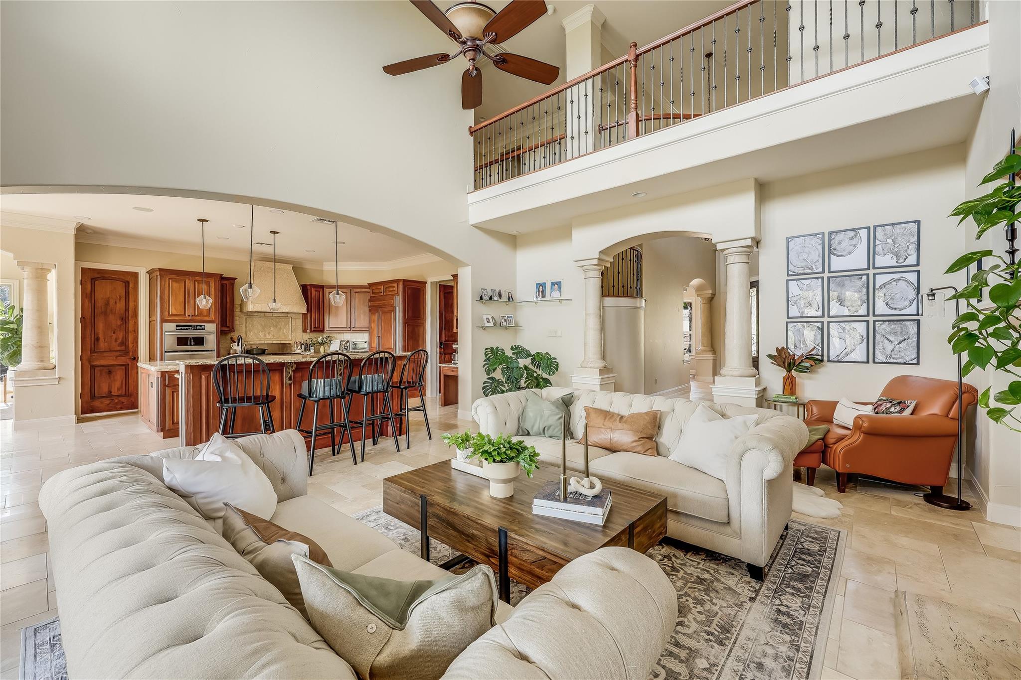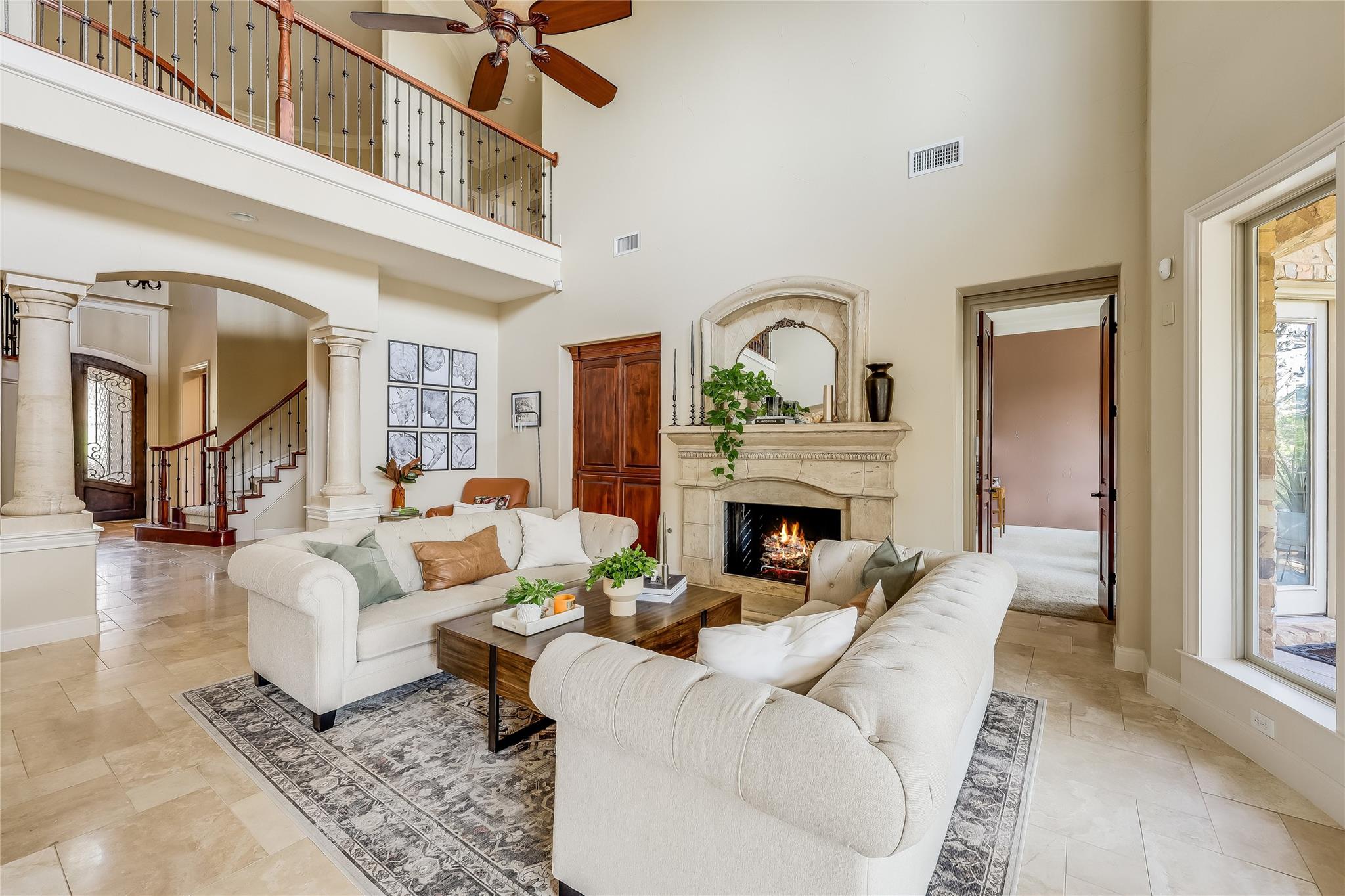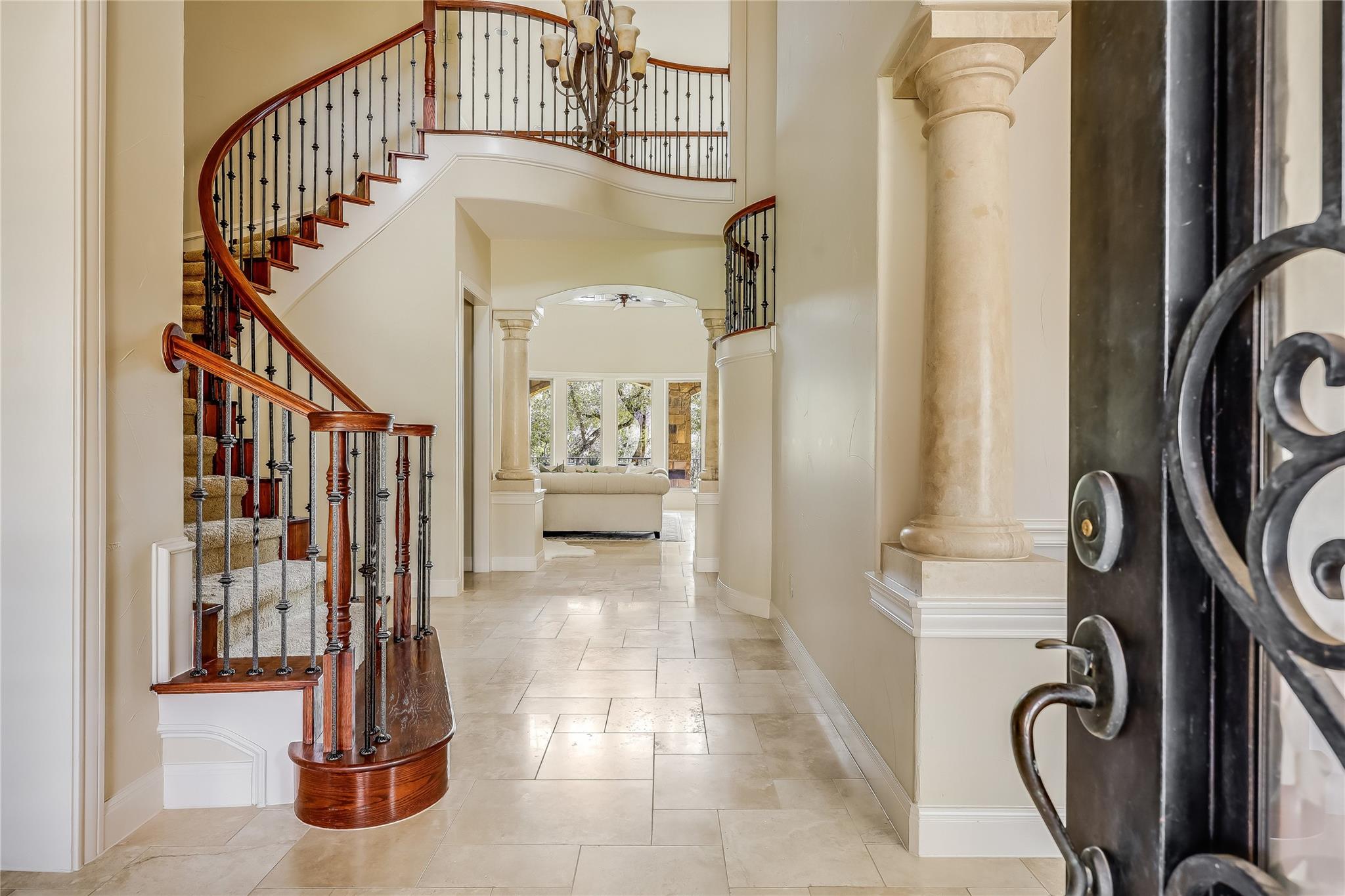 Step into the grand foyer adorned with luxurious travertine tile flooring, where dual spiral staircases and magnificent marble columns create a breathtaking first impression. Discover a refined home office, complete with custom bookcases, upscale moldings, and a secret door to a private closet.