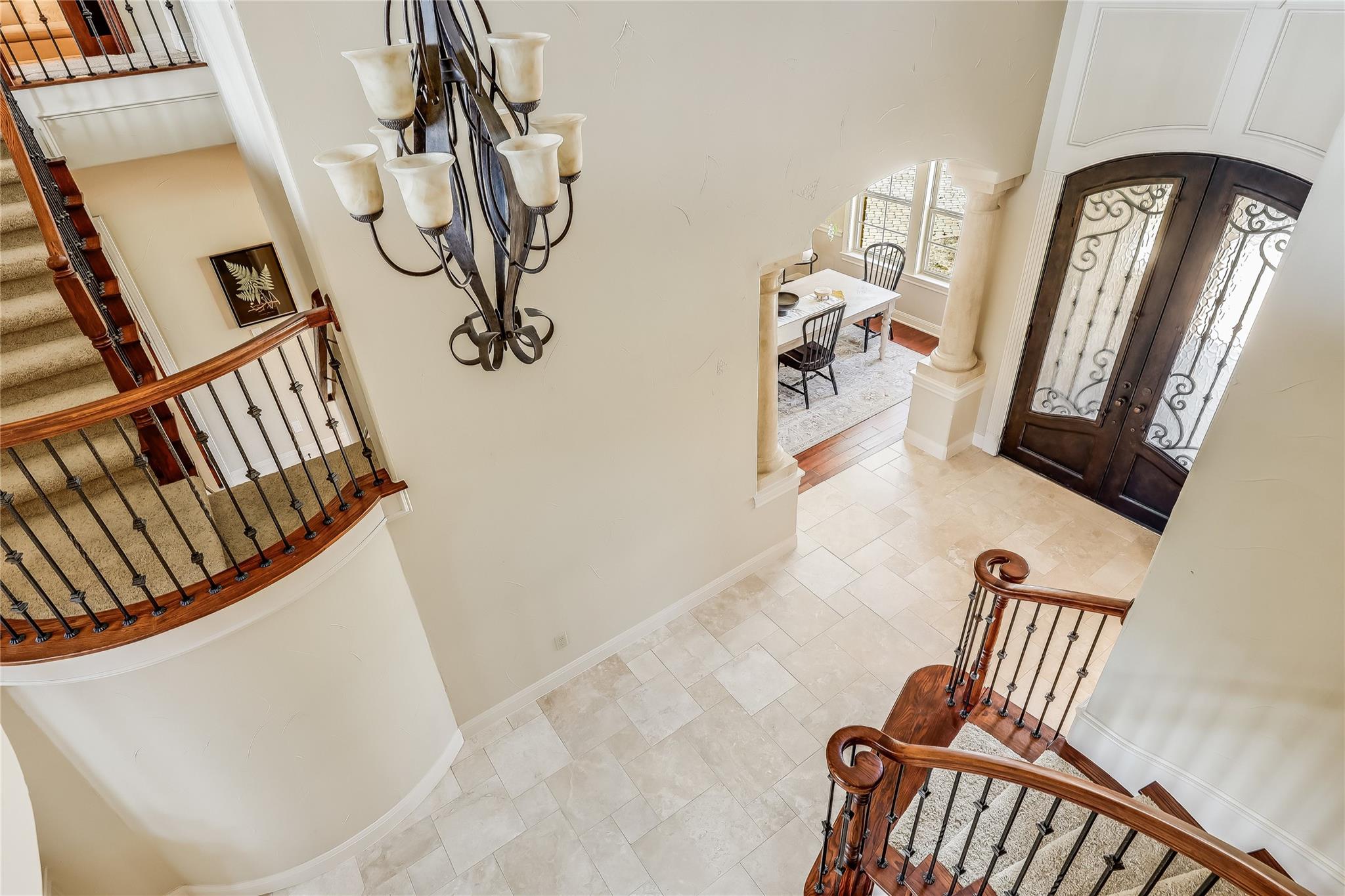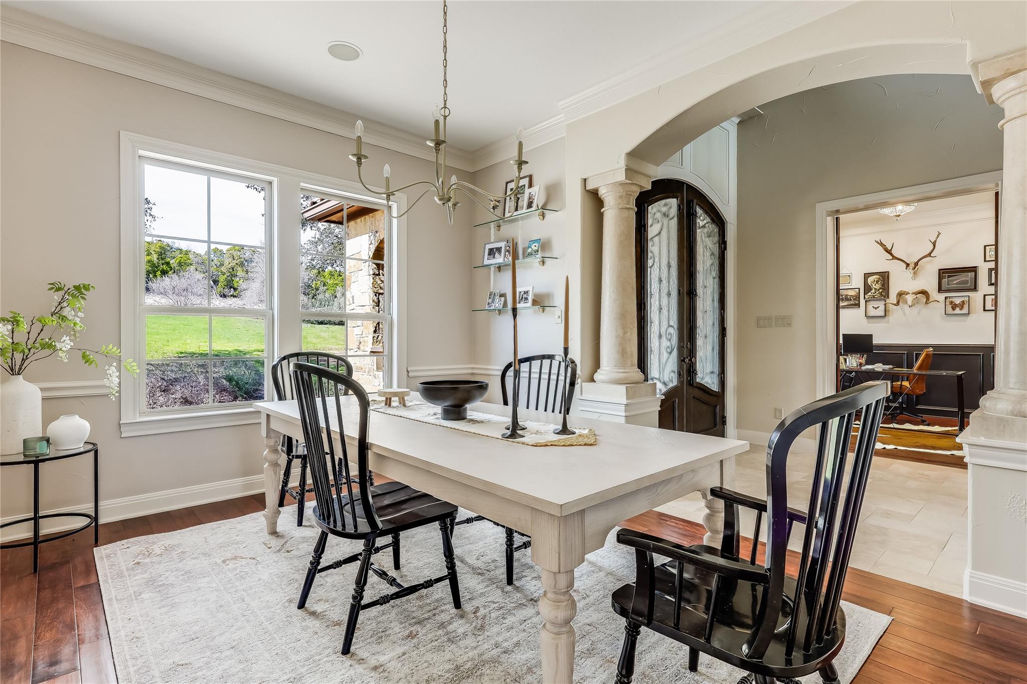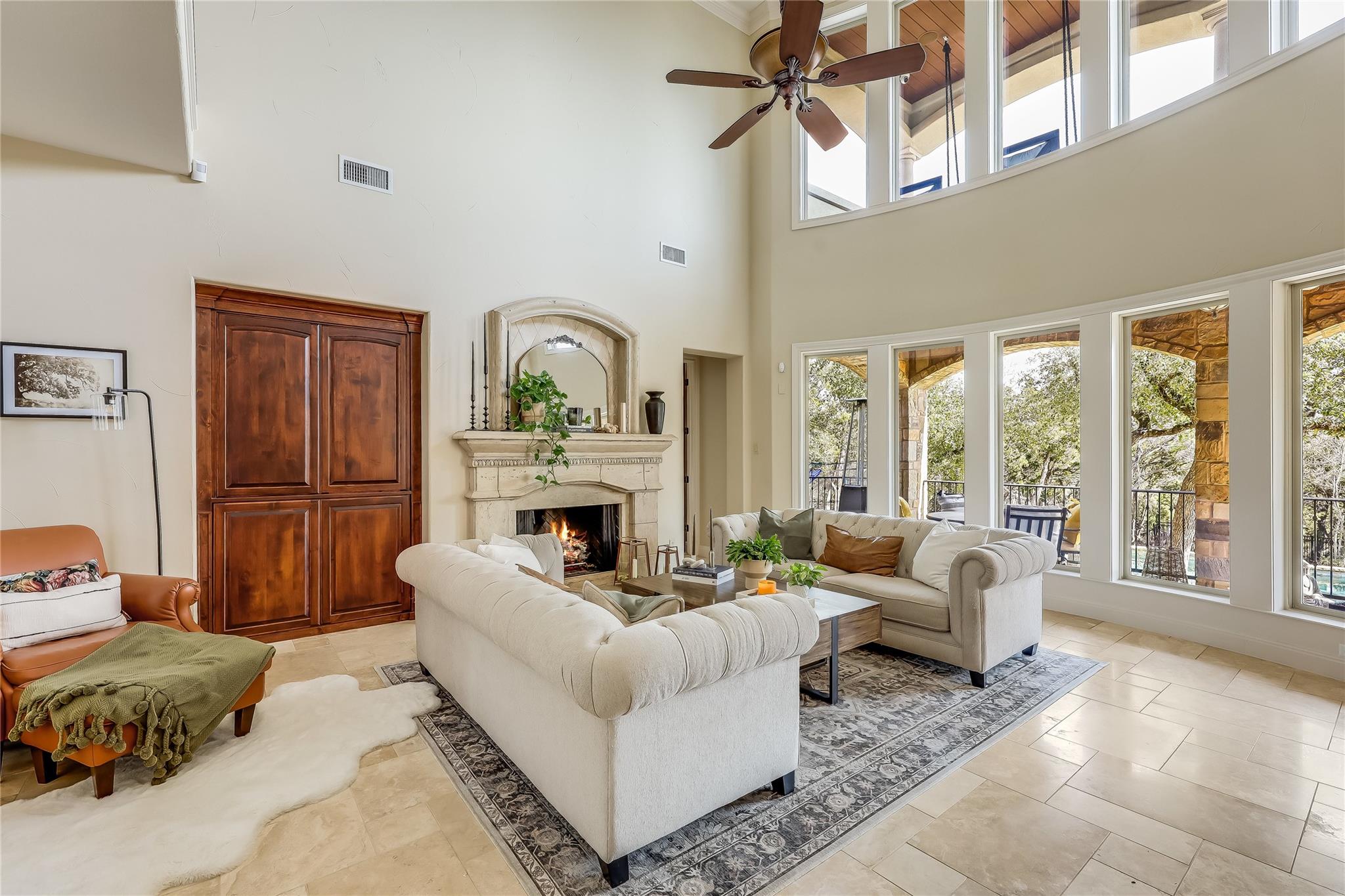 Step into the grand foyer adorned with luxurious travertine tile flooring, where dual spiral staircases and magnificent marble columns create a breathtaking first impression. Discover a refined home office, complete with custom bookcases, upscale moldings, and a secret door to a private closet.