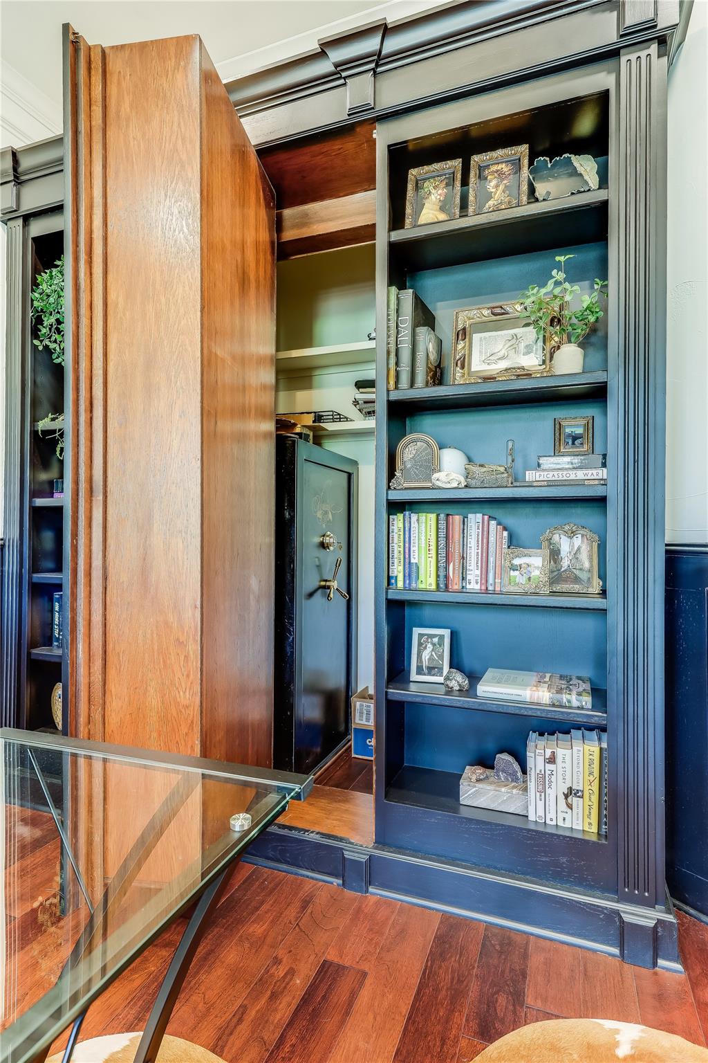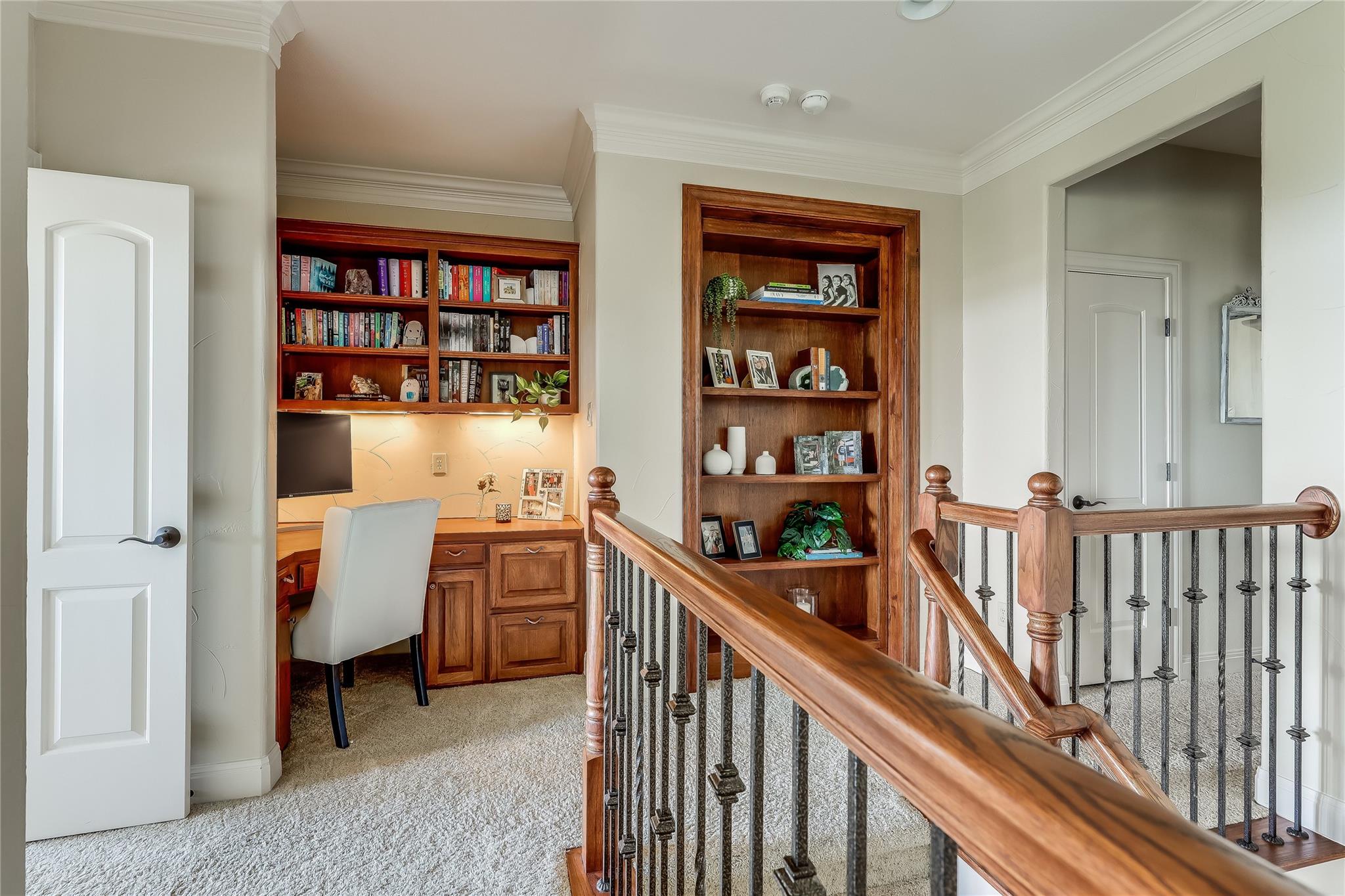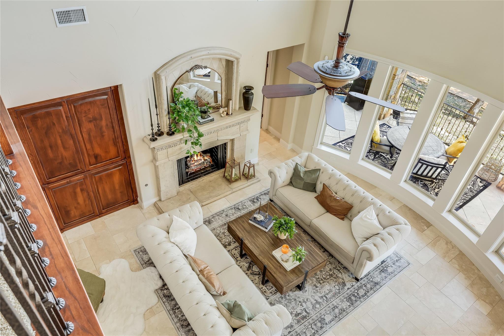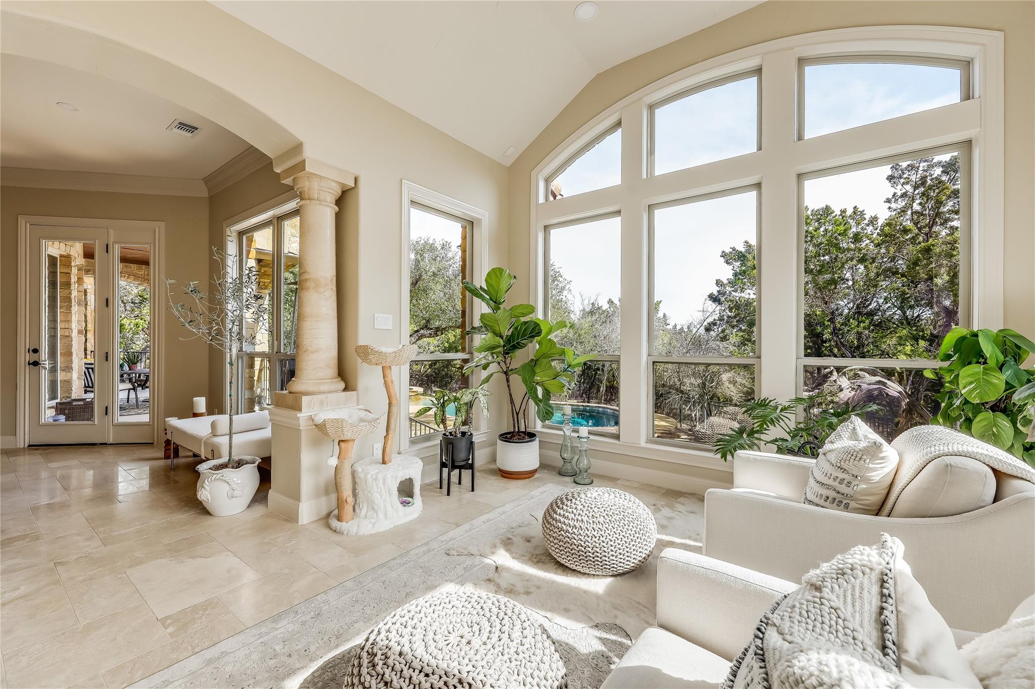 Step into the grand foyer adorned with luxurious travertine tile flooring, where dual spiral staircases and magnificent marble columns create a breathtaking first impression. Discover a refined home office, complete with custom bookcases, upscale moldings, and a secret door to a private closet.