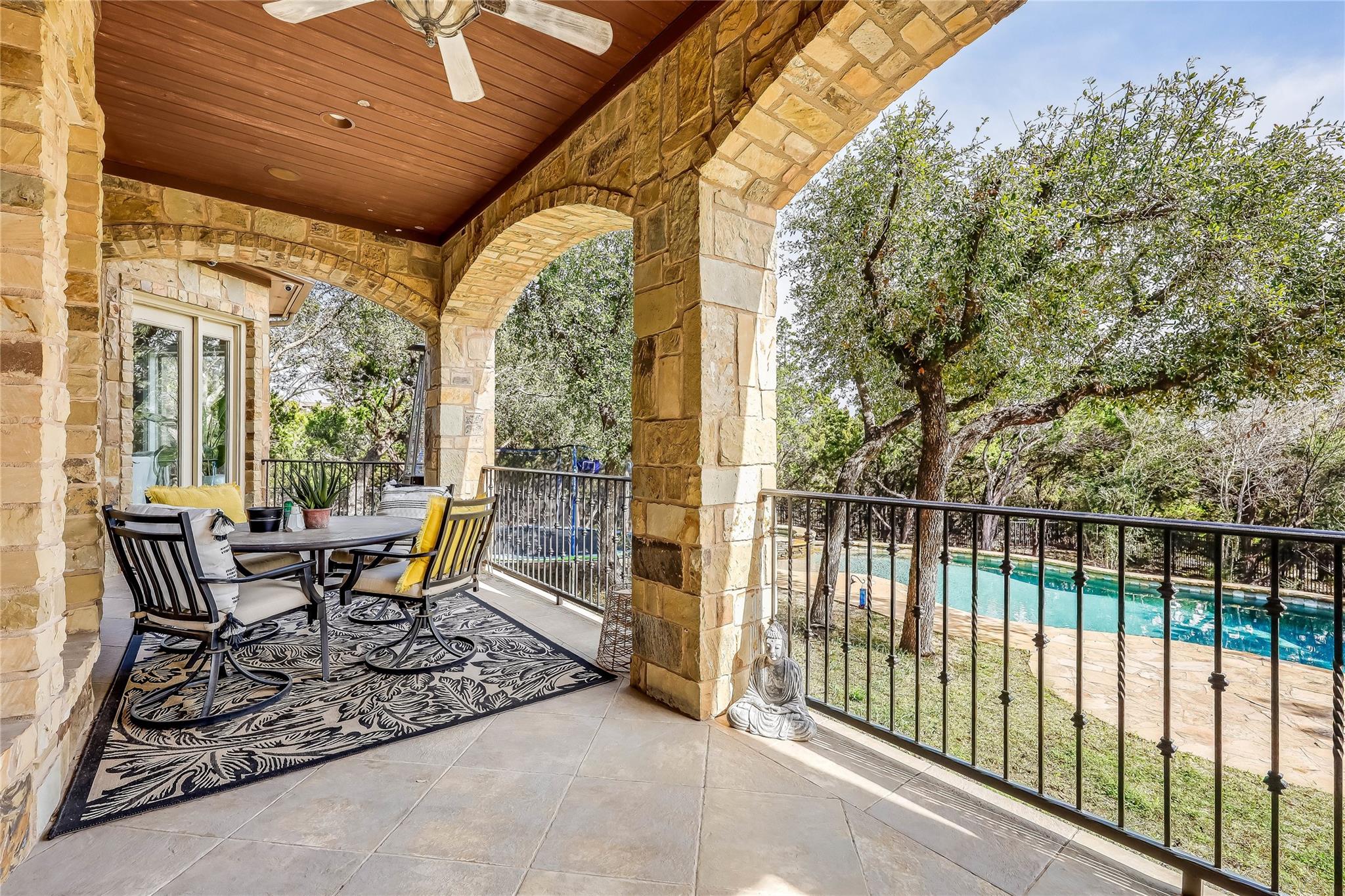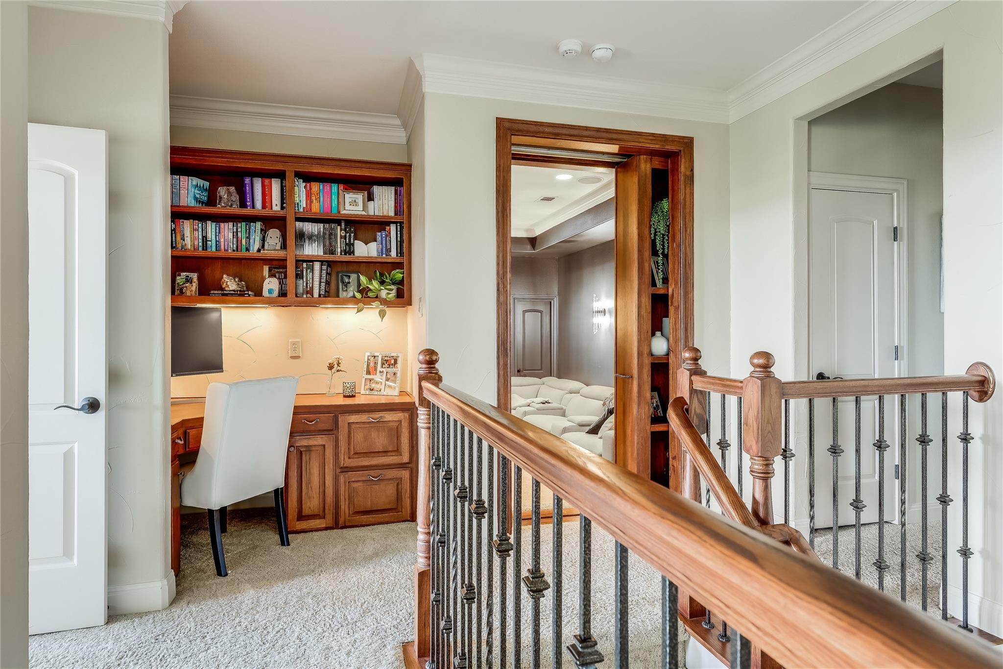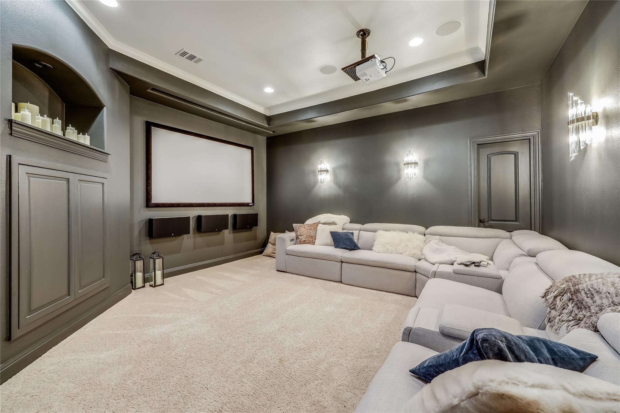 Upstairs, a built-in workstation and secret door reveal a private movie theater with custom lighting and projector/screen setup. Three bedrooms, two full guest bathrooms, and a sprawling game room, complete with a wet bar and access to the covered terrace, provide ample space for leisure and entertainment.