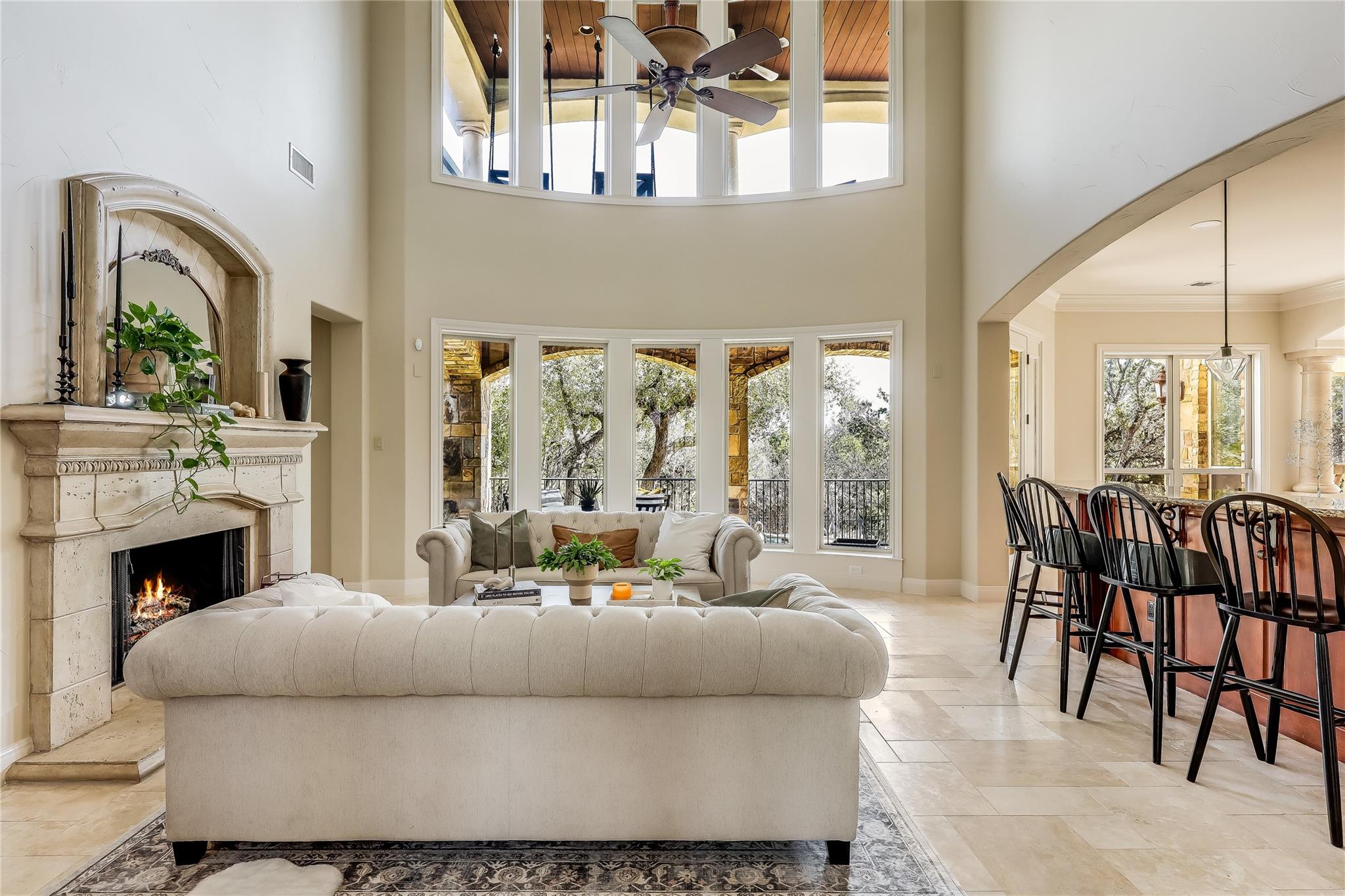 Entertain guests in the formal dining room, graced with a dazzling chandelier, crown molding, and rich hardwood floors. The living room epitomizes elegance with its soaring double-height ceiling, cascading windows, and bespoke gas log fireplace.