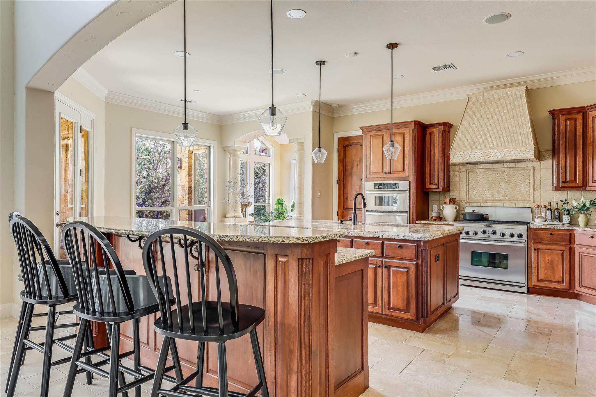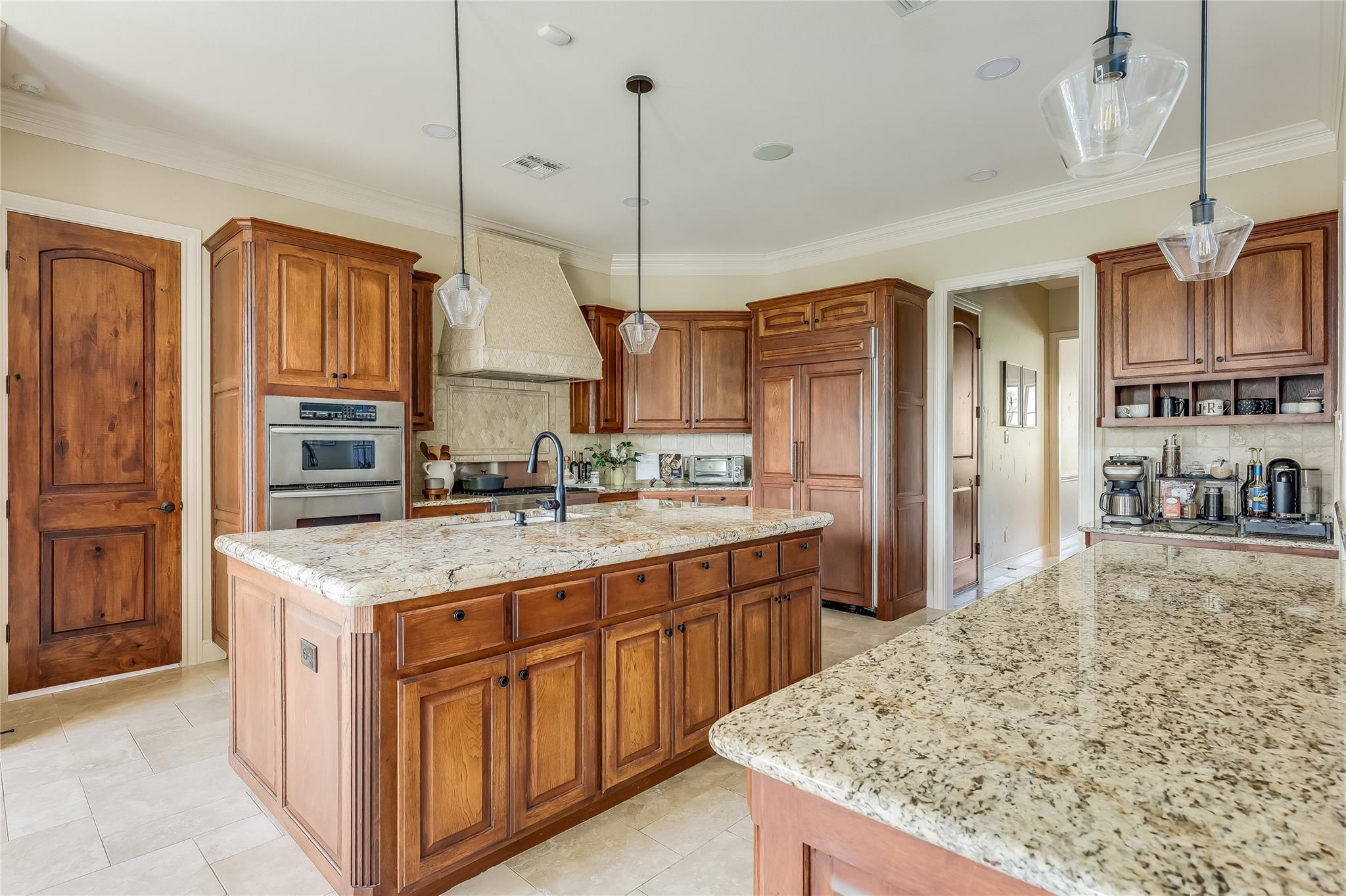 The gourmet kitchen beckons with double islands, custom cabinetry, granite countertops, and top-of-the-line stainless-steel appliances, including a commercial-grade gas range and built-in refrigerator matching the cabinetry.