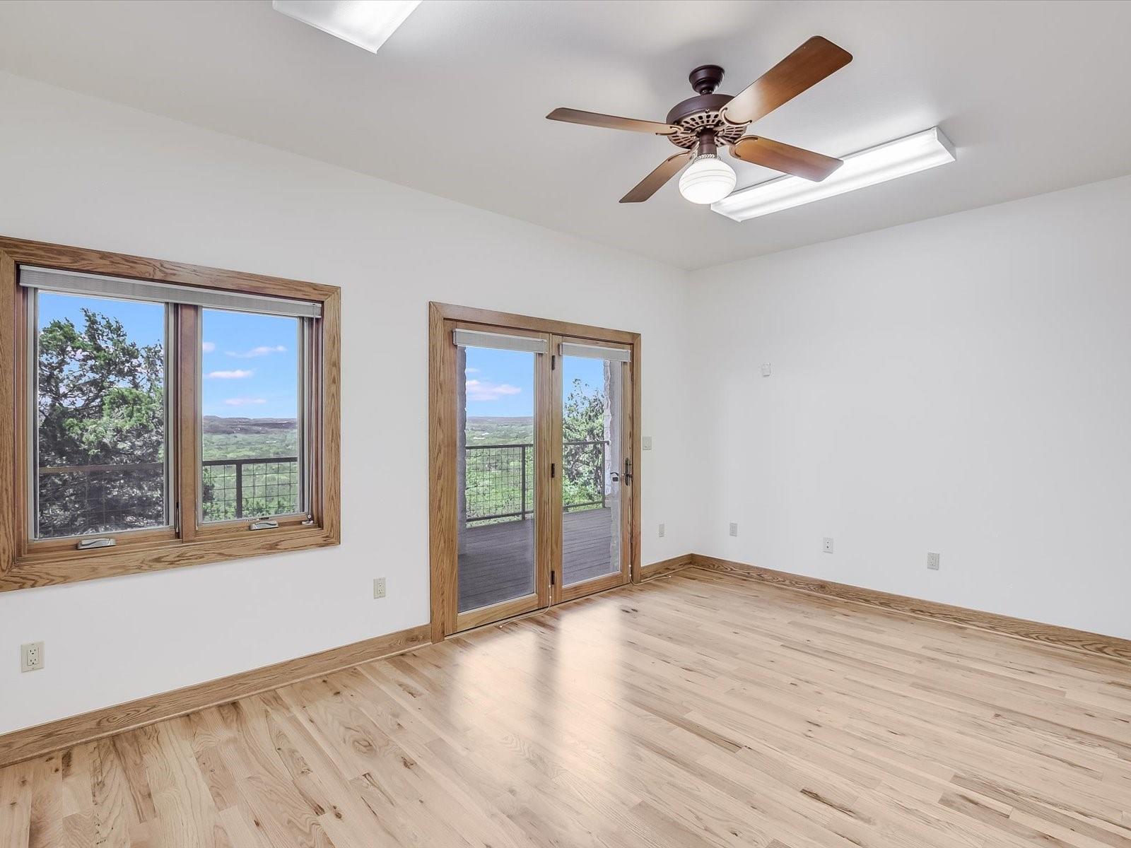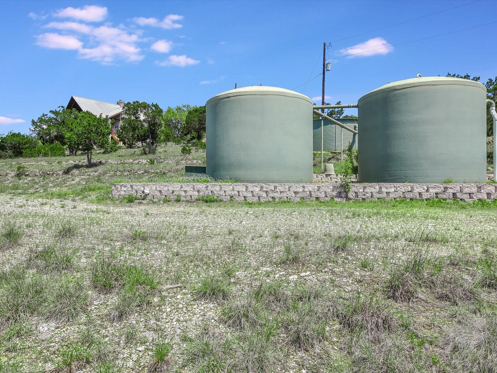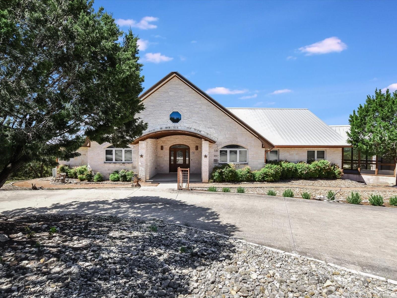 A STUNNING VIEW is among the many attributes this Hill Country home has to offer. An extremely well built house on a 16+ acre private hillside in a gated community of 4 homes. Situated just 3 miles from downtown Wimberley, but it feels like your way out in the hills. From the 600+ sq. ft. covered back porch you can see miles and miles of some of the most pristine valleys and peaks that the Hill Country has to offer. This 2986 sq.ft home has three spacious bedrooms and 2 full baths. All closets are large walk-ins and are vented via the HVAC system.The design elements are beautifully appointed with the best of everything: Oak wood is used as flooring, door/window trim and base. Vinyl clad, wooden casement, thermal pane windows and doors with blinds.The kitchen has high ceilings, lots of natural light, quartz countertops, stainless steel appliances and is open to the breakfast area and great room. There is an electronic security system in place. The limestone fireplace and chimney stretch from floor to ceiling in the spacious living area. The view can be appreciated throughout the house - through the wall of windows in the main living area, or from the privacy of the primary bedroom and secondary guest bedroom through the glass double doors and windows. The 77’ long covered porch with choice deck (synthetic) ”bare foot ready” flooring provides the perfect place to experience the wonderful view. The 2 story 3 car garage is +-1000 sq. ft., is well insulated, has a half bath and a 565 sq. ft. loft with a beautiful view from the 2nd story. A standing seam metal roof, white limestone and cement board with limestone columns comprise the exterior of both structures. A 40k gallon rainwater collection system provides filtered and purified water to the house as the primary water source, while the 700’ deep well delivers water to outside hydrants and the 6000 gallon reservoir that serves the fire suppression (sprinklers) system. Property may be sub-dividable, buyer to confirm.