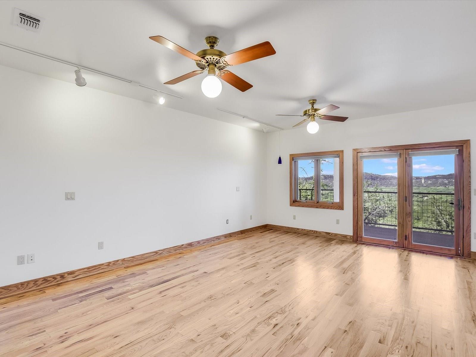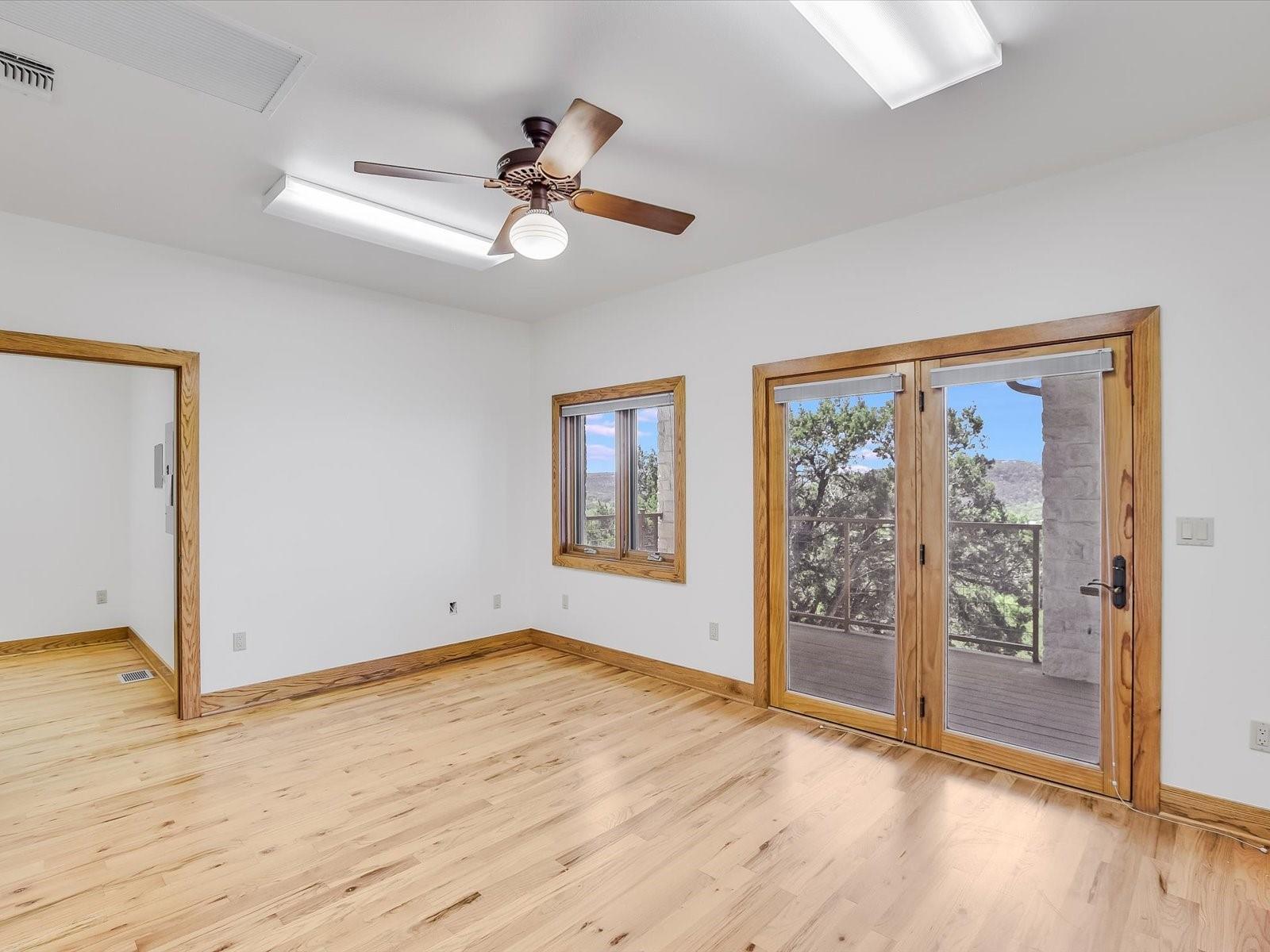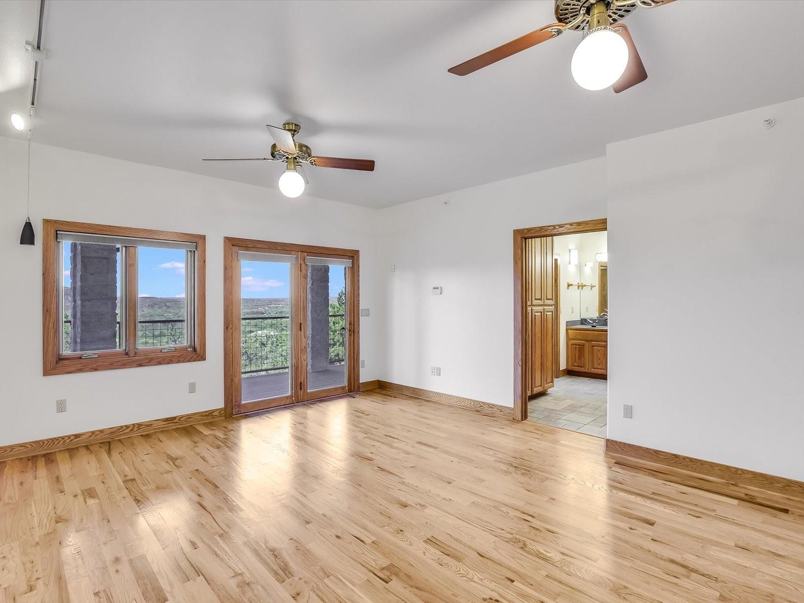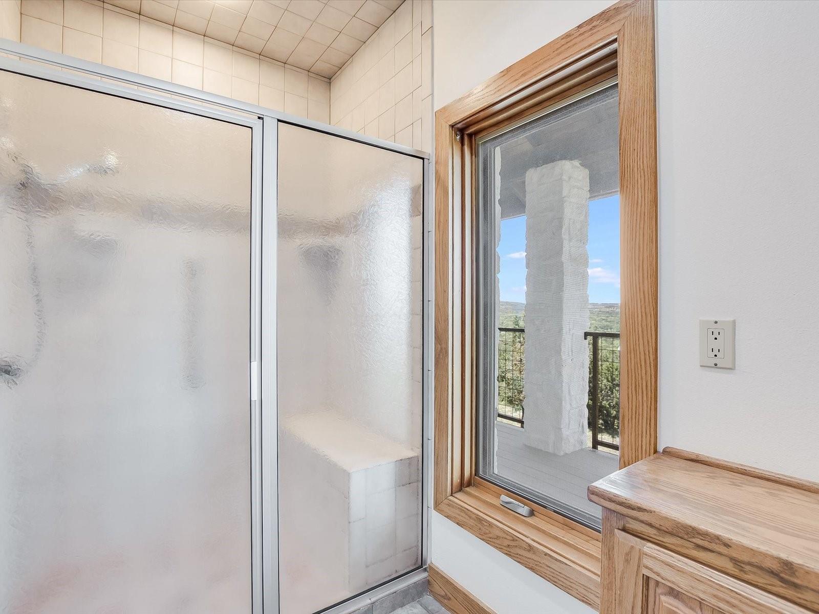 A STUNNING VIEW is among the many attributes this Hill Country home has to offer. An extremely well built house on a 16+ acre private hillside in a gated community of 4 homes. Situated just 3 miles from downtown Wimberley, but it feels like your way out in the hills. From the 600+ sq. ft. covered back porch you can see miles and miles of some of the most pristine valleys and peaks that the Hill Country has to offer. This 2986 sq.ft home has three spacious bedrooms and 2 full baths. All closets are large walk-ins and are vented via the HVAC system.The design elements are beautifully appointed with the best of everything: Oak wood is used as flooring, door/window trim and base. Vinyl clad, wooden casement, thermal pane windows and doors with blinds.The kitchen has high ceilings, lots of natural light, quartz countertops, stainless steel appliances and is open to the breakfast area and great room. There is an electronic security system in place. The limestone fireplace and chimney stretch from floor to ceiling in the spacious living area. The view can be appreciated throughout the house - through the wall of windows in the main living area, or from the privacy of the primary bedroom and secondary guest bedroom through the glass double doors and windows. The 77’ long covered porch with choice deck (synthetic) ”bare foot ready” flooring provides the perfect place to experience the wonderful view. The 2 story 3 car garage is +-1000 sq. ft., is well insulated, has a half bath and a 565 sq. ft. loft with a beautiful view from the 2nd story. A standing seam metal roof, white limestone and cement board with limestone columns comprise the exterior of both structures. A 40k gallon rainwater collection system provides filtered and purified water to the house as the primary water source, while the 700’ deep well delivers water to outside hydrants and the 6000 gallon reservoir that serves the fire suppression (sprinklers) system. Property may be sub-dividable, buyer to confirm.
