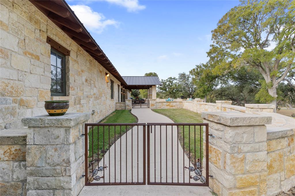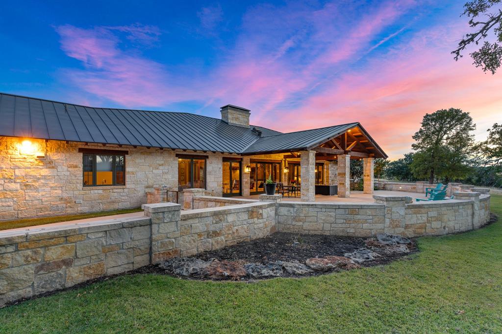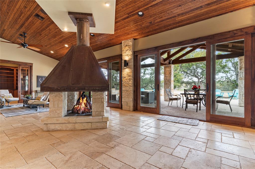 Located in the Heart of Hill Country, this beautiful, this Live water ranch offers the best of both worlds by providing a serene country lifestyle without sacrificing modern amenities & conveniences, where you can enjoy water activities such as swimming & kayaking, or simply unwind by the private water's edge, all while having access to high-speed internet, comfortable accommodations, and nearby shopping & dining options. This exquisite 2013 White Rock House is nestled on 28acres of lush grass, surrounded by tall oak canopies, exotic wildlife, & beautiful creek bluffs, with the added charm of being situated in a tranquil creek bend & enveloped by spring-fed Stevens Creek, supported by a concrete dam that ensures a year-round live creek and abundant wildlife in the area. The MOST unique feature of this home is it's indoor/outdoor firepit living/entertainment room, designed with every season in mind and set to impress. Best of all, by closing the interior sliding doors & opening the wall of glass exterior doors, this room can open to the outside while being closed off from remaining house. Game House features a 1/2bath, a living area, and an area for entertaining with a built-in kegerator, a cedar bar top with storage, and plenty of space for games no matter the age. The Game House can be used as a 2nd living quarters, a Mancave/SheShed, teens hangout, &/or late-night games away from the main house. 3rd Improvement: Top-of-the-line 90x74’ Steel Building features; Built-in HVAC living quarters with kitchenette & full bath, commercial grade steel framing, fully insulated, 5 12x10 garage doors, electrical & water. Adds 14 covered parking spots to keep all equipment, RV, & toys protected. Maverick: Clubhouse, Resort Pool, Several Fire Pits, Green Space, Blue Hole, Sports Courts, Hiking Trails, Overlook, Ranging Exotics, On-Site Groundskeeper, High-Fenced & Gated. Also Participates in Dark Skies Program for ultimate stargazing experience. 95%Furnished=Convey. SEE VIDEO