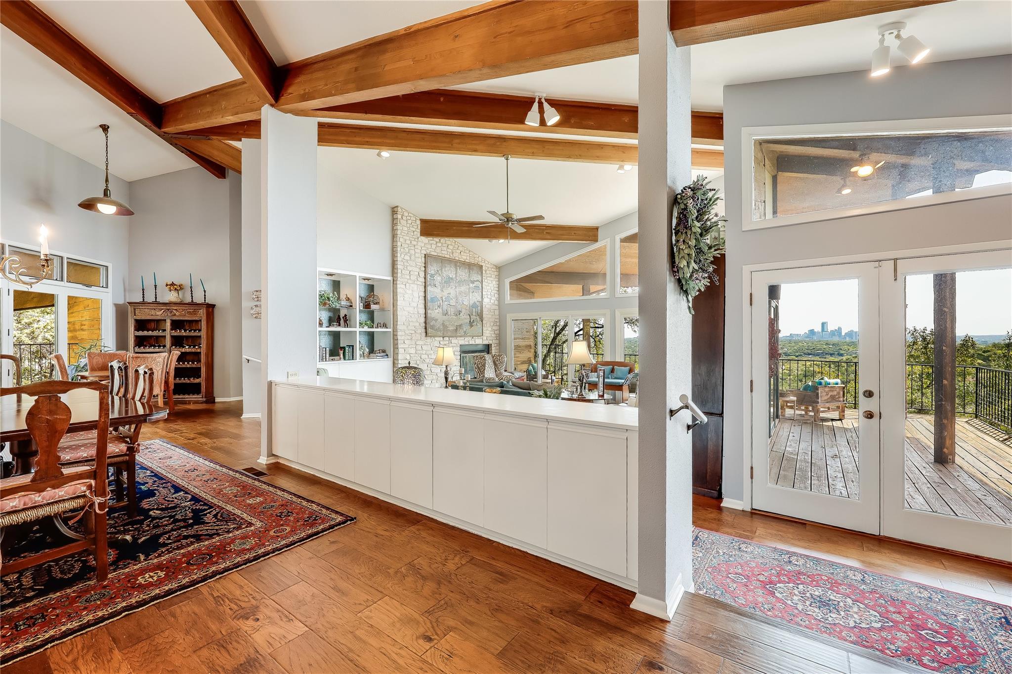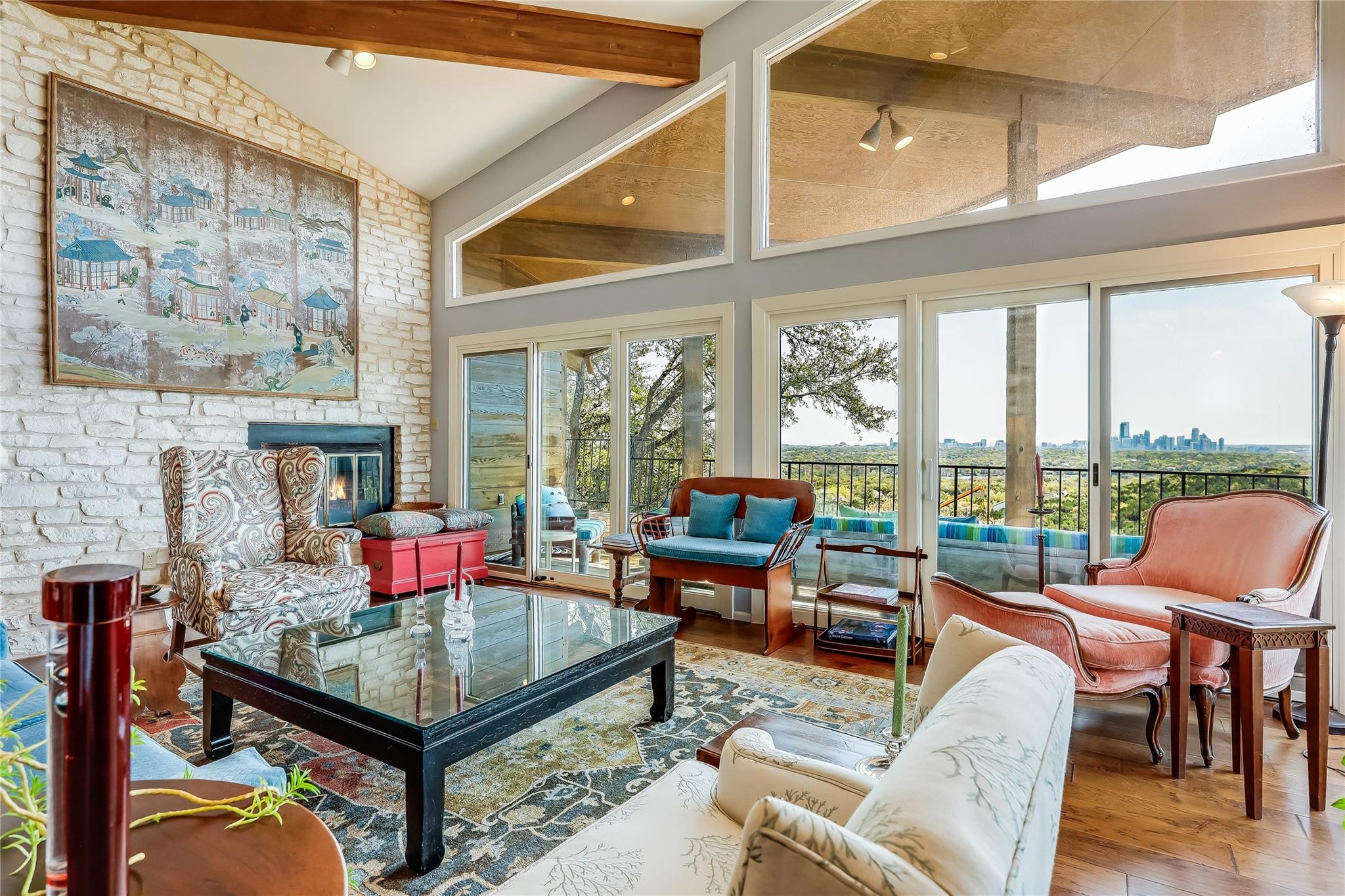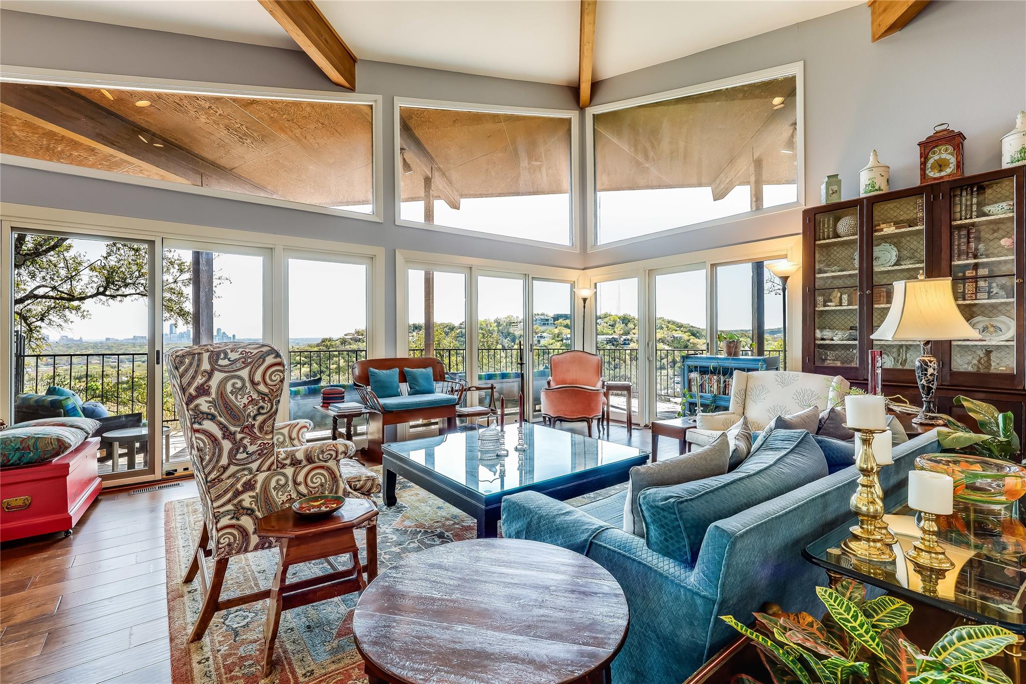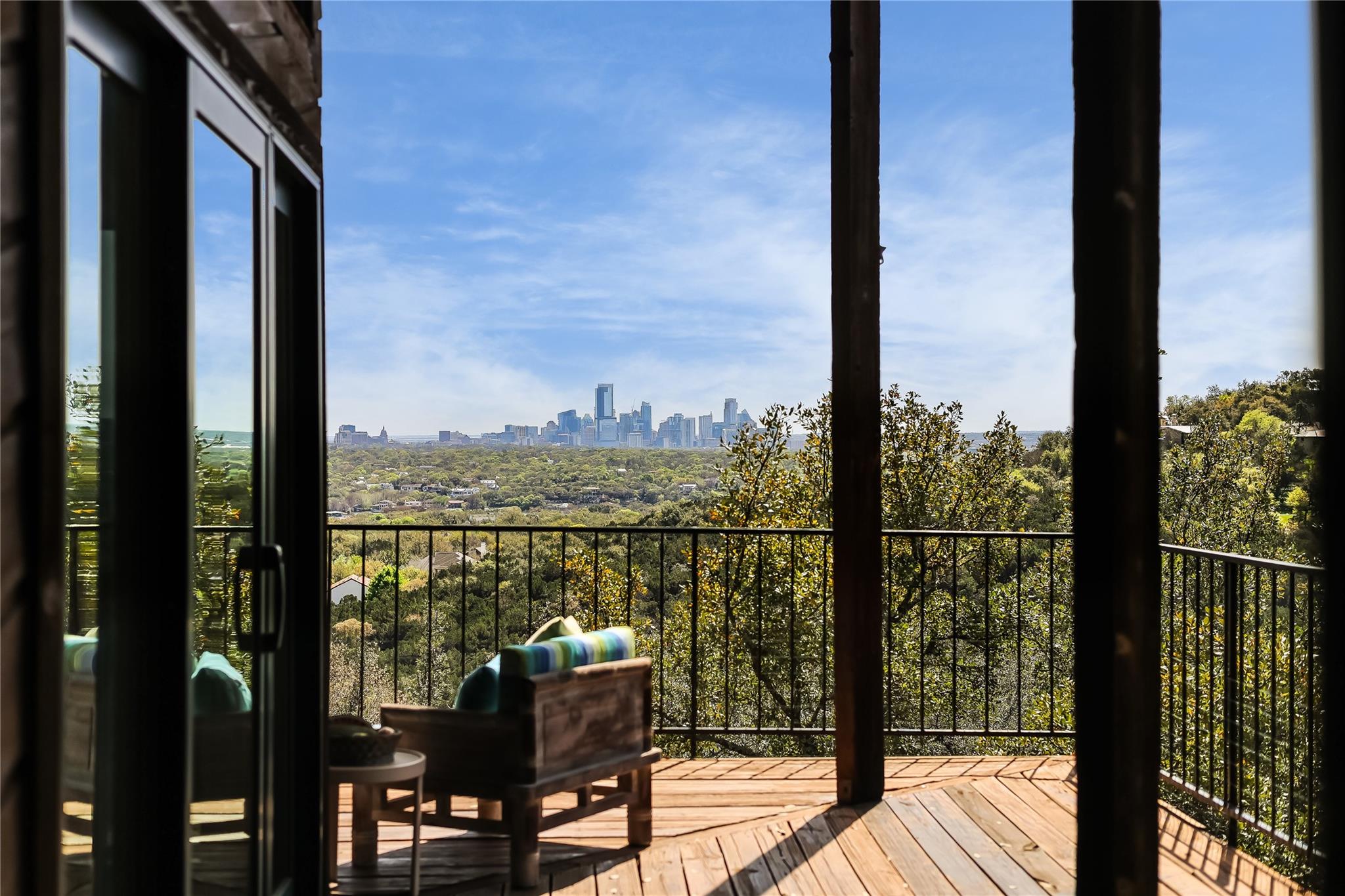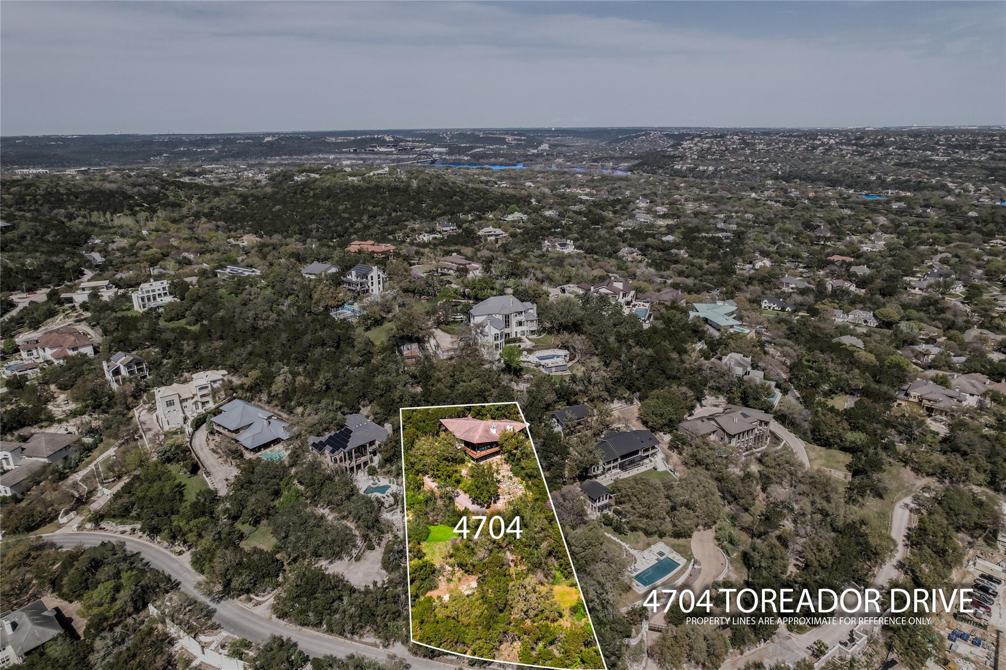 Introducing 4704 Toreador Drive: an emblem of mid-century elegance perched with an unrivaled 220-degree panorama that encompasses the dynamic skyline of downtown Austin, the iconic University of Texas Tower, and the majestic State Capitol, not to mention select views of Lake Austin. Nestled on a serene 1.02-acre expanse, this home is ensconced amidst a canopy of mature oaks, offering both seclusion and natural splendor. The living area emerges as the heart of the residence, where expansive floor-to-ceiling windows not only flood the space with sunlight but also frame the exquisite vistas, blending relaxation with refined entertainment. This residence is ingeniously designed to accommodate multi-generational living, highlighted by a secluded Primary Suite that features lofty ceilings, awe-inspiring views with private access to the front balcony, and a well appointed primary bathroom with two walk-in closets. The suite’s balcony is a sanctuary for witnessing the mesmerizing sunsets that paint the Austin skyline. On the main level, a dedicated office space, boasting the same breathtaking views, provides flexibility for conversion into a nursery or guest room, reflecting the home’s adaptability to its residents’ evolving needs. The dining area, with its direct views of downtown, is easily accessible from the butler’s pantry and kitchen, crafting an ideal environment for social gatherings. The lower level unfolds as a distinct living quarter with a private entrance, perfectly suited for guests, extended family living, or as a lucrative short-term rental option. This level’s thoughtfully planned plumbing infrastructure anticipates the easy addition of a kitchenette. Moreover, the expansive lower living room adapts to various uses, from a fitness area to a creative workshop. Residing within the bounds of the esteemed Eanes Independent School District, 4704 Toreador is zoned to top ranked schools in both academics and sports.