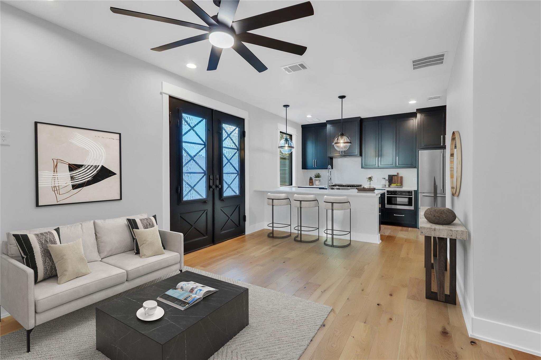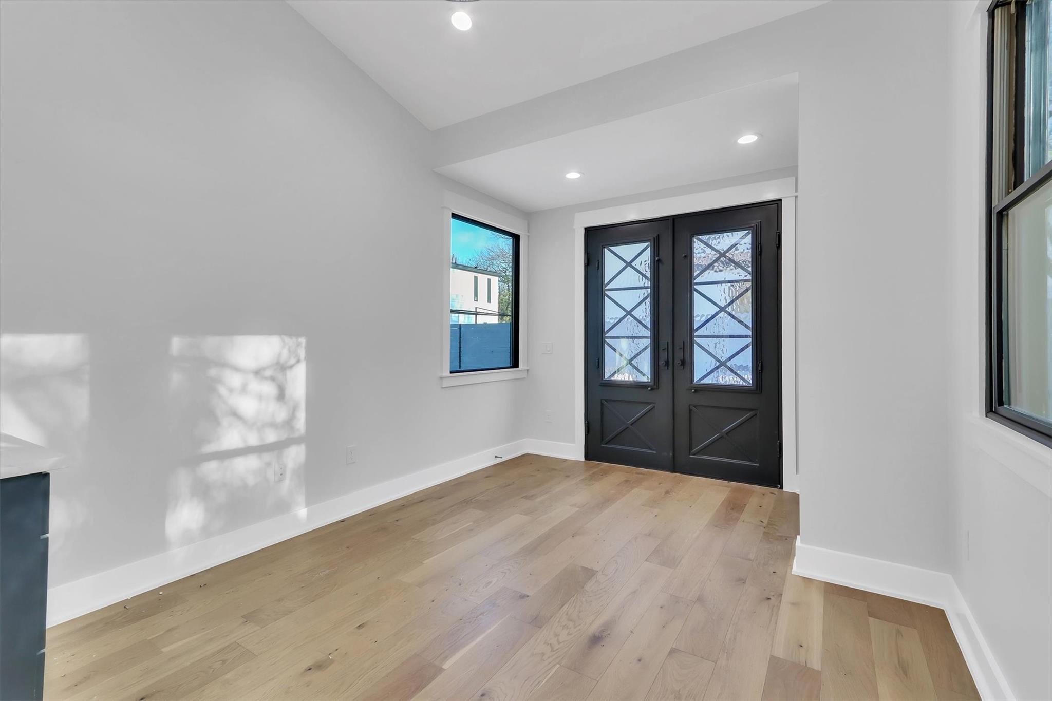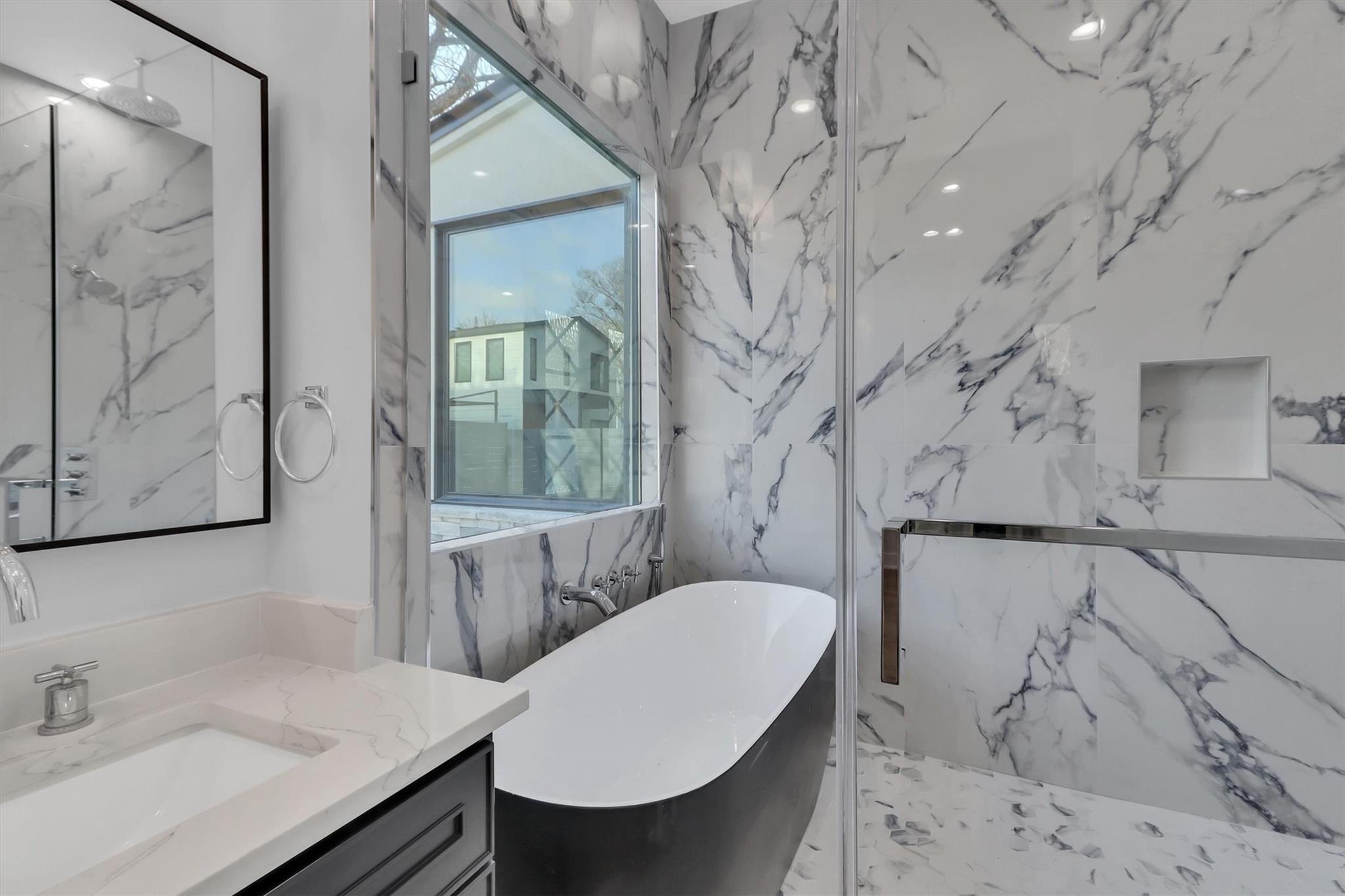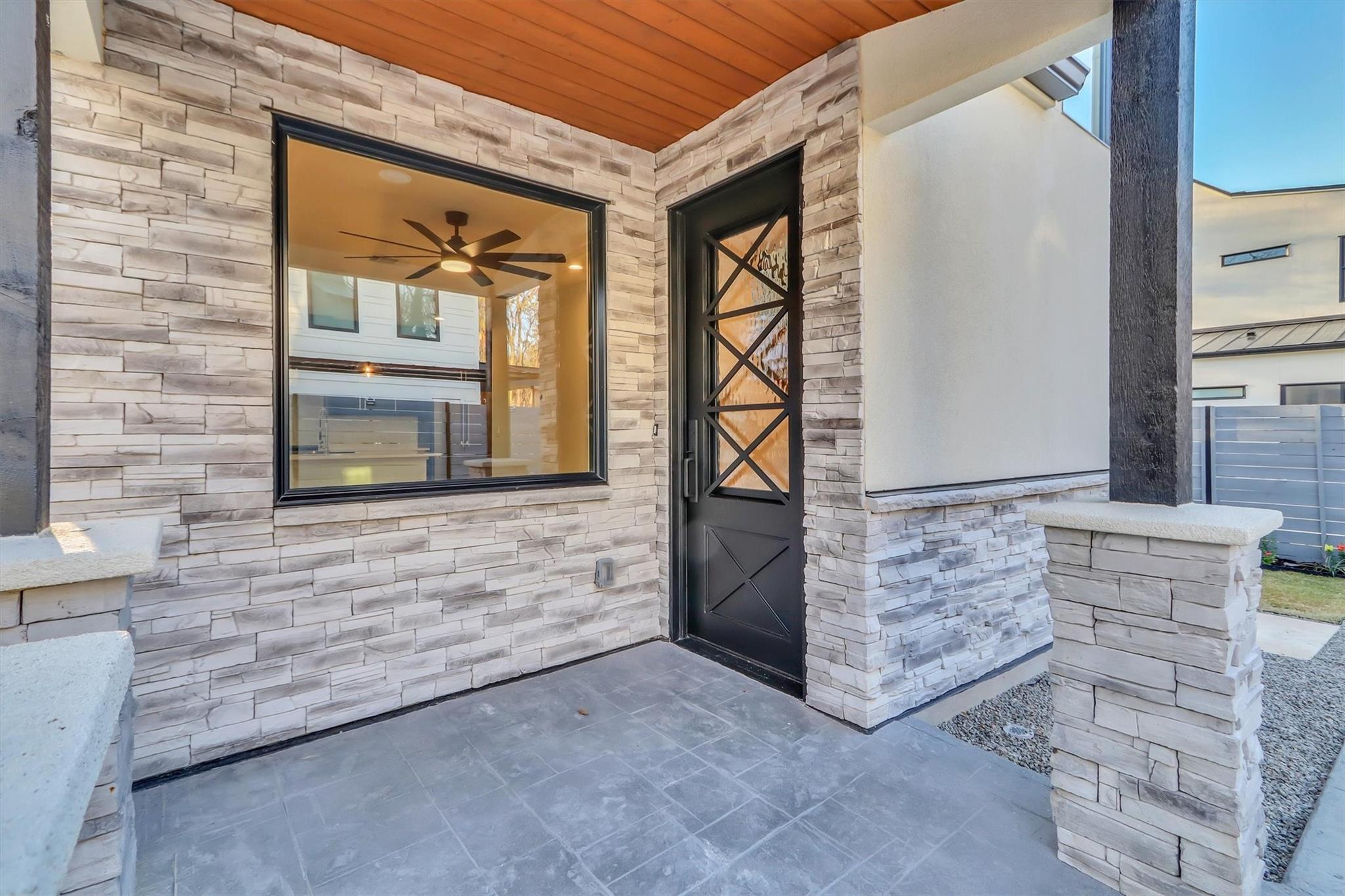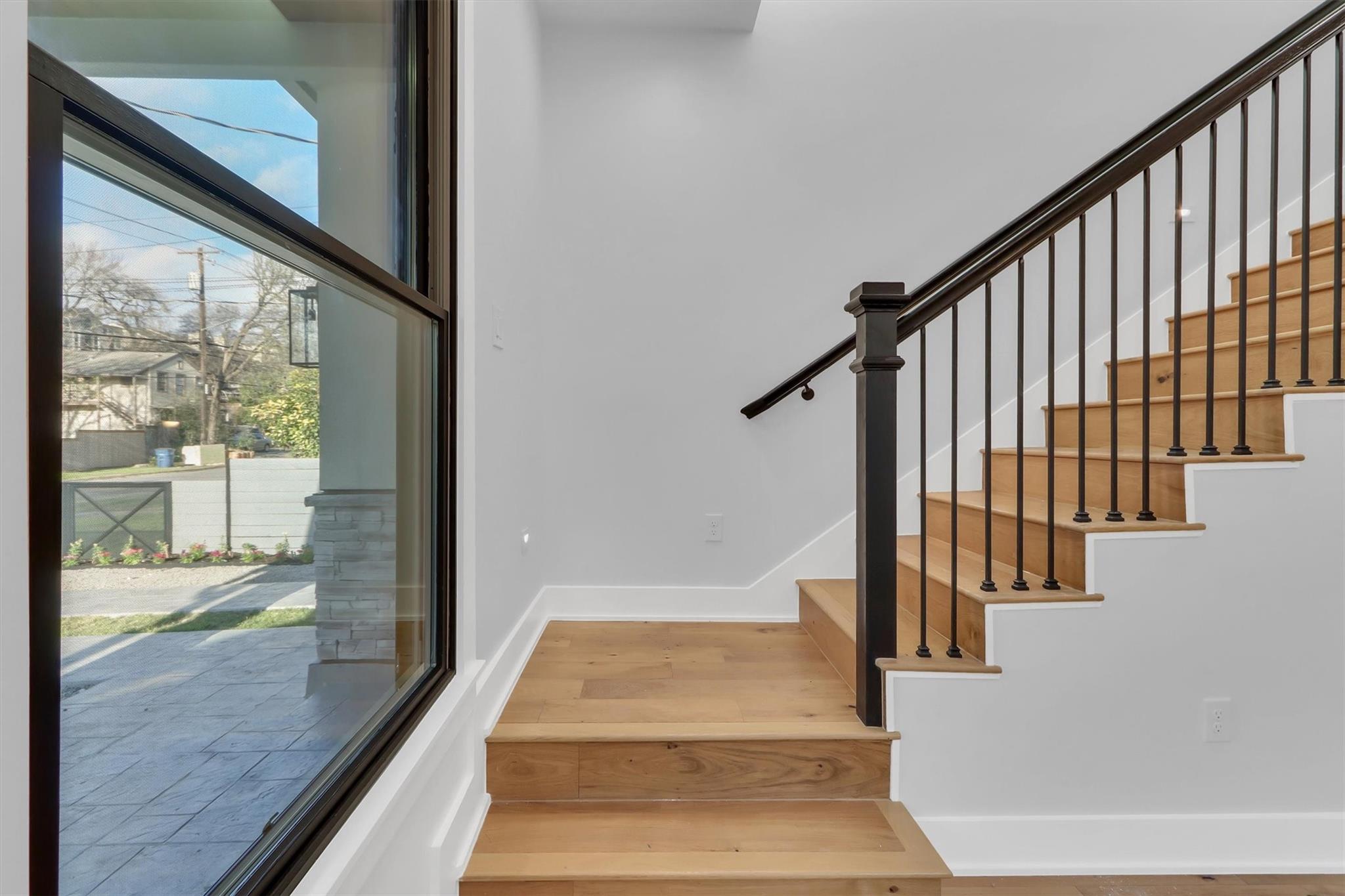 The wonderfully crafted home in the heart of Austin’s North Campus immediately impresses with an alluring great room that overlooks a true chefs kitchen, a bright dining area, and luxury outdoor living space. Complementing the well-designed kitchen is an oversized center island with a breakfast bar, Waterfall counters with expansive cabinet space, Single deep farm house sink and built in appliances. 48 " gas cooktop with 8 burners, double over with European French door. Be enveloped in the warm richness of the wood floors and the deep color of the custom cabinetry. Feel the craftsmenship of the customforged exterior metal doors every time you enter your home. The main floor also boasts a secondary living area perfect for entertaining friends with access to the landscaped back yard and private pool. The marvelous primary bedroom suite is secluded on the main floor, complete with a stunning walk-in closet and a serene primary bath with dual-sink vanity, a large soaking tub, a luxe shower, and private backyard access. Upstairs you will find an additional Bedroom suite with private bath and secondary bedrooms 3 and 4 offering sizable closets and share a full hall bath. Upstairs you will also find an additional living space that can be upgraded to a home office with lots of natural light. A full laundry room completes the upstairs with lots of built-in cabinetry, room for a full size washer and dryer along with a laundry sink. Guest house is in rear with own alley access 2br/2ba, full kitchen, laundry, living room with an expansive roof top deck. This home is fully gated and landscaped to enjoy your homes privacy while still being able to feel part of this vibrant neighborhood and interact with your neighbors. Walk to Civil Goat for your morning coffee and partake in Austin’s BBQ scene just down the street at Black’s Barbecue. Ask about Buyers closing cost incentive package. Deed Restrictions allow for short term rental if desired for the Guest House