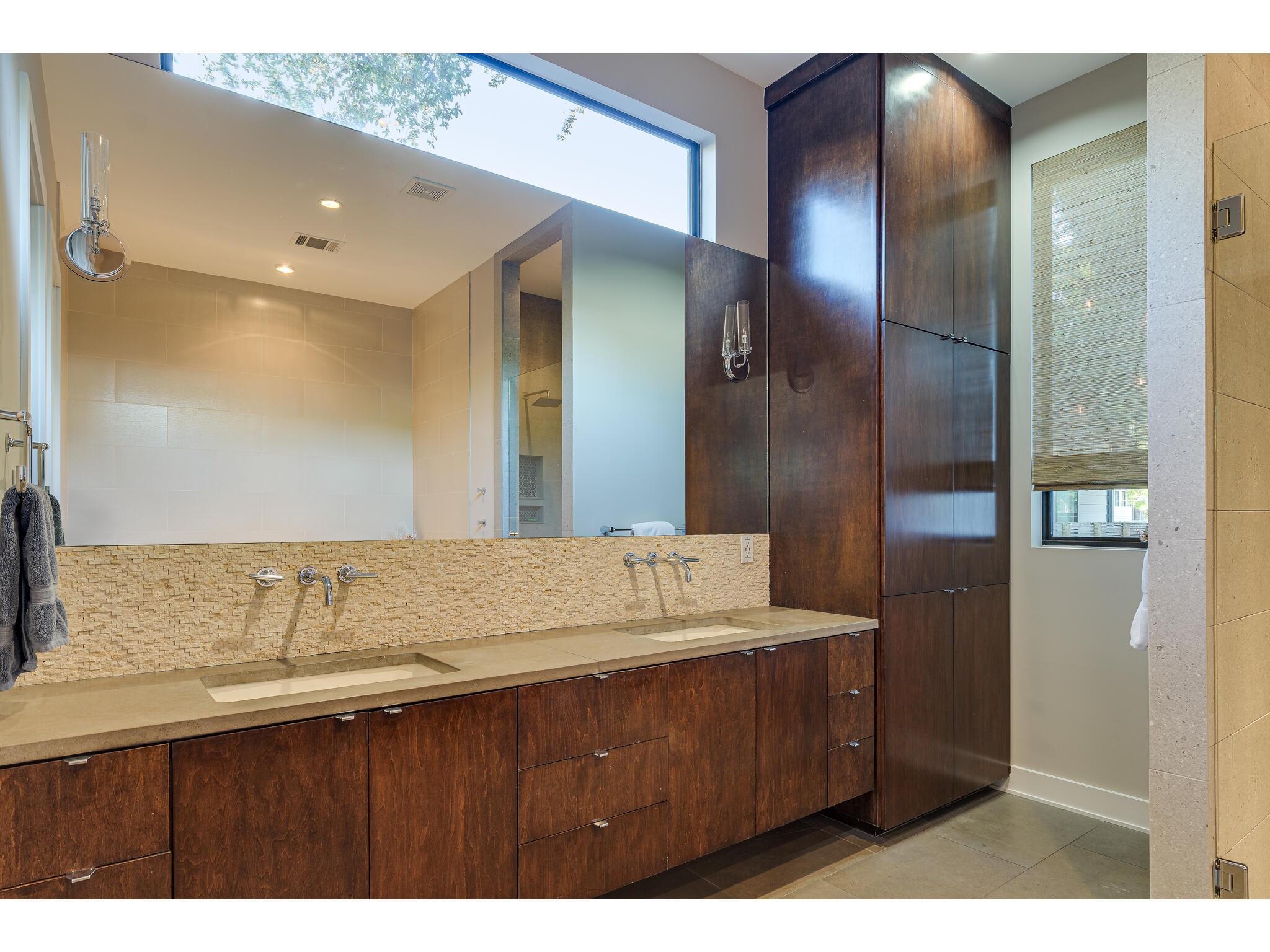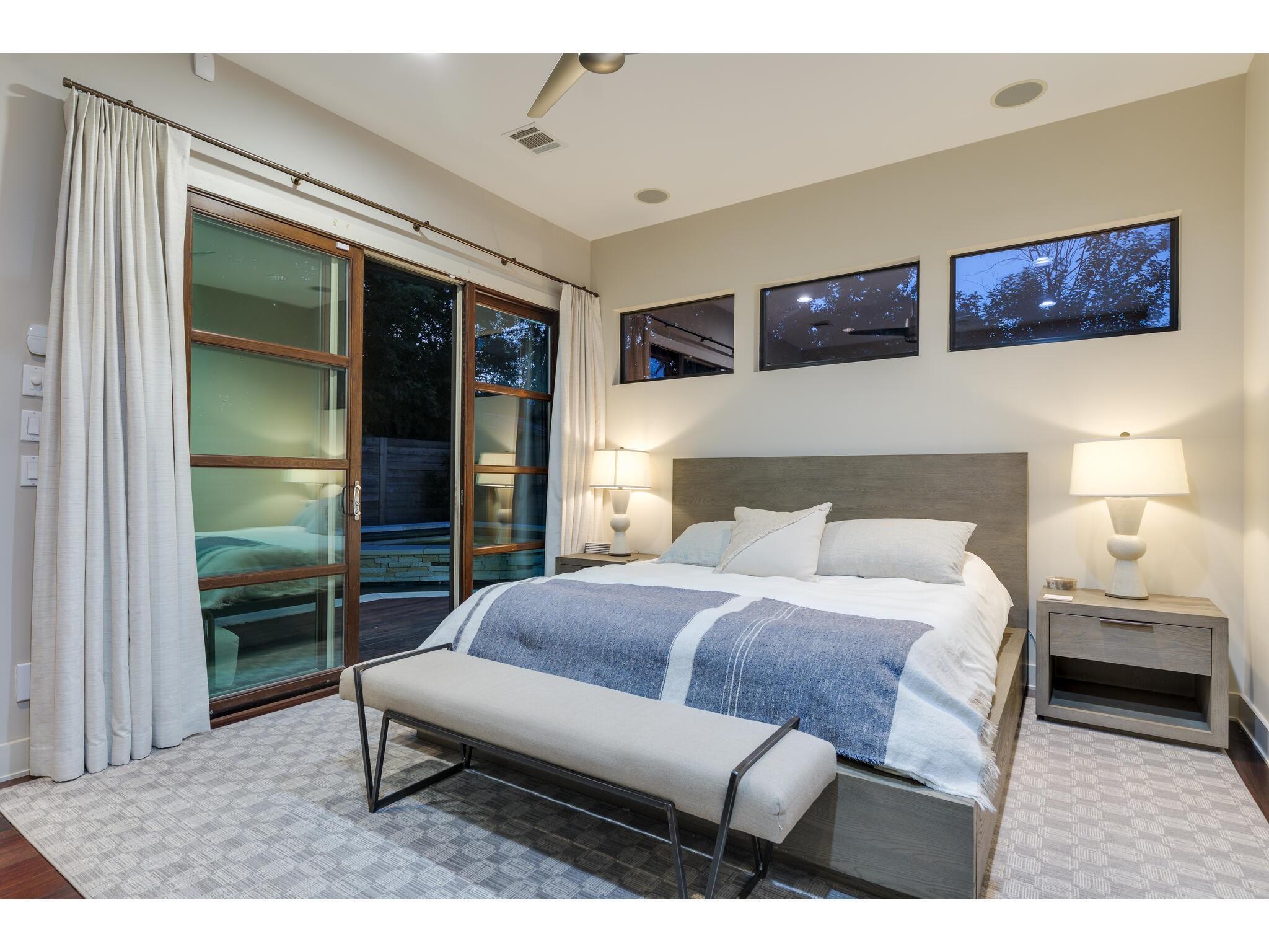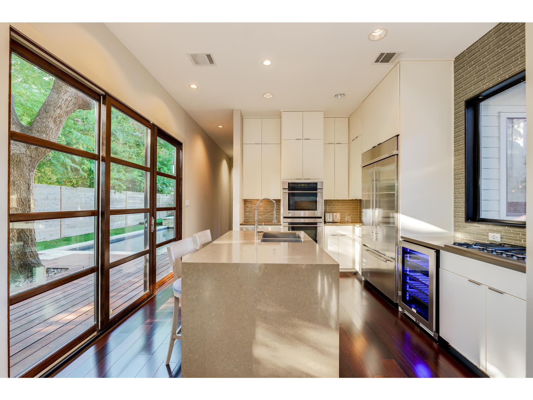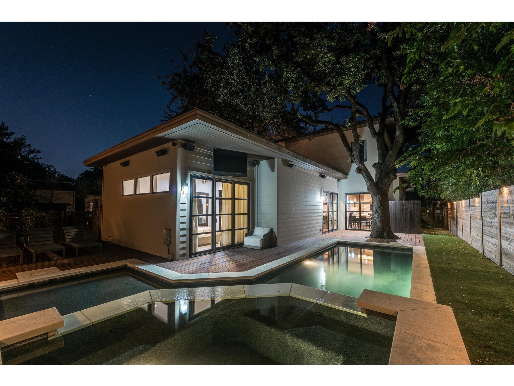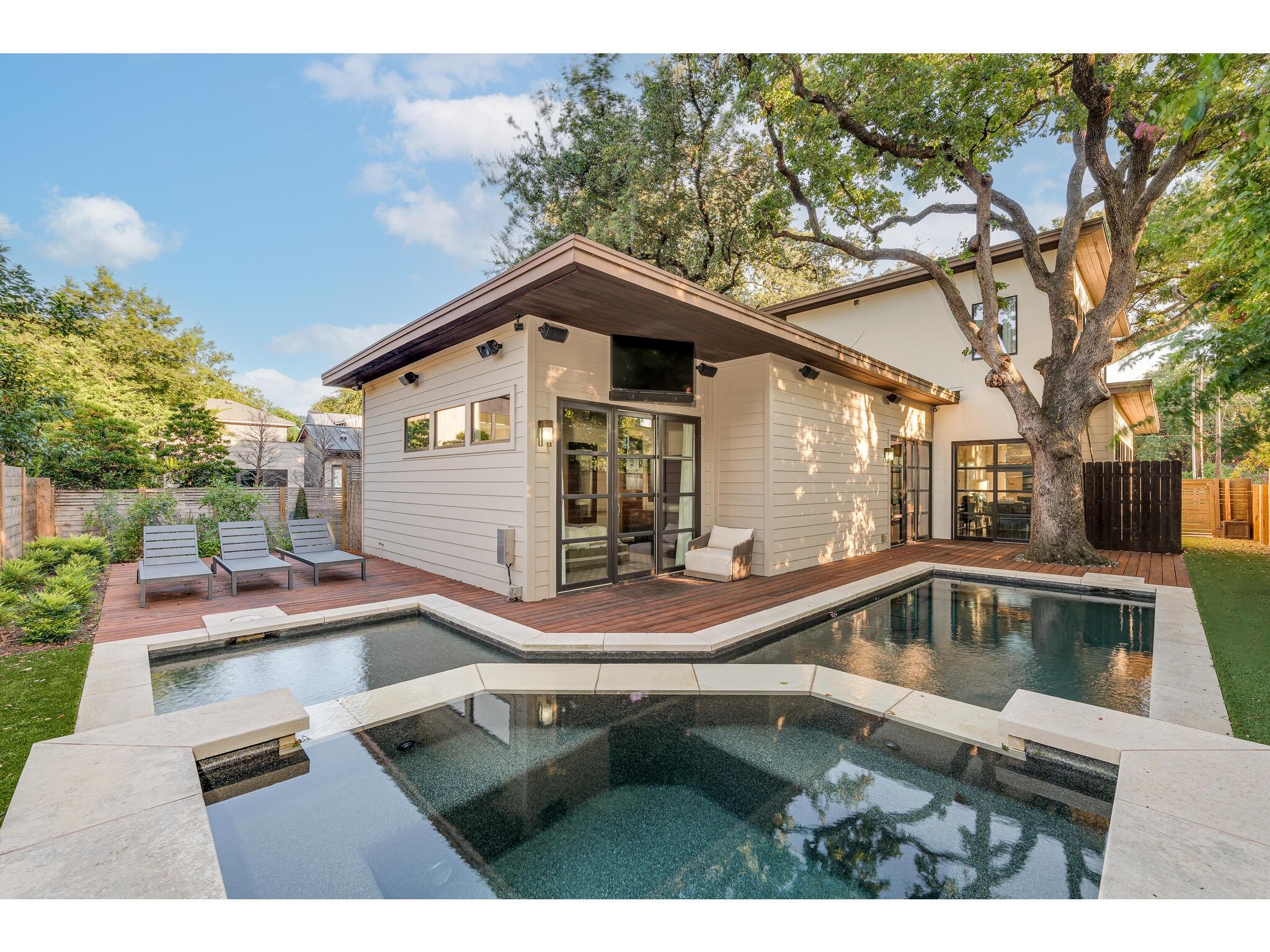 Stunning home beautifully situated in the Deep Eddy area, just west of Downtown Austin. Meticulously maintained with attention to detail throughout. As you enter an amazing open and spacious floor plan you can envision a multitude of entertainment options. Beautifully designed stone wall in foyer creates a warm welcome. Living area, the heart of the home, has a linear modern electric fireplace assuring a cozy and calm ambience. Interior is bathed in abundant natural light through expansive windows, high ceilings and beautiful wood flooring. Modern kitchen is a chef's delight, boasting sleek countertops, stainless appliances with wine refrigerator. Kitchen seamlessly opens to the dining area, making this amazing home ideal for hosting dinner parties and creating lasting memories with family and friends. Primary suite on main level opens to a spectacular backyard with a tranquil atmosphere ideal for reflection. Primary bath is a haven of relaxation. Double vanities with stone backsplash and rich wood cabinetry with built ins create a spa-like retreat. Sitting area upstairs with expansive windows is a great place to unwind. Large work space on 2nd floor can be used for office or study. 2 bedrooms upstairs with large closets perfect for guests or family. Glass sliding panel doors in living and primary bedroom effortlessly connect the indoors to the outdoors. Decking around mature oak trees enhance the natural beauty of the backyard landscape resulting in a harmonious blend of wood and nature. Spectacular outdoor living areas that illuminate at night with a sparkling swimming pool and spa, grill area and outdoor seating around an inviting fire pit. Large deck upstairs has room for additional seating ideal for gatherings. Walking distance to Deep Eddy, Zilker Park, hike and bike trails, restaurants, Lions Municipal Golf Course, modern HEB store and much more. Close to O. Henry Middle School. Austin ISD