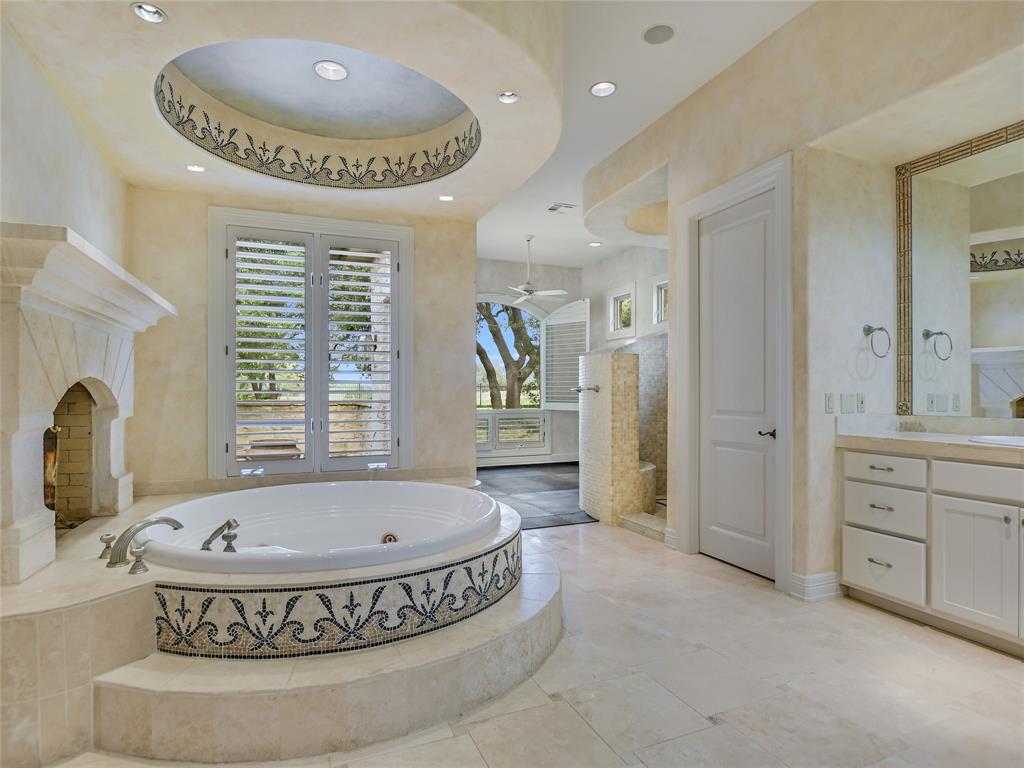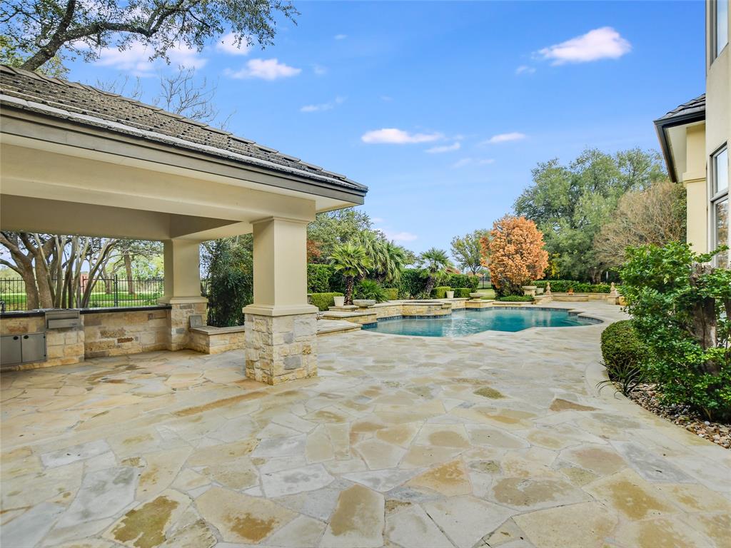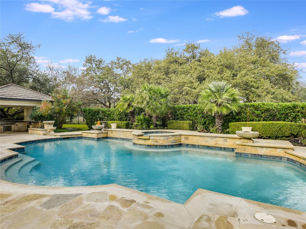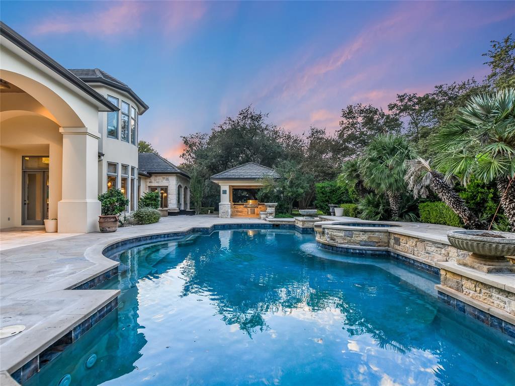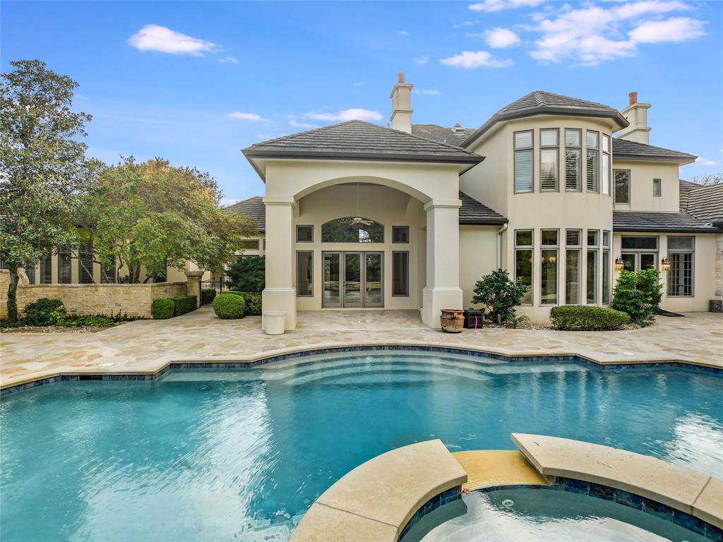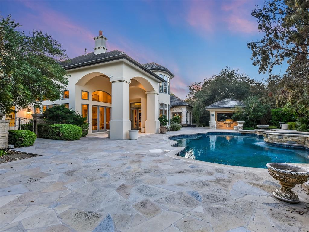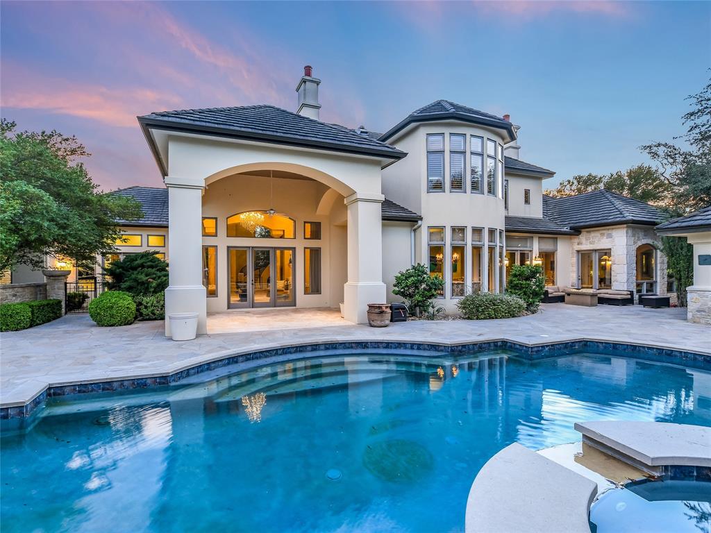 Beautiful open floor plan on Barton Creek Fazio Foothills Golf Course. This exclusive Barton Creek home sitting on a double lot of 1.18 acres has the perfect location! Walking in you, will find extreme high ceilings, beautiful Travertine tile, open living spaces and multiple living areas. This mostly single story home has the primary bedroom located on the first floor with with a truly custom office just down the hall. The open kitchen to living area is the perfect place for family to entertain. Upstairs you will find three bedrooms with full baths and a upstairs living area. Walking outside, you will find amazing oak trees with a large patio perfect for entertaining. The symmetrical pool and spa is a invitation for relaxation.
