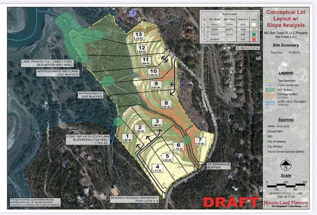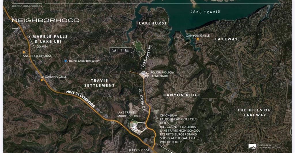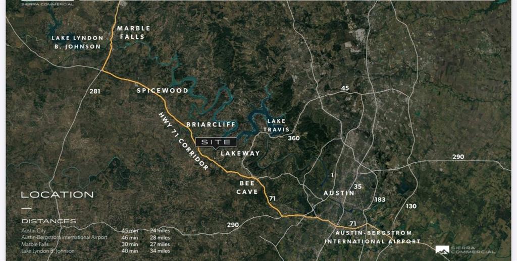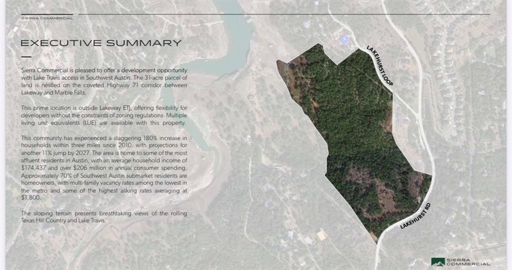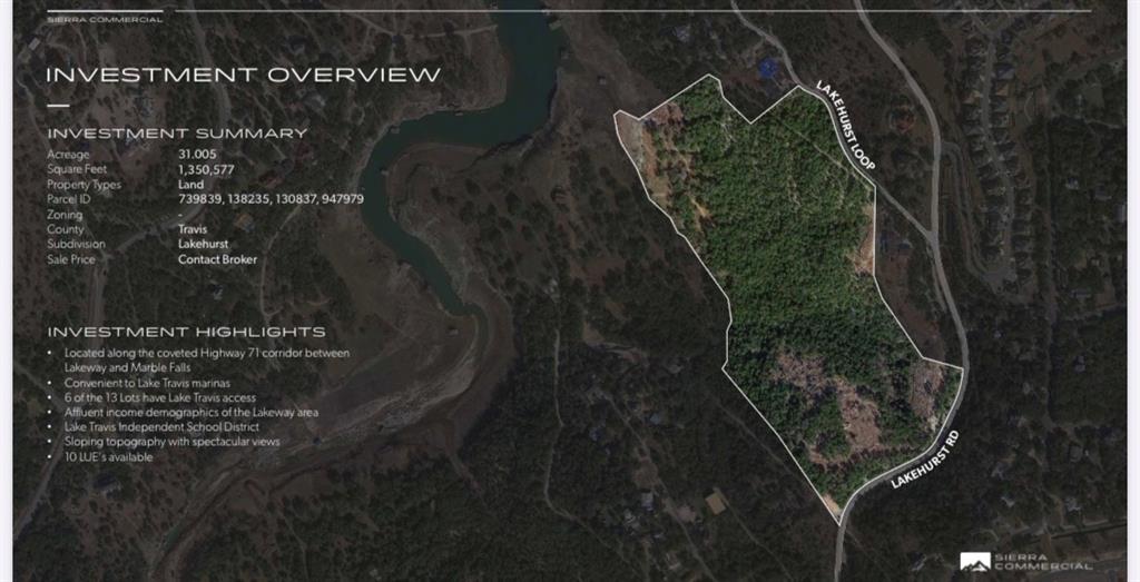 Sierra Commercial is pleased to offer a development opportunity with Lake Travis access in Southwest Austin. The 31-acre parcel of land is nestled on the coveted Highway 71 corridor between Lakeway and Marble Falls. This prime location is outside Lakeway ETJ, offering flexibility for developers without the constraints of zoning regulations. Multiple living unit equivalents (LUE) are available with this property. This community has experienced a staggering 180% increase in households within three miles since 2010, with projections for another 11% jump by 2027. The area is home to some of the most affluent residents in Austin, with an average household income of $174,437 and over $206 million in annual consumer spending. Approximately 70% of Southwest Austin submarket residents are homeowners, with multi-family vacancy rates among the lowest in the metro and some of the highest asking rates averaging at $1,800. The sloping terrain presents breathtaking views of the rolling Texas Hill Country and Lake Travis. Bee Caves II & III LAKE TRAVIS ISD - LAKE TRAVIS ACCESS - LAKE TRAVIS VIEWS - NO HOA - LOW TAX RATE OF 1.9% - INDIVIDUAL LOTS OR ENTIRE 31 ACRES FOR SALE - LUE’S AVAILABLE - 1 MILE FROM ROUGH HOLLOW ELEMENTARY & CLOSE TO LAKE TRAVIS MIDDLE SCHOOL - EXEMPLARY SCHOOLS - CLOSE TO 71 AND BEE CREEK