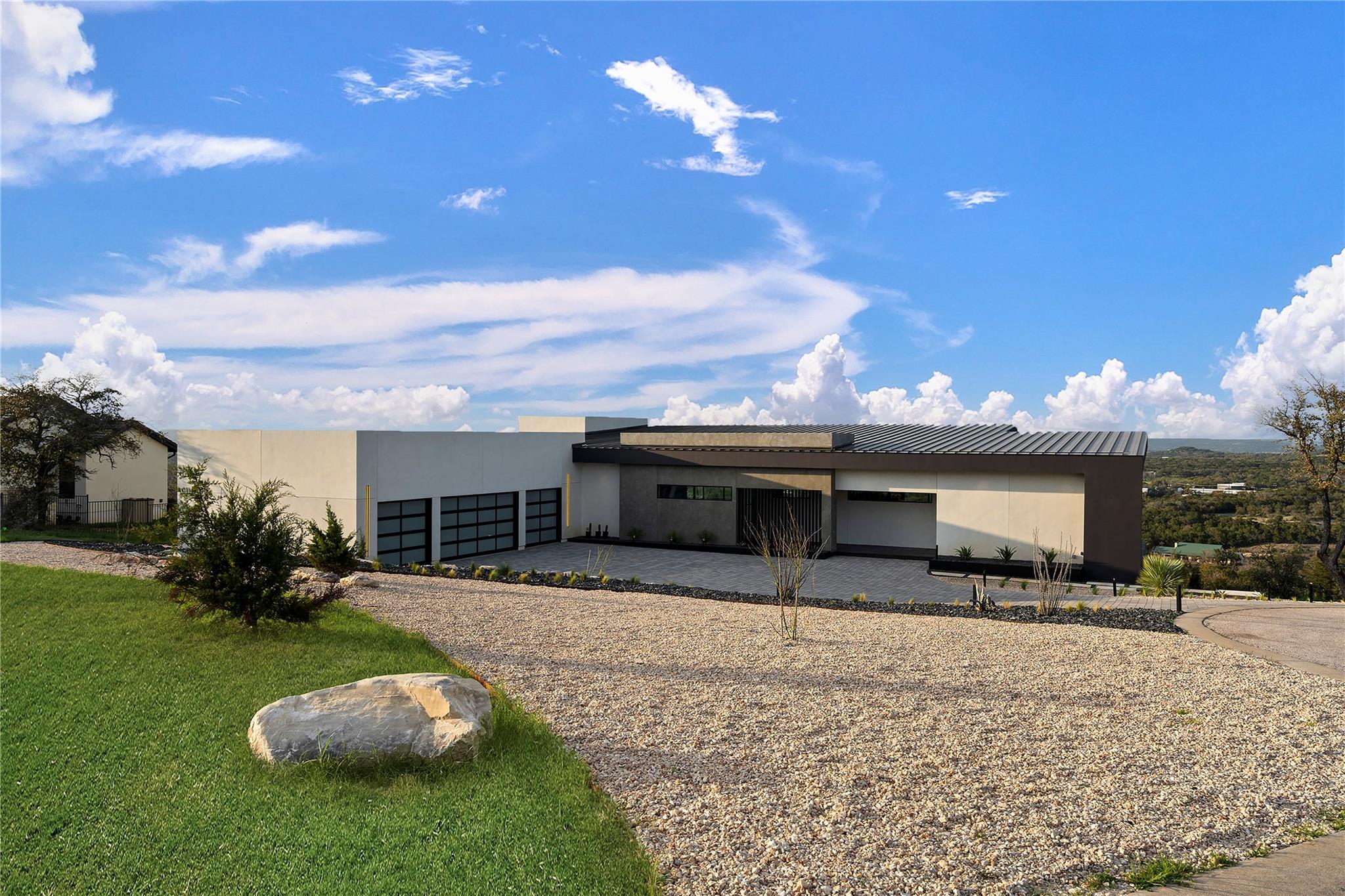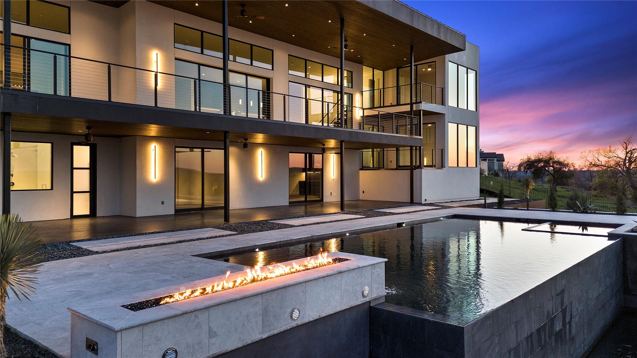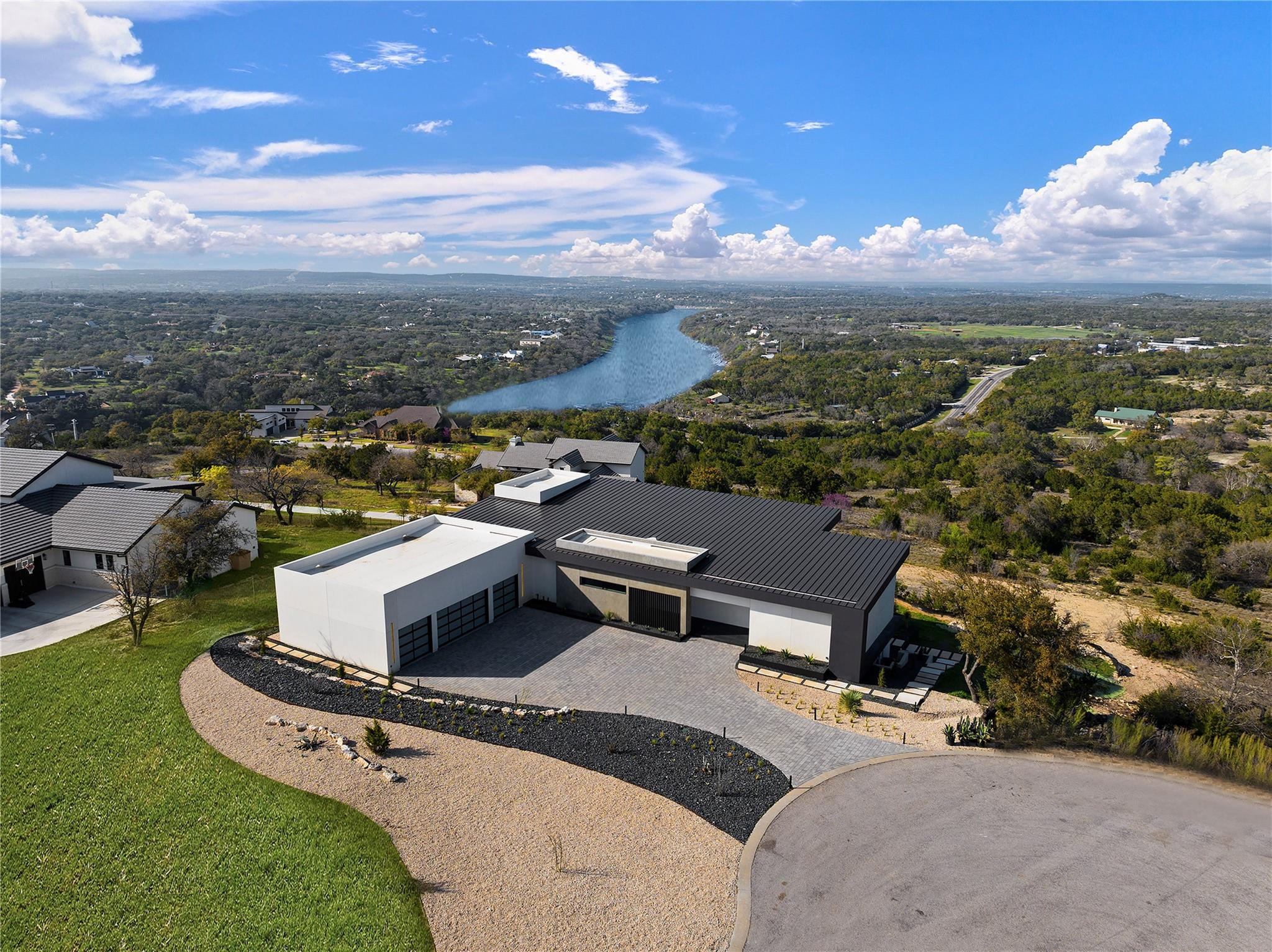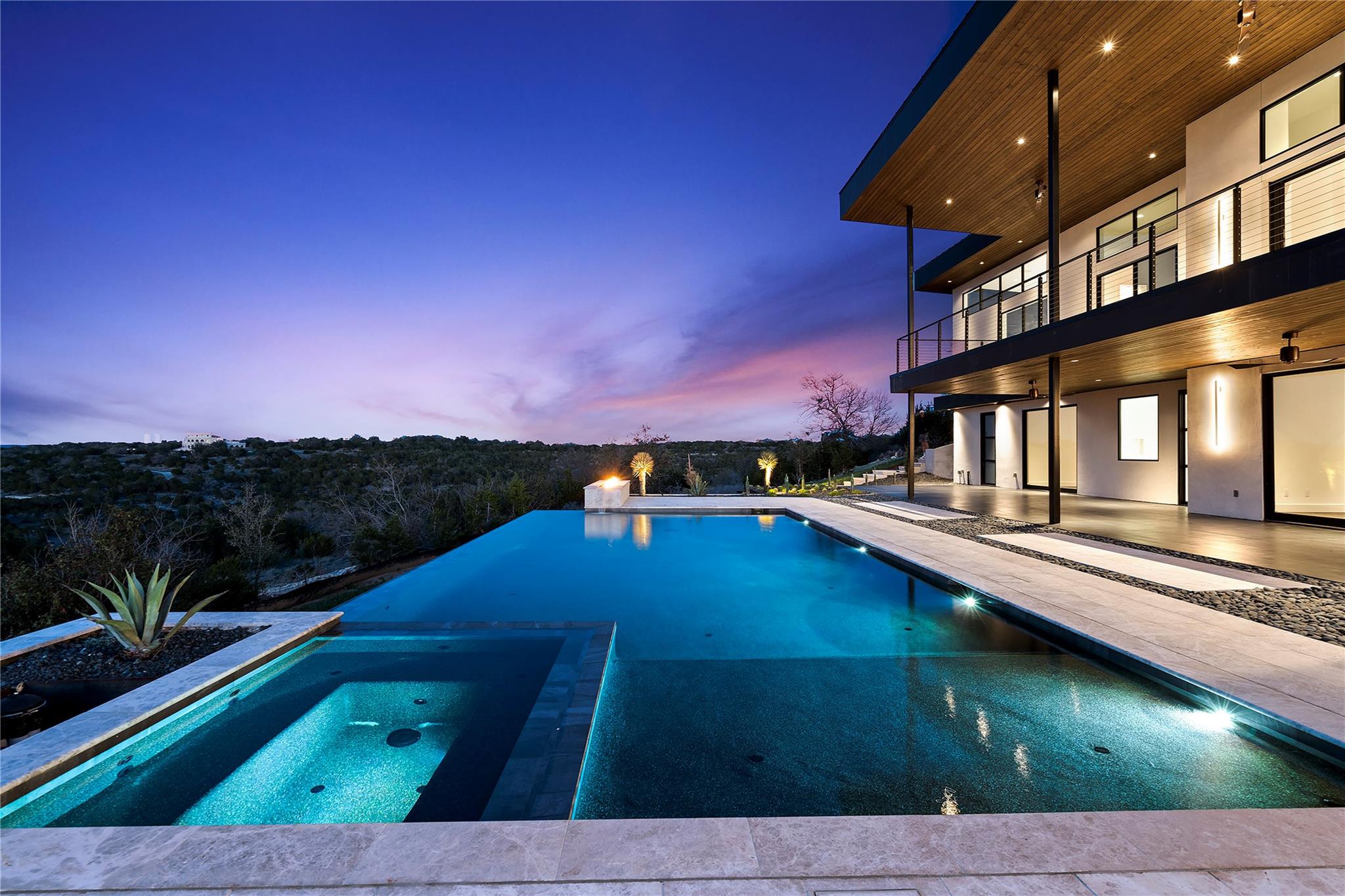 Discover the epitome of luxurious modern living at 1702 Moonlight Trace, where the glamor of Hollywood Hills seamlessly merges with the tranquility of Austin Hill Country. Crafted to perfection by Steve Zagorski Architects and constructed by Credence Custom Homes of Austin, this exceptional residence is a testament to innovative design, offering an unparalleled blend of style, function, and technology. Nestled on a sprawling 1.0-acre lot within the prestigious Tierra Vista gated community - recognized as the 2015 Development of the Year - this home boasts awe-inspiring panoramic views of the Pedernales River and the majestic Hill Country landscape. With 4,970 square feet of meticulously designed living space, including 5 bedrooms and 5 bathrooms, every detail exudes opulence and sophistication. Step inside to discover carefully curated upscale luxury finishes, state-of-the-art technology, and high-efficiency building materials and appliances throughout. The open floor plan flows effortlessly, offering generous living areas perfect for entertaining and daily relaxation. Four large covered patios with tongue and groove stained wood ceilings provide intimate outdoor spaces year-round, while the custom infinity-edge pool and spa offer the ultimate in relaxation and enjoyment. Retreat to the luxurious Primary Bedroom and Bath, where privacy and comfort await. The spacious walk-in closet features custom built-ins and an LG steam/dry cleaning unit, while the en-suite bathroom offers a spa-like experience with double vanities, a freestanding soaking tub, and an impressive oversized walk-in shower with frameless glass. Located in the sought-after community of Spicewood, with easy access to Hwy 71 and just minutes from The Galleria, restaurants, and exemplary Lake Travis ISD schools, this modern marvel presents an exceptional opportunity for discerning buyers. With construction concluded in February 2024, this property is turnkey and ready for immediate move-in.