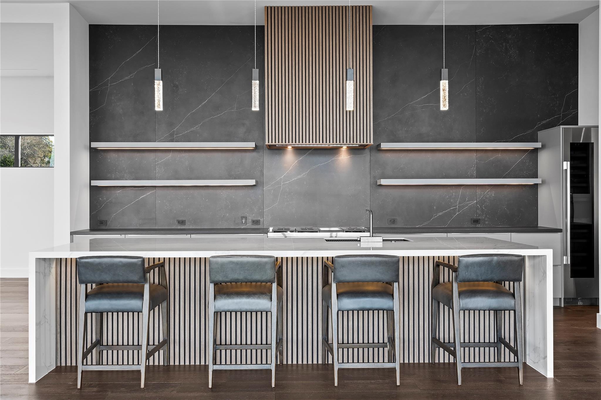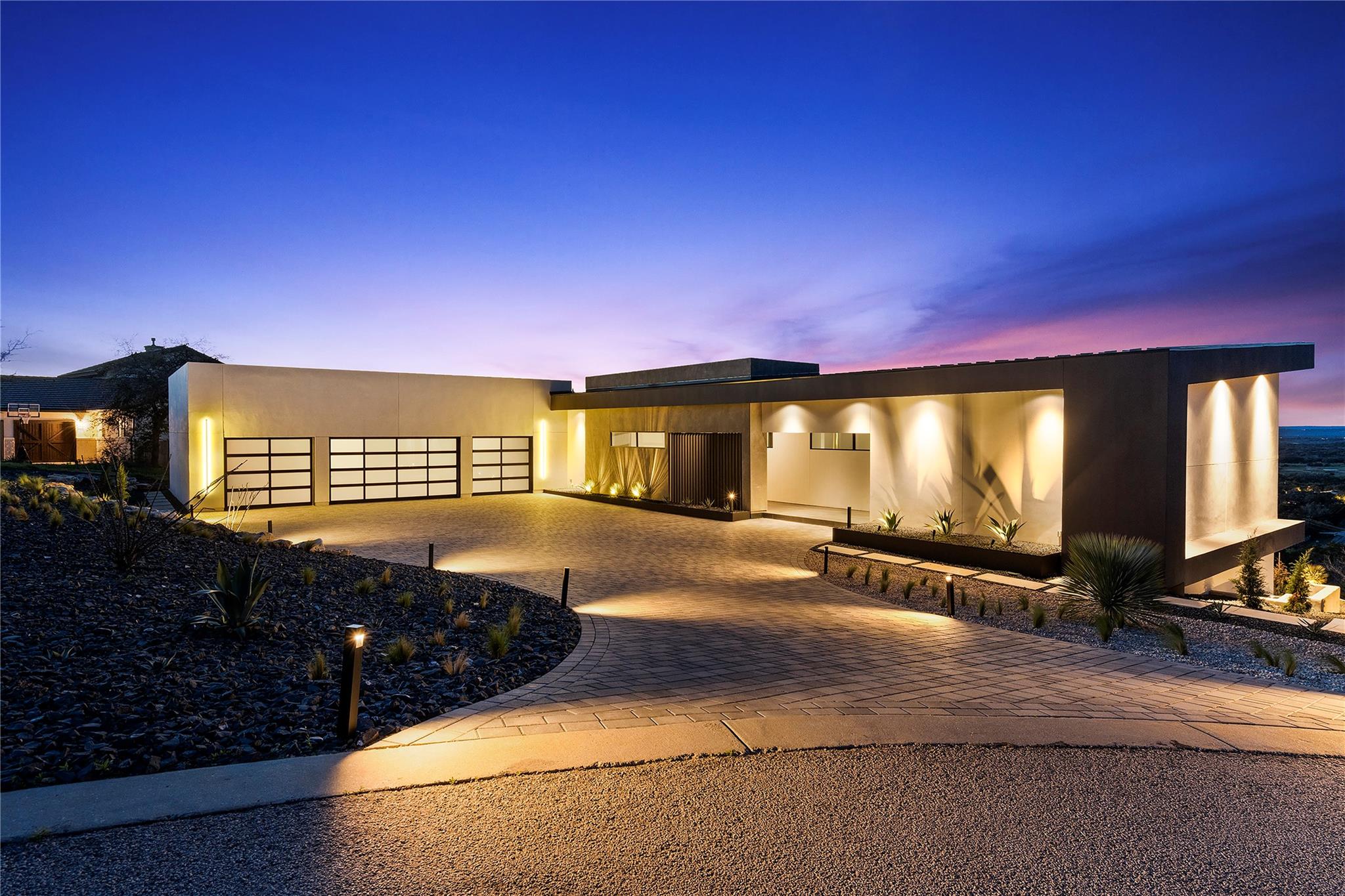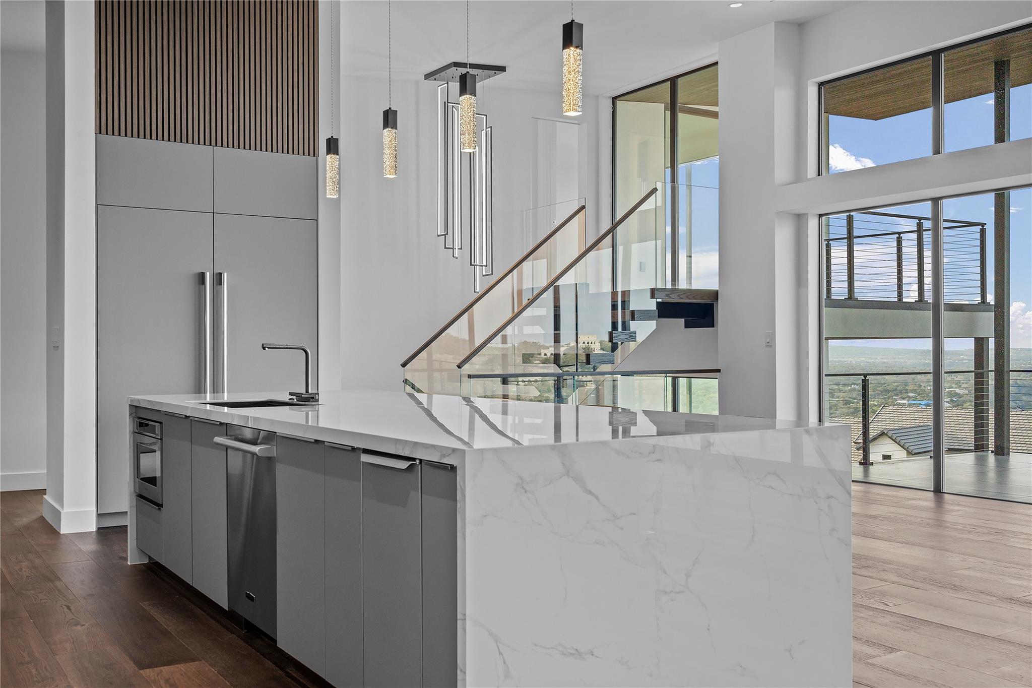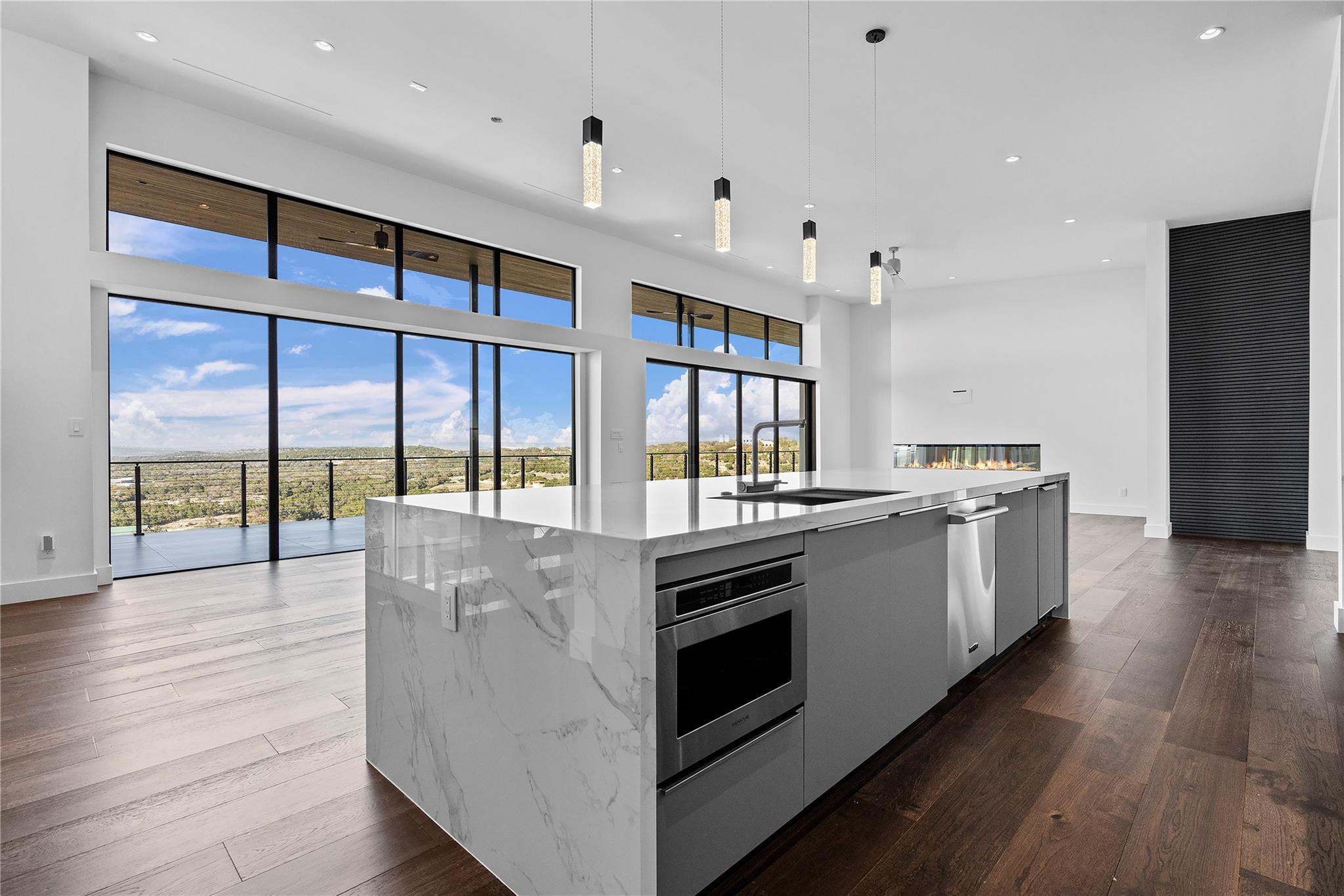 Discover the epitome of luxurious modern living at 1702 Moonlight Trace, where the glamor of Hollywood Hills seamlessly merges with the tranquility of Austin Hill Country. Crafted to perfection by Steve Zagorski Architects and constructed by Credence Custom Homes of Austin, this exceptional residence is a testament to innovative design, offering an unparalleled blend of style, function, and technology. Nestled on a sprawling 1.0-acre lot within the prestigious Tierra Vista gated community - recognized as the 2015 Development of the Year - this home boasts awe-inspiring panoramic views of the Pedernales River and the majestic Hill Country landscape. With 4,970 square feet of meticulously designed living space, including 5 bedrooms and 5 bathrooms, every detail exudes opulence and sophistication. Step inside to discover carefully curated upscale luxury finishes, state-of-the-art technology, and high-efficiency building materials and appliances throughout. The open floor plan flows effortlessly, offering generous living areas perfect for entertaining and daily relaxation. Four large covered patios with tongue and groove stained wood ceilings provide intimate outdoor spaces year-round, while the custom infinity-edge pool and spa offer the ultimate in relaxation and enjoyment. Retreat to the luxurious Primary Bedroom and Bath, where privacy and comfort await. The spacious walk-in closet features custom built-ins and an LG steam/dry cleaning unit, while the en-suite bathroom offers a spa-like experience with double vanities, a freestanding soaking tub, and an impressive oversized walk-in shower with frameless glass. Located in the sought-after community of Spicewood, with easy access to Hwy 71 and just minutes from The Galleria, restaurants, and exemplary Lake Travis ISD schools, this modern marvel presents an exceptional opportunity for discerning buyers. With construction concluded in February 2024, this property is turnkey and ready for immediate move-in.