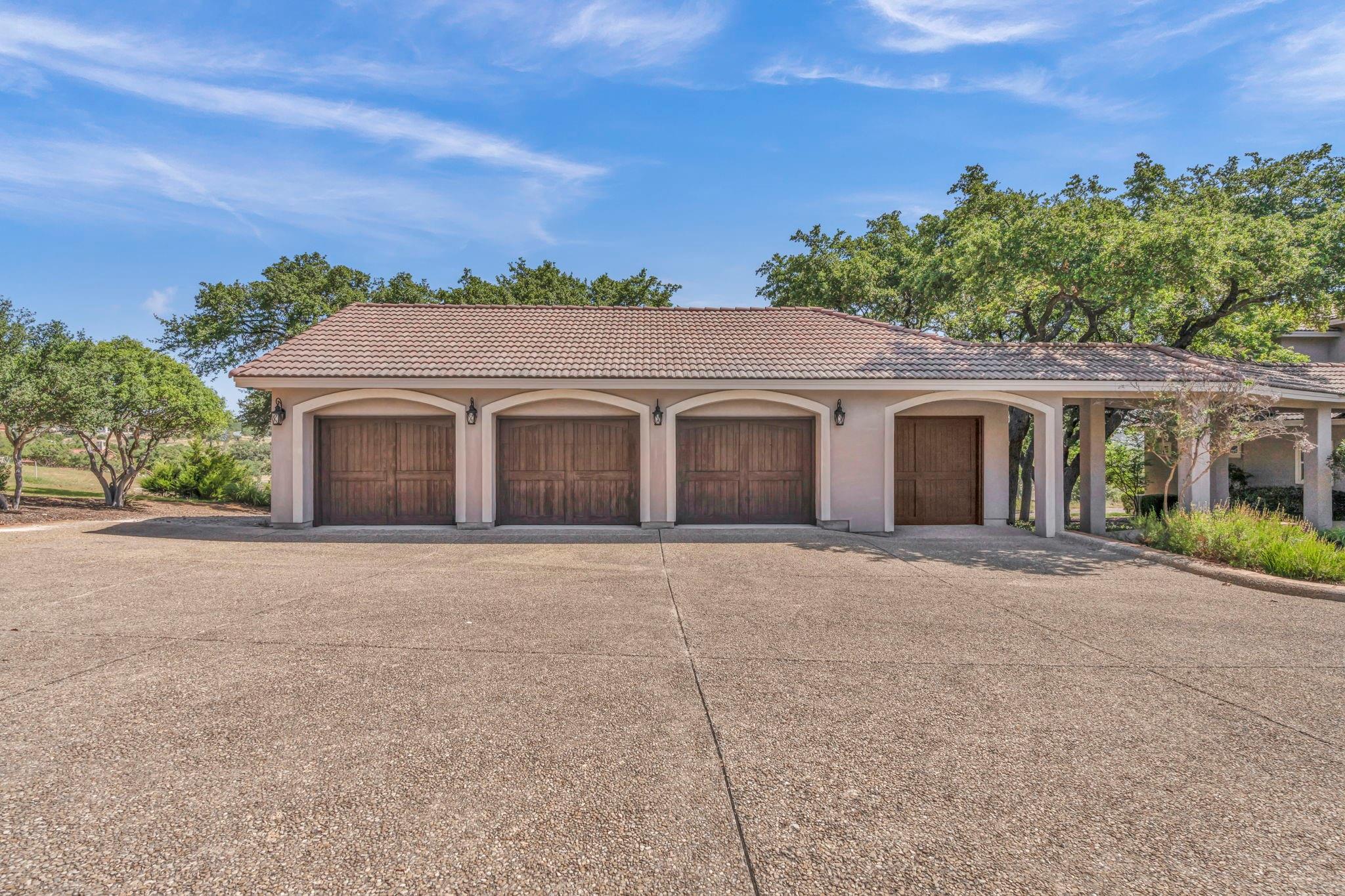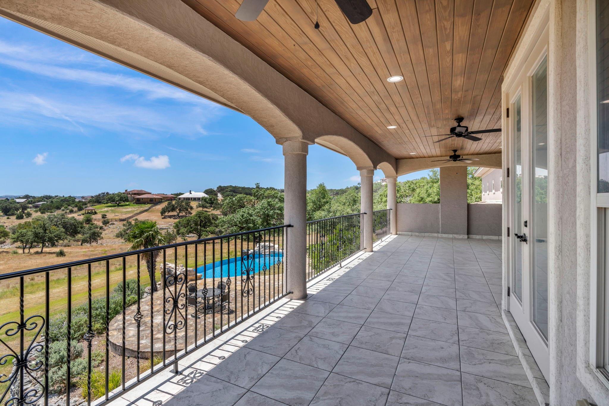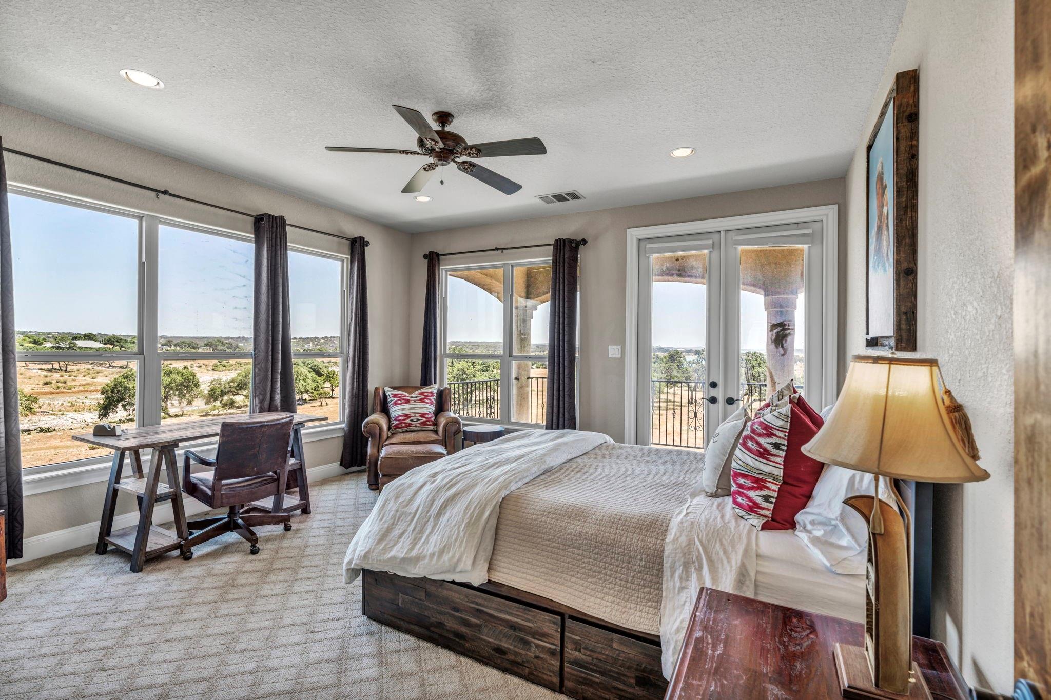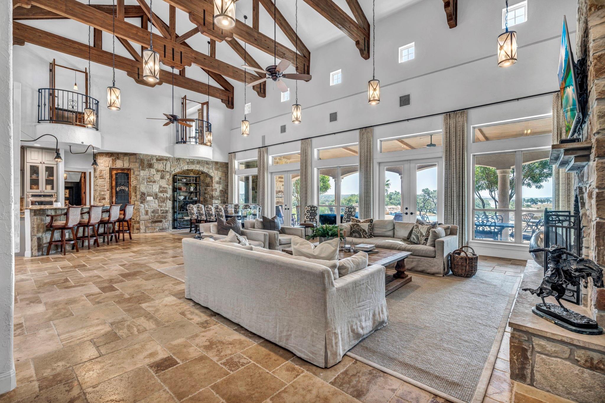 *Seller Financing available at a lower interest rate than current bank interest rates* Welcome to this serene setting on Canyon Lake in the prestigious gated-community of the Peninsula at Mystic Shores. The 5.9 acres boasts mature landscaping (irrigated from a private well) of oaks and sycamores around the home and native plants and grasses down to the 500 ft of waterfront with private watercraft launch. The adjacent, buildable, 4-acre lot with an additional 500+ ft of waterfront is also available separately or can be bundled if desired to produce a 10-acre homestead with over 1000+ ft of lakefront. The 5300 sq ft Mediterranean home is perfect for entertaining or large family gatherings. The open-concept main living/dining/kitchen area has 25 ft vaulted ceilings with exposed beam trusses, stone fireplace and accents, alderwood built-ins, and sweeping lake views. His and her offices/libraries of the main living area provide flexible work-from-home options. The master suite consists of a luxurious bath with tub and shower, large walk-in closet with built-ins, and private exercise room. Additionally, there are two guest bedrooms with en suites on the main level and a third guest bedroom upstairs off the game room. Relax in the upstairs six-recliner custom movie room or soak in the Hill Country views from the upper porch off the bar-equipped game room. Enjoy the lake breezes on the covered lower back porch equipped with a fireplace, outdoor kitchen, and ceiling fans over both dining and sitting spaces. The view across the infinity pool and down the 7-mile lake expanse to Canyon dam is breathtaking. A covered breezeway leads from the mudroom/laundryroom to a 4-car garage with one bay large enough to accommodate a boat or other water toys. Don’t miss out on this rare opportunity to own multiple acres of gently sloping and highly accessible water frontage!