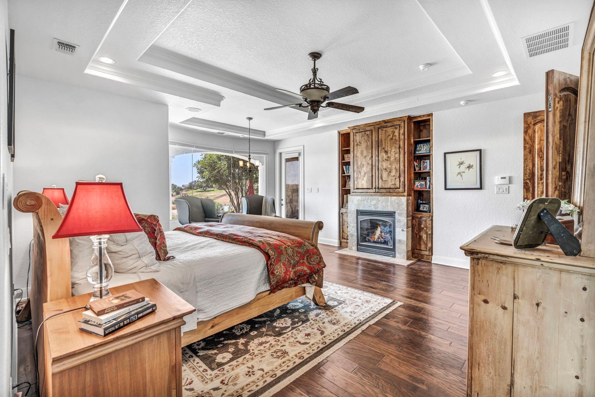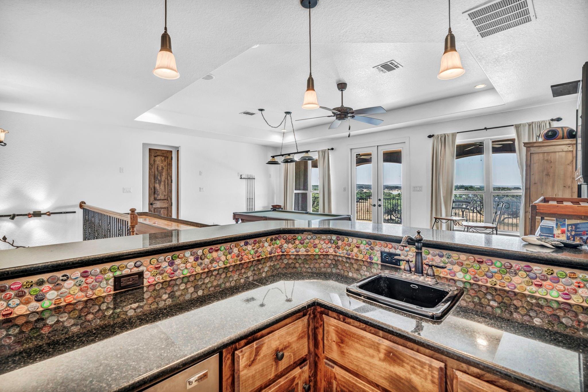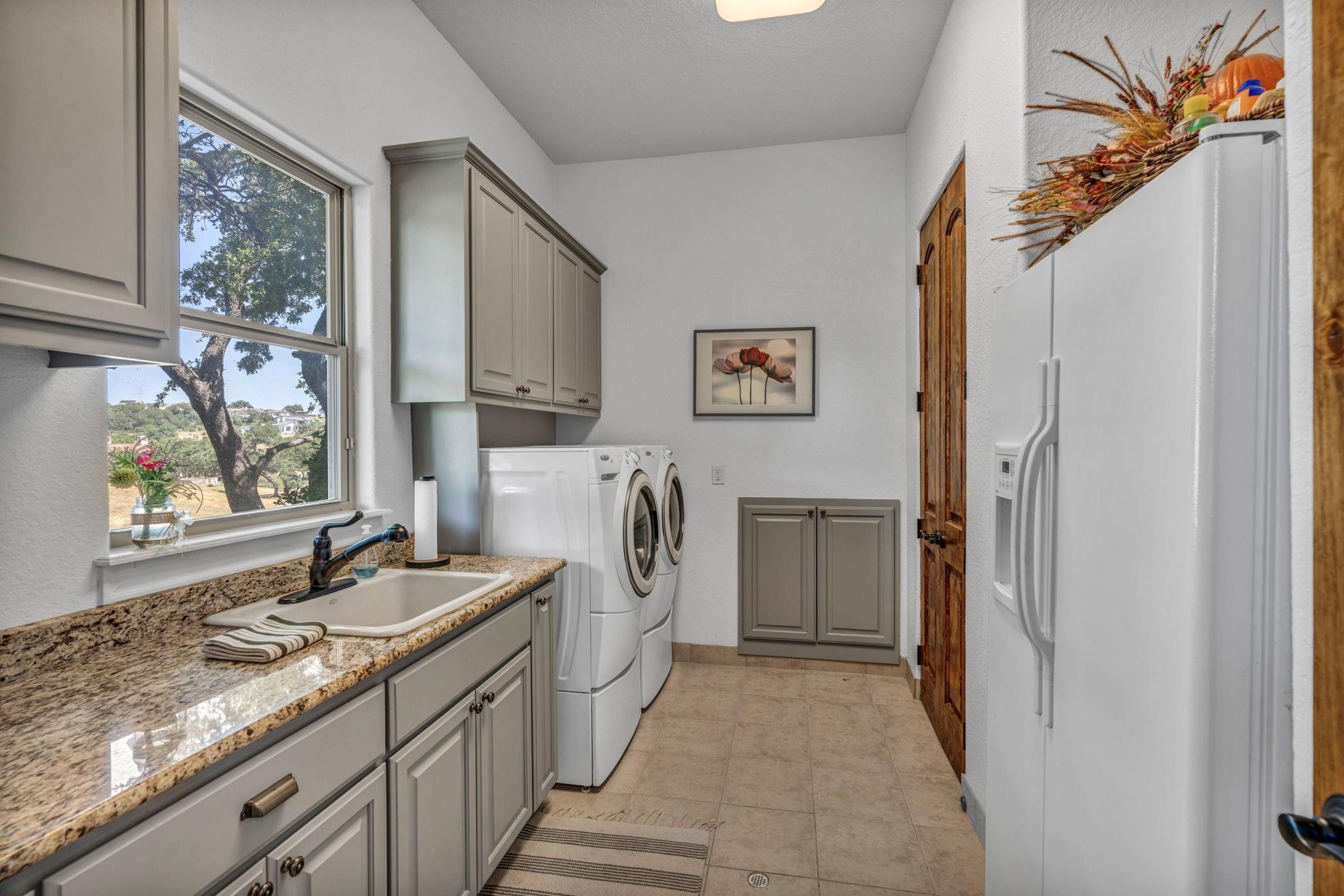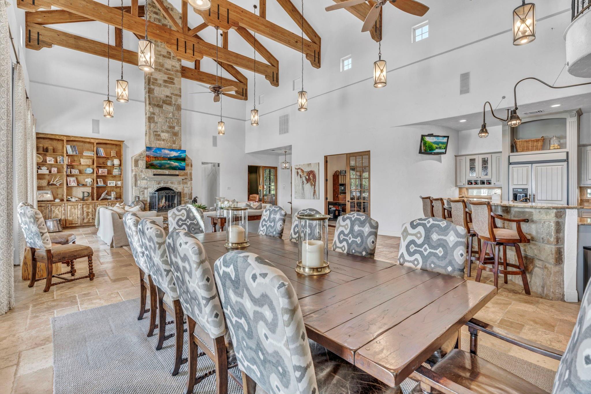 *Seller Financing available at a lower interest rate than current bank interest rates* Welcome to this serene setting on Canyon Lake in the prestigious gated-community of the Peninsula at Mystic Shores. The 5.9 acres boasts mature landscaping (irrigated from a private well) of oaks and sycamores around the home and native plants and grasses down to the 500 ft of waterfront with private watercraft launch. The adjacent, buildable, 4-acre lot with an additional 500+ ft of waterfront is also available separately or can be bundled if desired to produce a 10-acre homestead with over 1000+ ft of lakefront. The 5300 sq ft Mediterranean home is perfect for entertaining or large family gatherings. The open-concept main living/dining/kitchen area has 25 ft vaulted ceilings with exposed beam trusses, stone fireplace and accents, alderwood built-ins, and sweeping lake views. His and her offices/libraries of the main living area provide flexible work-from-home options. The master suite consists of a luxurious bath with tub and shower, large walk-in closet with built-ins, and private exercise room. Additionally, there are two guest bedrooms with en suites on the main level and a third guest bedroom upstairs off the game room. Relax in the upstairs six-recliner custom movie room or soak in the Hill Country views from the upper porch off the bar-equipped game room. Enjoy the lake breezes on the covered lower back porch equipped with a fireplace, outdoor kitchen, and ceiling fans over both dining and sitting spaces. The view across the infinity pool and down the 7-mile lake expanse to Canyon dam is breathtaking. A covered breezeway leads from the mudroom/laundryroom to a 4-car garage with one bay large enough to accommodate a boat or other water toys. Don’t miss out on this rare opportunity to own multiple acres of gently sloping and highly accessible water frontage!