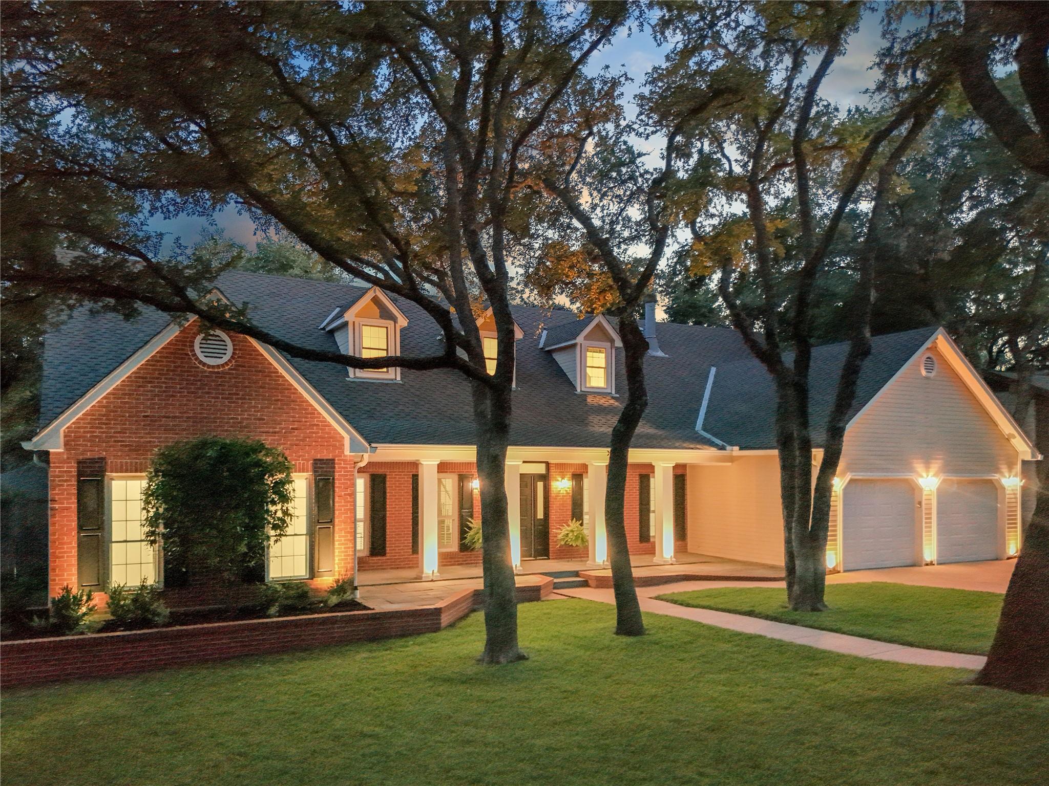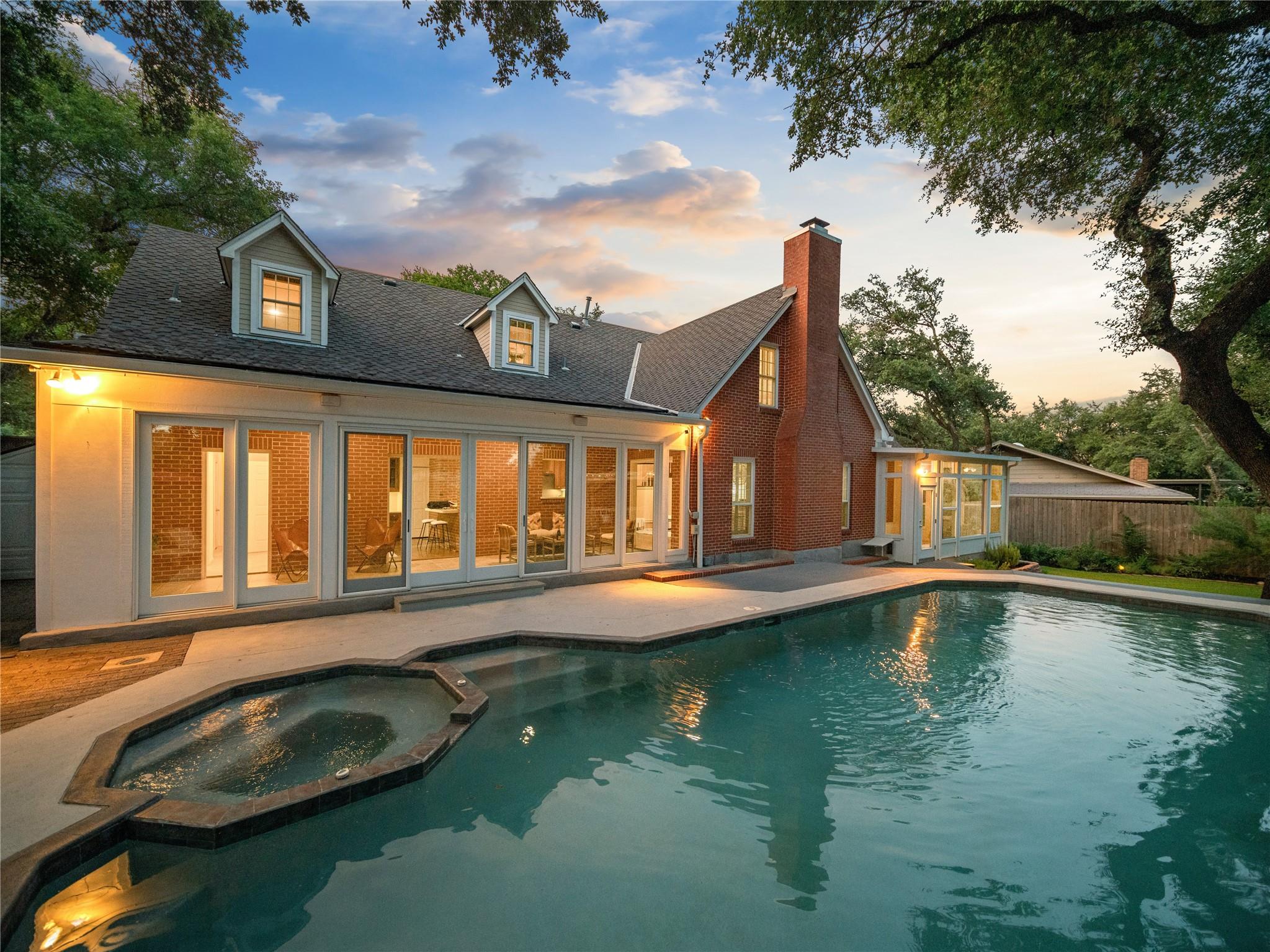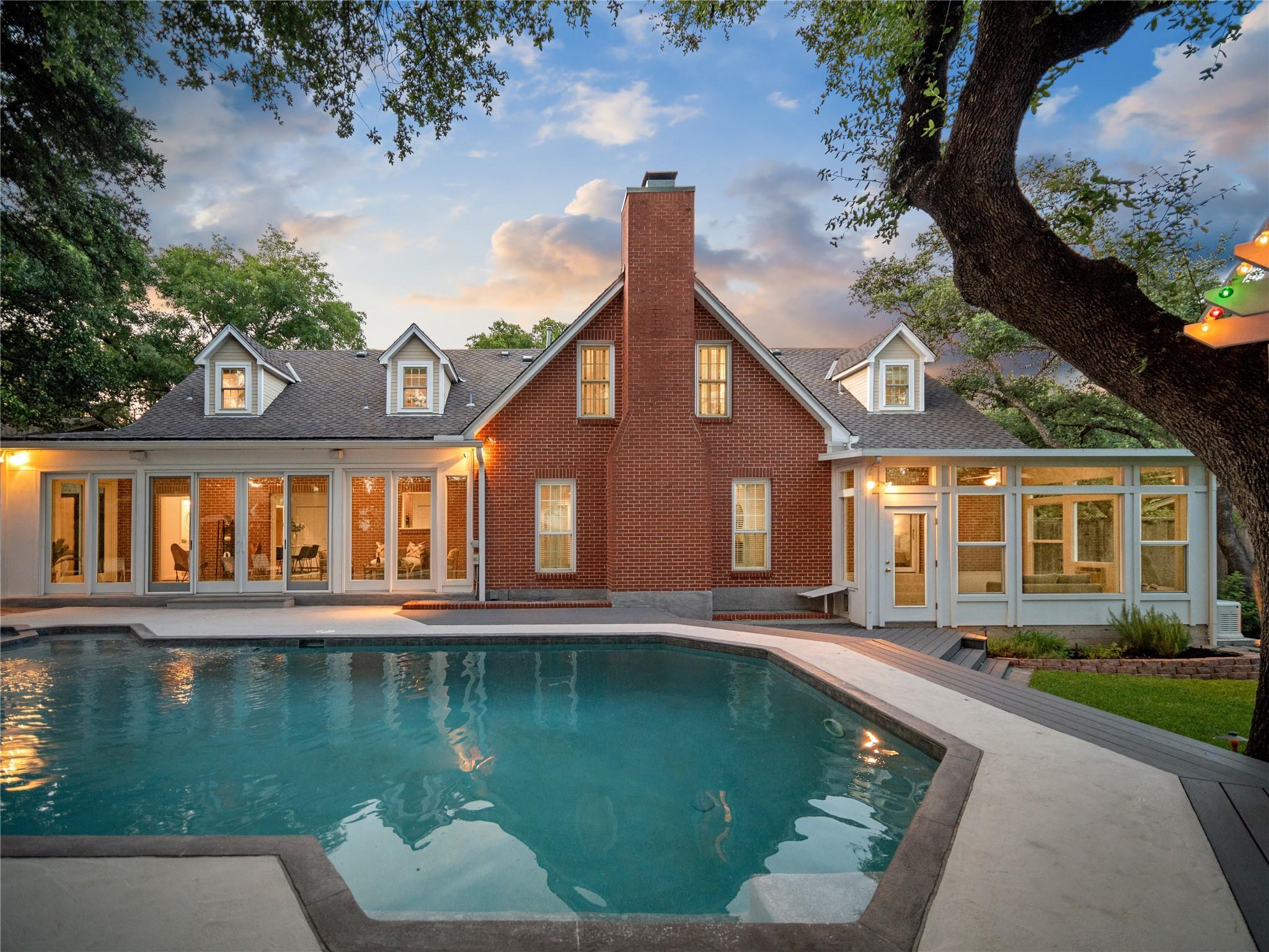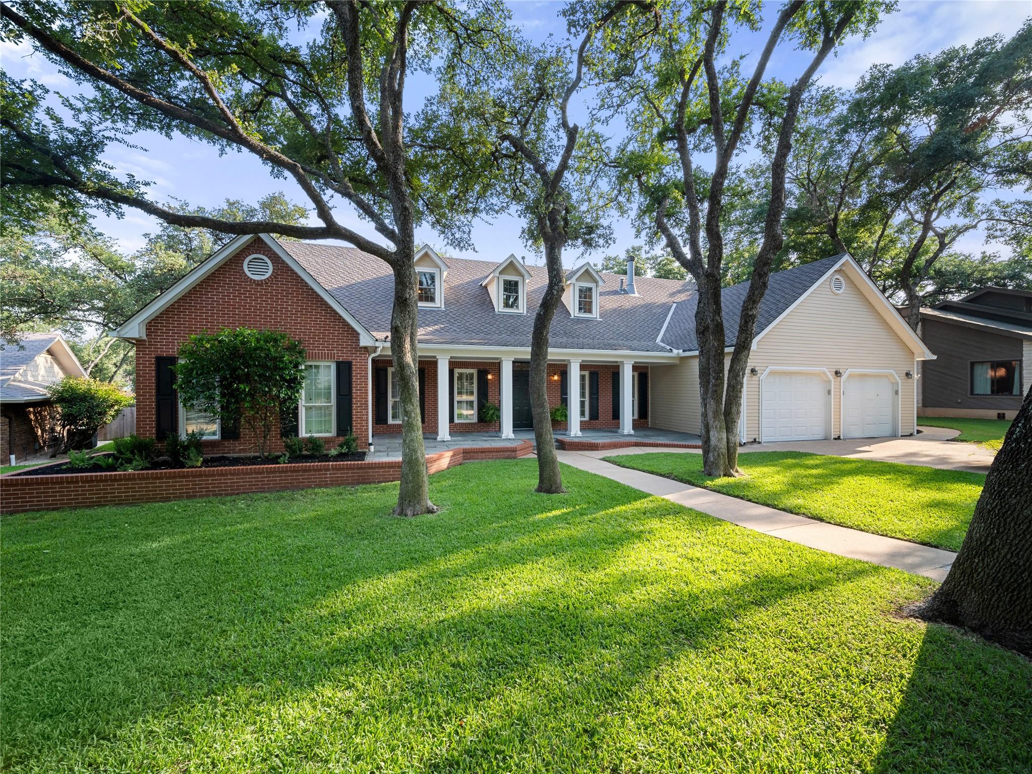 A true southern beauty, this home was custom built with attention to detail on ~1/3 AC level lot covered with gorgeous oak trees. This charming home has been lovingly maintained, inside and out, by one owner. Located on one of the most coveted streets and sections of Northwest Hills, this classic, two-story red brick home with a welcoming and deep, covered front porch adorned with stately columns has many attributes. Highlights of this carefully curated timeless design include: real wood floors, two huge livings areas and both have fireplaces (one down, one up), designated office on main level, sunroom spanning back of home overlooking expansive backyard oasis, solar heated pool with hot tub, an incredible, oversized Primary Bedroom downstairs with an exercise room attached, large Primary Bath with two roomy his/hers walk-in closets, wonderful kitchen in the heart of the home, breakfast area as well as separate dining area for hosting family and friends, two secondary bedrooms upstairs, two separate staircases to access the upper level, two Trane systems maintained by Christianson, unique patterned shingle roof already checked and in good condition, home is smartly equipped with a Generac generator, new carpet, freshly painted an elegant, captivating neutral palette, and you'll relish the abundance of storage throughout! Enjoy backyard bliss: pool and hot tub surrounded by composite deck, plentiful lounging areas, gas fire pit, covered outdoor grilling area, hidden storage shed for all your gardening and pool needs, plenty of grassy area for the family pet and playscape, fully landscaped, manicured lawns both front and back, backyard is surrounded by an 8 ft tall privacy fence. Walk/bike to JCC, Doss and Murchison. HEB is minutes away, as well as doctors offices, shopping, and a quick commute to downtown, UT, and The Domain. Solid as a rock and superb location. Charleston-like charm and splendor on the south side of Green Trails in the heart of Northwest Hills!