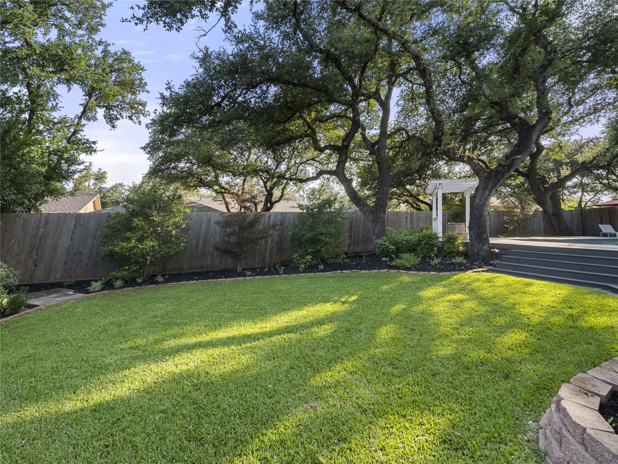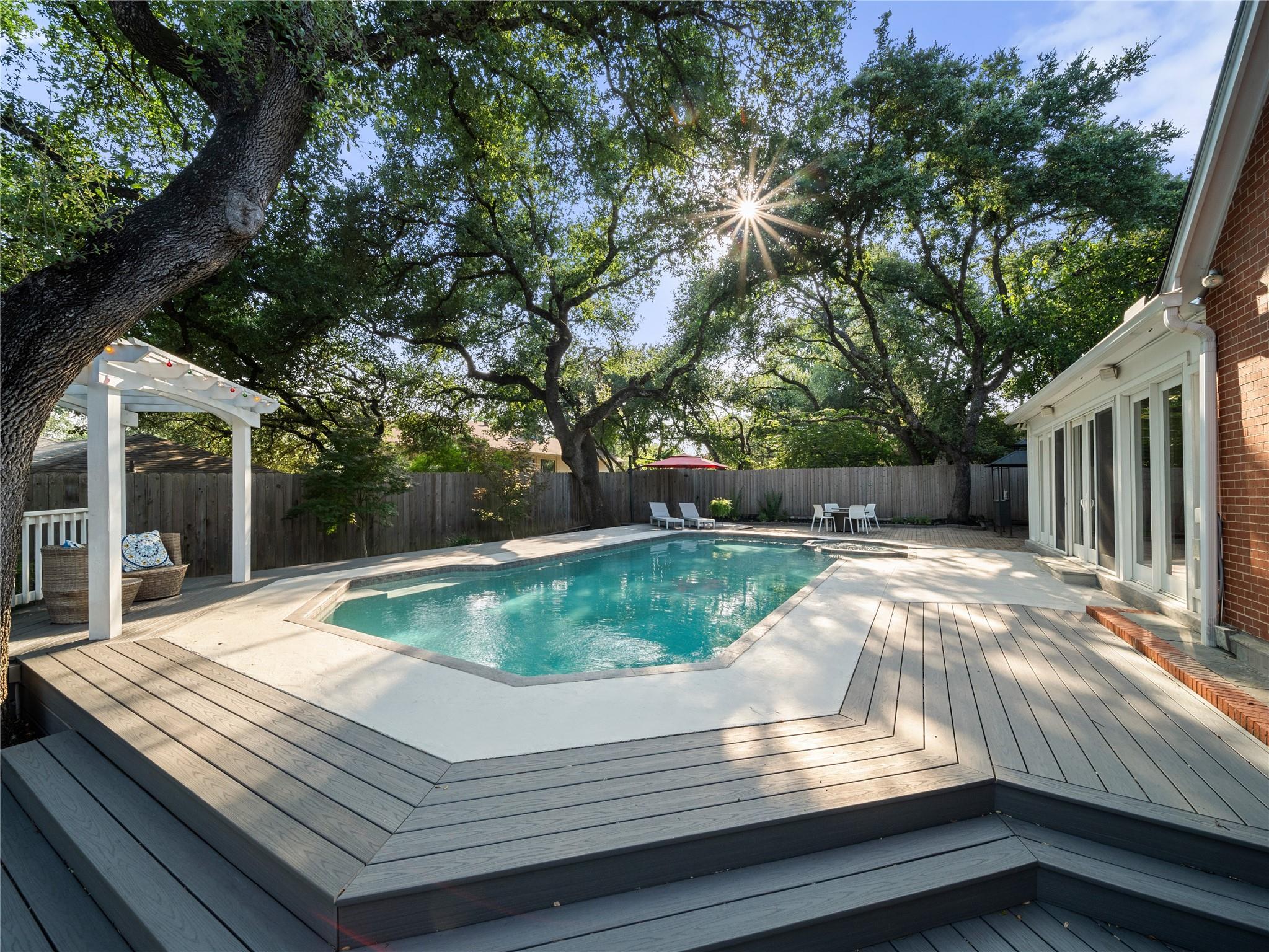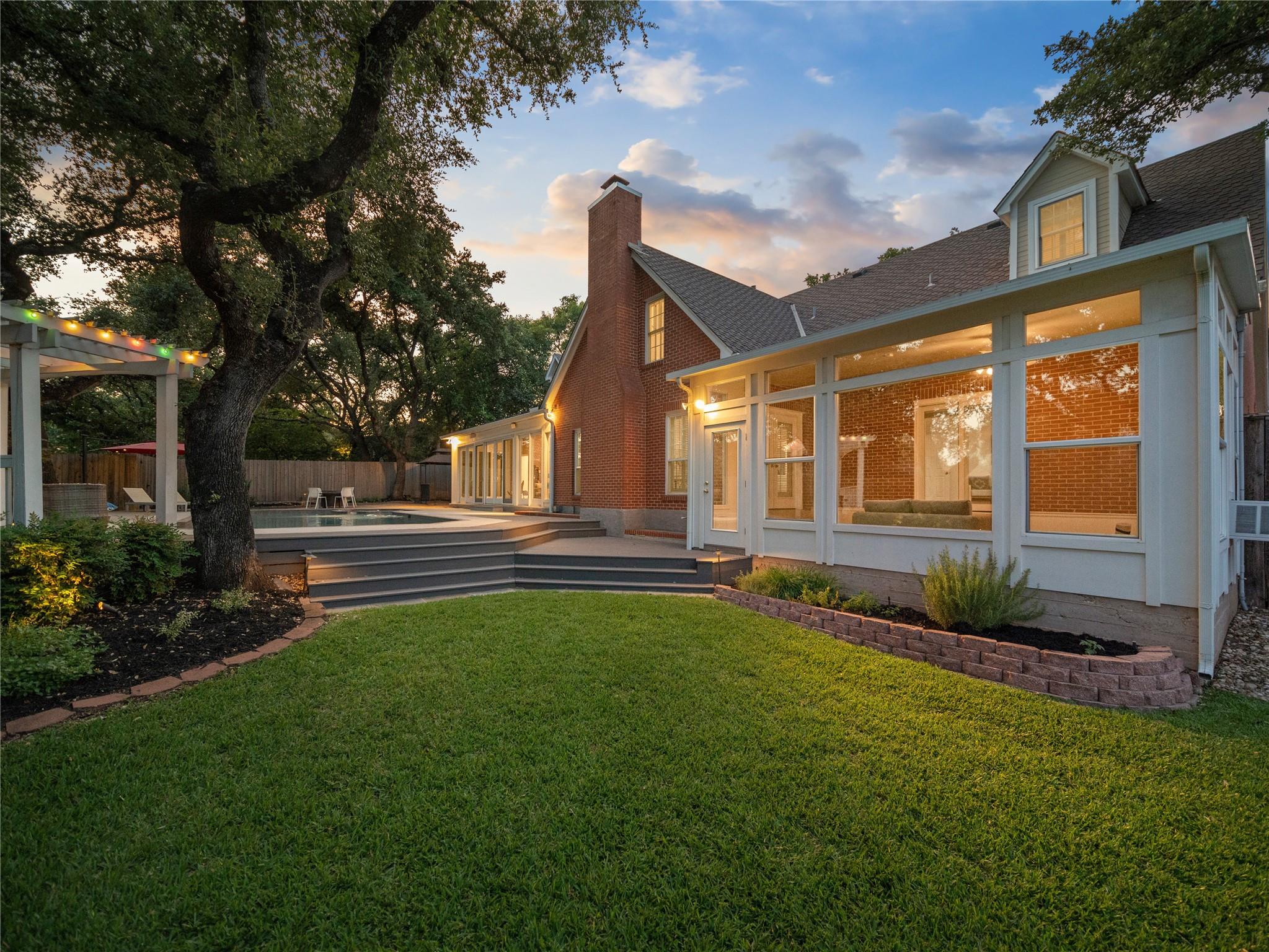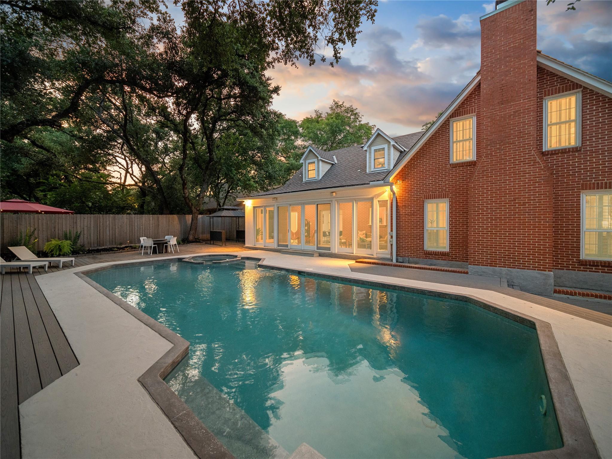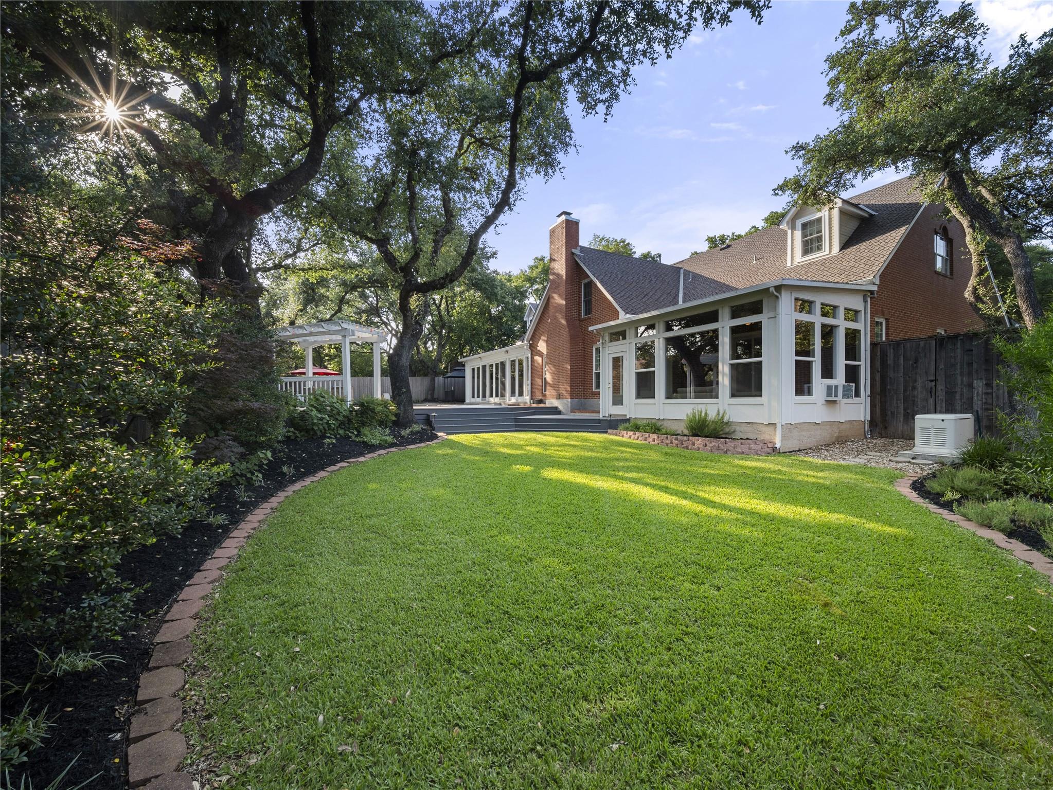 A true southern beauty, this home was custom built with attention to detail on ~1/3 AC level lot covered with gorgeous oak trees. This charming home has been lovingly maintained, inside and out, by one owner. Located on one of the most coveted streets and sections of Northwest Hills, this classic, two-story red brick home with a welcoming and deep, covered front porch adorned with stately columns has many attributes. Highlights of this carefully curated timeless design include: real wood floors, two huge livings areas and both have fireplaces (one down, one up), designated office on main level, sunroom spanning back of home overlooking expansive backyard oasis, solar heated pool with hot tub, an incredible, oversized Primary Bedroom downstairs with an exercise room attached, large Primary Bath with two roomy his/hers walk-in closets, wonderful kitchen in the heart of the home, breakfast area as well as separate dining area for hosting family and friends, two secondary bedrooms upstairs, two separate staircases to access the upper level, two Trane systems maintained by Christianson, unique patterned shingle roof already checked and in good condition, home is smartly equipped with a Generac generator, new carpet, freshly painted an elegant, captivating neutral palette, and you'll relish the abundance of storage throughout! Enjoy backyard bliss: pool and hot tub surrounded by composite deck, plentiful lounging areas, gas fire pit, covered outdoor grilling area, hidden storage shed for all your gardening and pool needs, plenty of grassy area for the family pet and playscape, fully landscaped, manicured lawns both front and back, backyard is surrounded by an 8 ft tall privacy fence. Walk/bike to JCC, Doss and Murchison. HEB is minutes away, as well as doctors offices, shopping, and a quick commute to downtown, UT, and The Domain. Solid as a rock and superb location. Charleston-like charm and splendor on the south side of Green Trails in the heart of Northwest Hills!