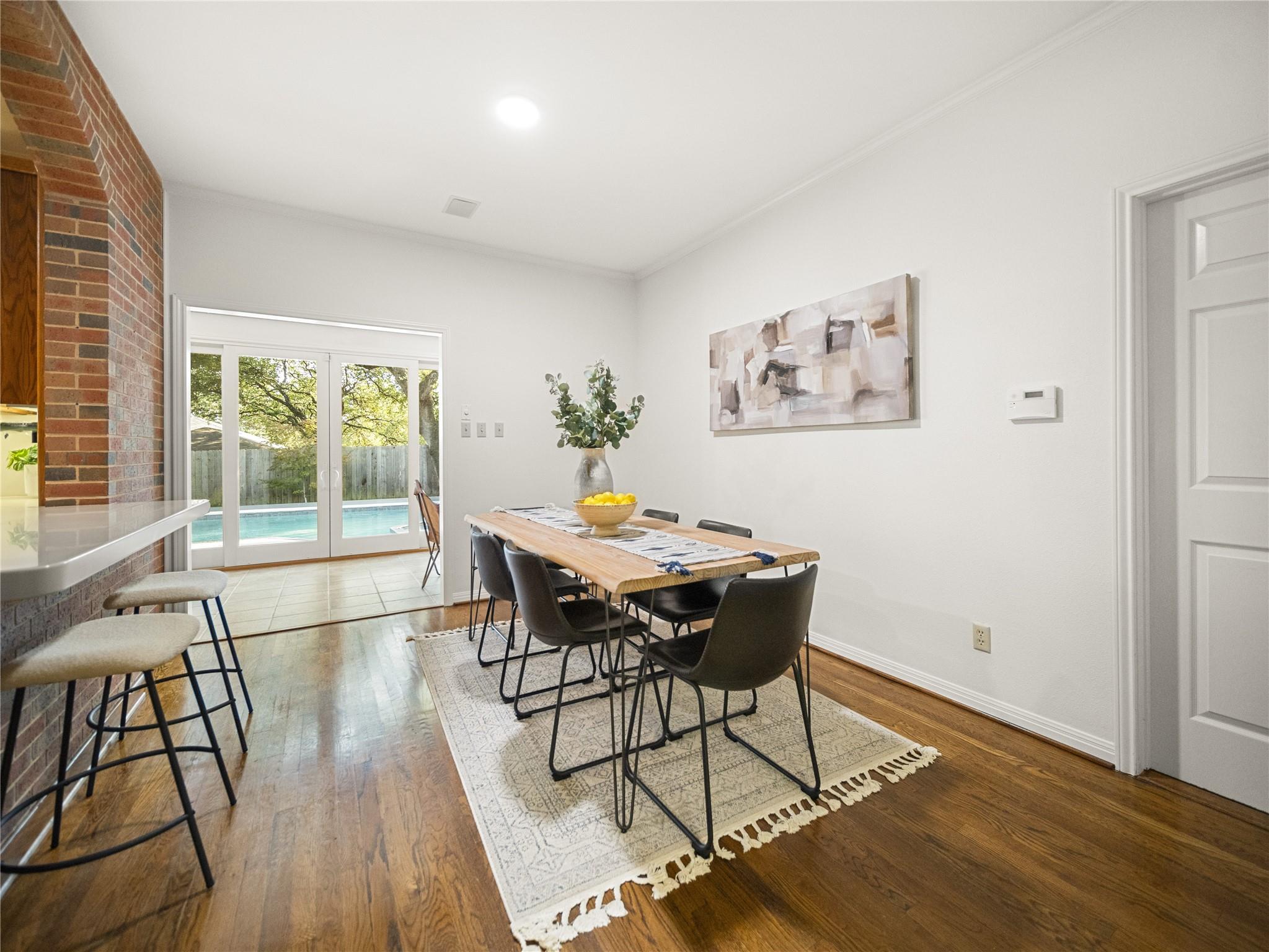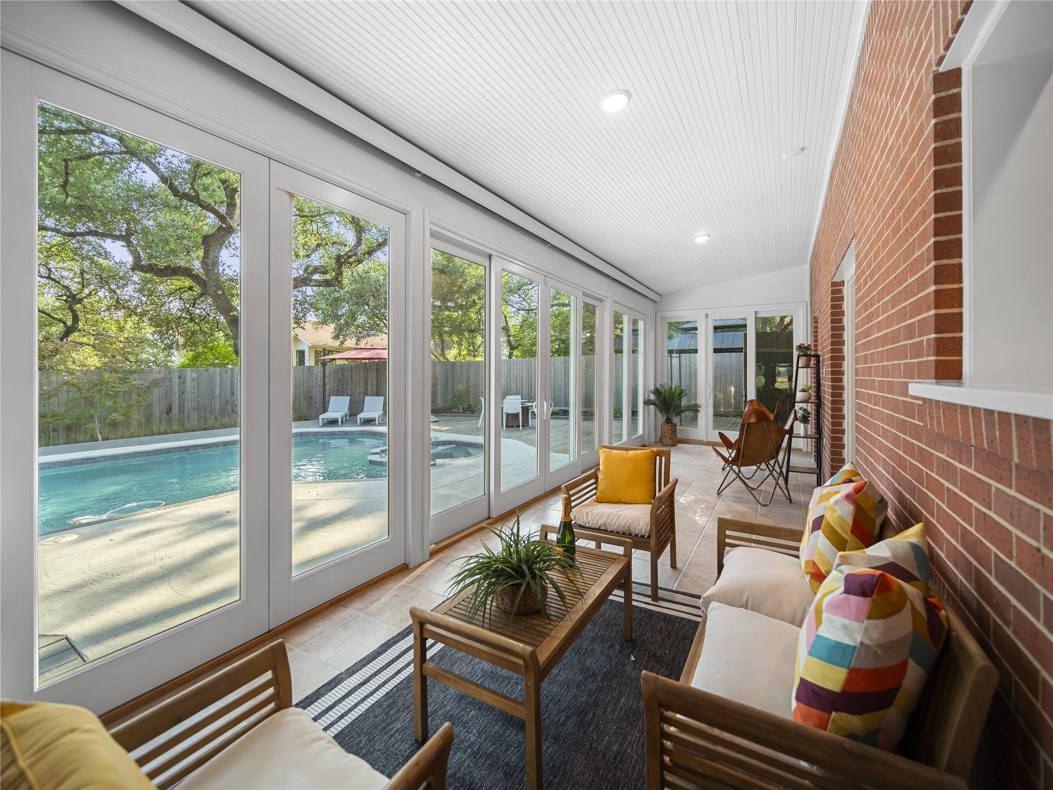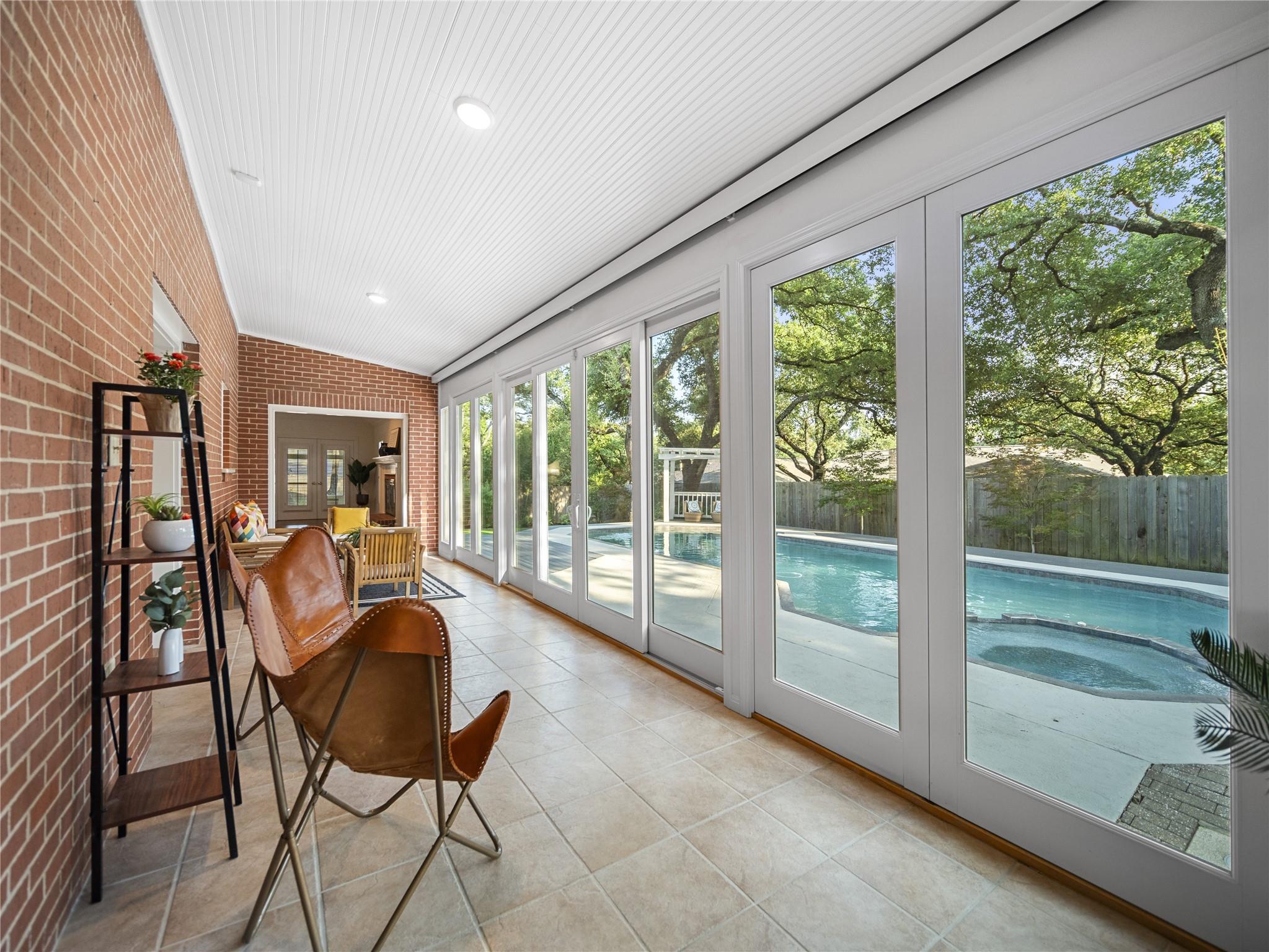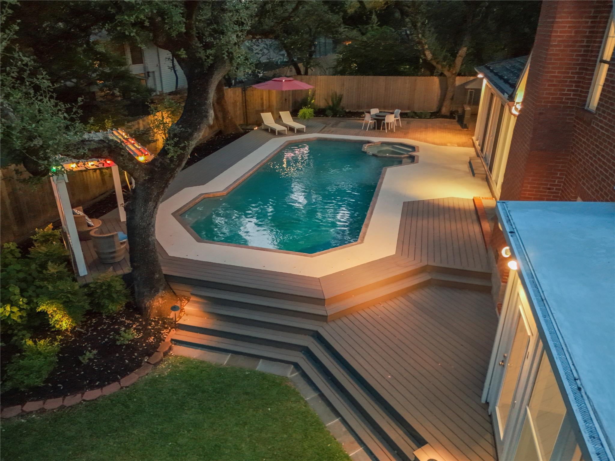 A true southern beauty, this home was custom built with attention to detail on ~1/3 AC level lot covered with gorgeous oak trees. This charming home has been lovingly maintained, inside and out, by one owner. Located on one of the most coveted streets and sections of Northwest Hills, this classic, two-story red brick home with a welcoming and deep, covered front porch adorned with stately columns has many attributes. Highlights of this carefully curated timeless design include: real wood floors, two huge livings areas and both have fireplaces (one down, one up), designated office on main level, sunroom spanning back of home overlooking expansive backyard oasis, solar heated pool with hot tub, an incredible, oversized Primary Bedroom downstairs with an exercise room attached, large Primary Bath with two roomy his/hers walk-in closets, wonderful kitchen in the heart of the home, breakfast area as well as separate dining area for hosting family and friends, two secondary bedrooms upstairs, two separate staircases to access the upper level, two Trane systems maintained by Christianson, unique patterned shingle roof already checked and in good condition, home is smartly equipped with a Generac generator, new carpet, freshly painted an elegant, captivating neutral palette, and you'll relish the abundance of storage throughout! Enjoy backyard bliss: pool and hot tub surrounded by composite deck, plentiful lounging areas, gas fire pit, covered outdoor grilling area, hidden storage shed for all your gardening and pool needs, plenty of grassy area for the family pet and playscape, fully landscaped, manicured lawns both front and back, backyard is surrounded by an 8 ft tall privacy fence. Walk/bike to JCC, Doss and Murchison. HEB is minutes away, as well as doctors offices, shopping, and a quick commute to downtown, UT, and The Domain. Solid as a rock and superb location. Charleston-like charm and splendor on the south side of Green Trails in the heart of Northwest Hills!