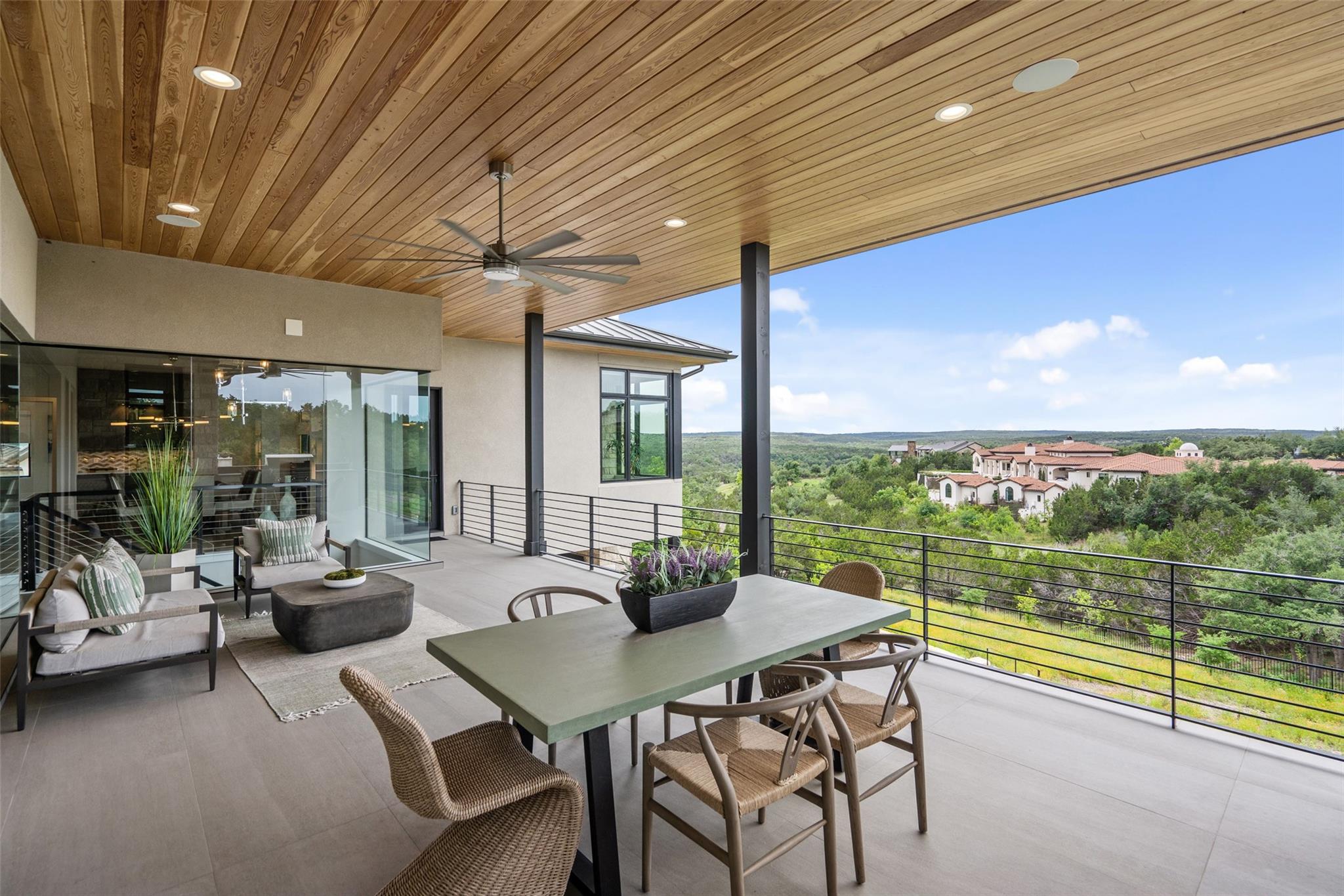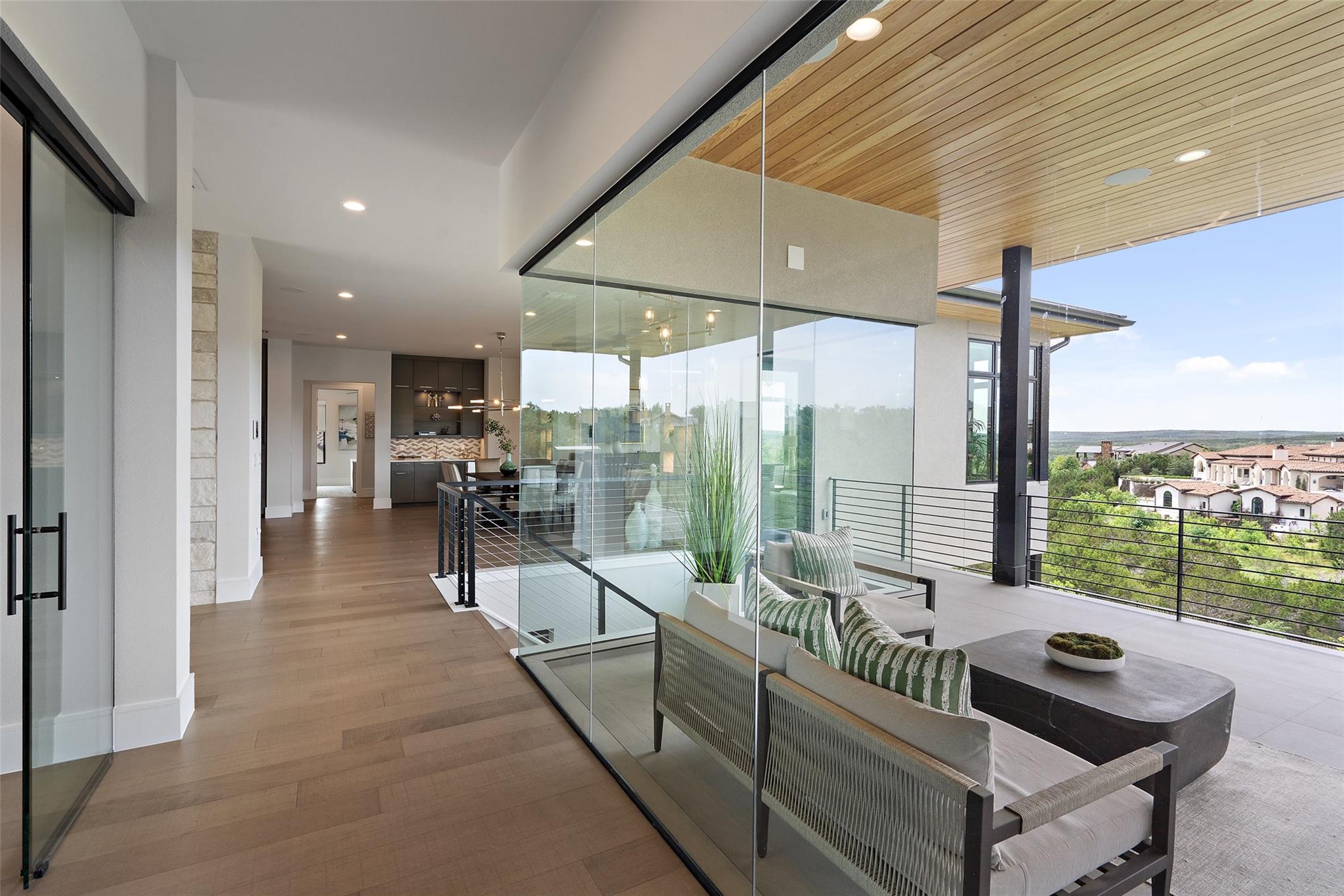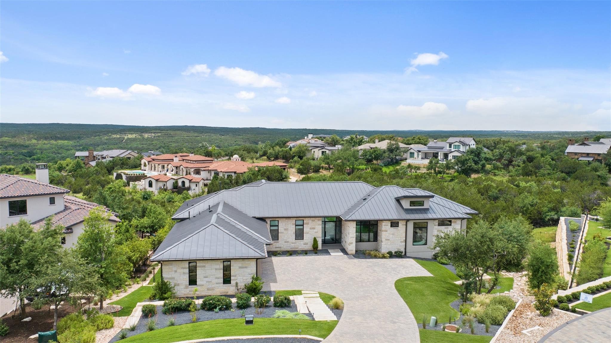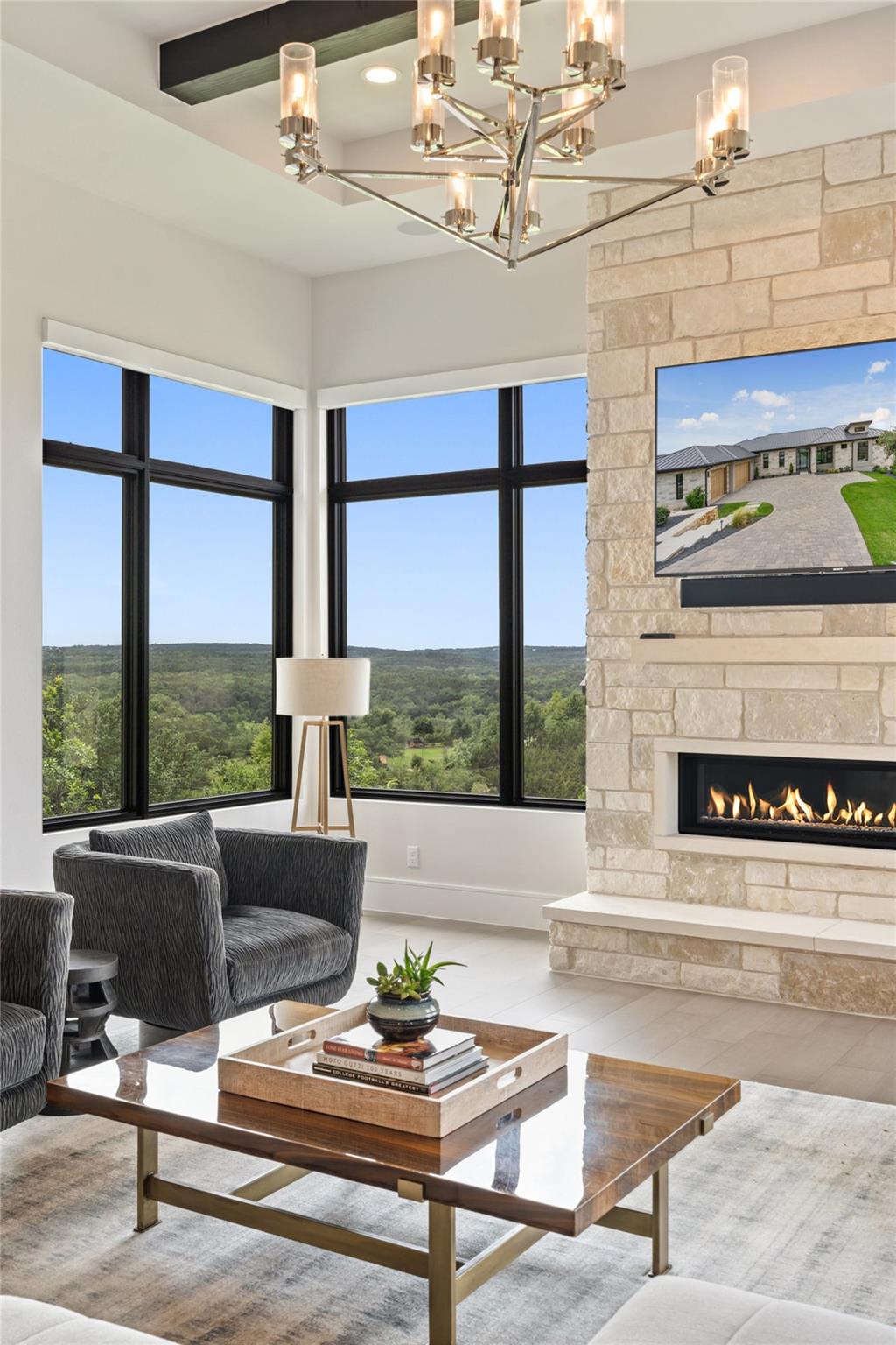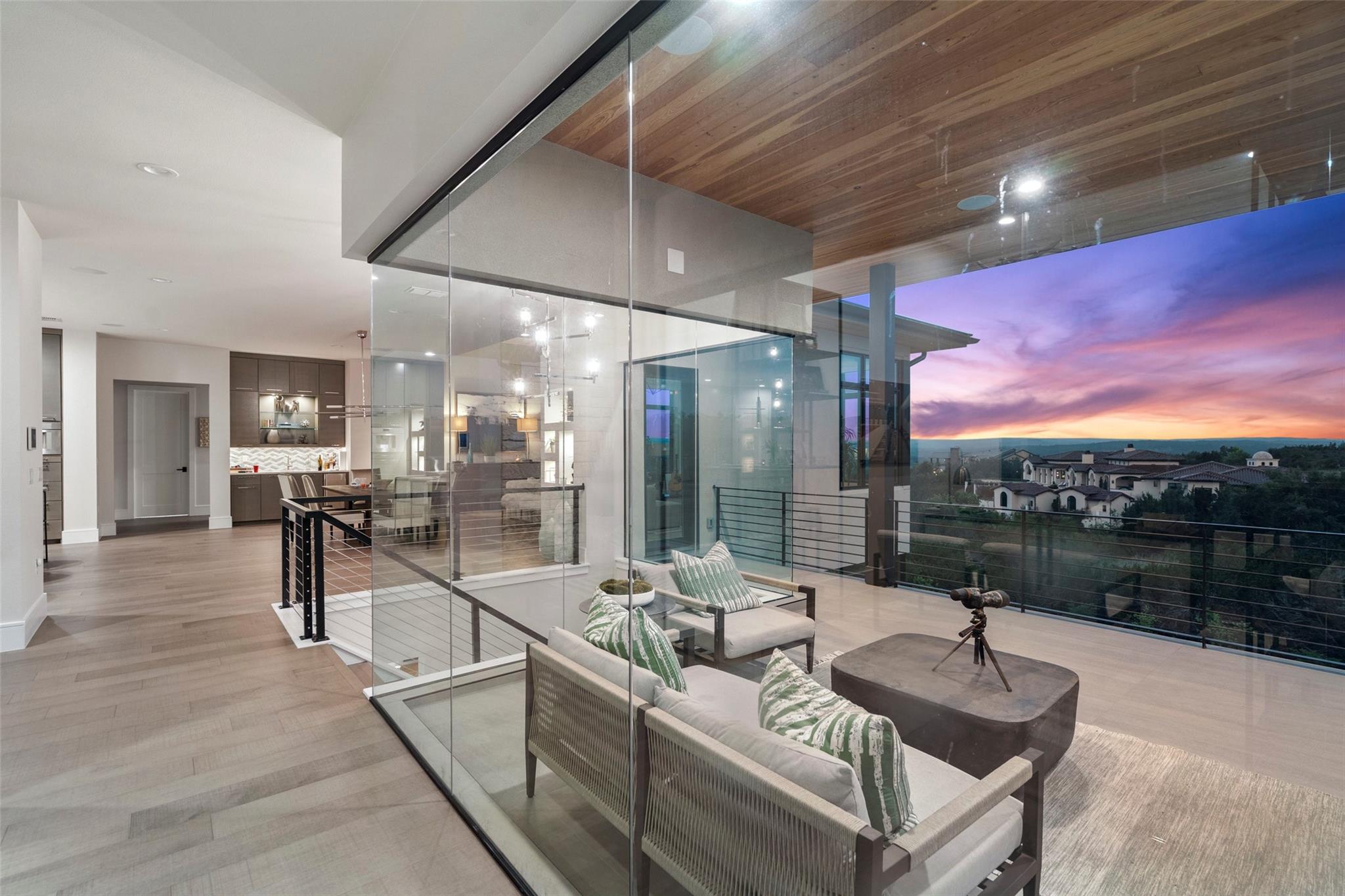 Nestled in a peaceful cul-de-sac, where every detail has been meticulously crafted. This stunning 5-bedroom, 5-bath estate boasts unparalleled views of rolling hills. As you step inside, you're greeted by walls of glass that frame the breathtaking vistas, seamlessly blending the indoors with outdoors. Triangulo Brazilian oak floors grace the main level. The gourmet kitchen features custom cabinetry, Thermador appliances, including a built-in coffee maker, and two walk-in pantries. Entertain guests in the formal dining area, or unwind in the living room, adorned with oak wood flooring and floor-to-ceiling limestone fireplace. The adjacent wet bar with an ice maker adds an extra touch of elegance. Retreat to the luxurious primary suite, where automatic shades, wood floors, and panoramic views create a serene atmosphere. The ensuite primary bath offers a spa-like experience with quartz countertops, dual sinks, a Victoria and Albert soaking tub, and a separate shower with multiple shower heads. The expansive walk-in closet with custom built-ins ensures ample storage space. With three bedrooms on the main level, including the primary, and two additional bedrooms on the lower level, there's plenty of room for family and guests. Each bedroom boasts an ensuite bathroom and walk-in closet with built-ins. Entertainment awaits on the lower level, where a spacious game room, complete with a wet bar opens onto covered decks with a fireplace. Step outside to the negative edge pool and spa, or dine alfresco on the upper-level covered deck with its own outdoor kitchen. Additional features include a study with a glass wall overlooking the views, a mudroom with built-in desk, large utility room, $120,000 worth of professional audio-visual equipment, landscape lighting, and a whole house reverse osmosis water system. With over 1400 square feet of covered decks, this one-acre estate offers the perfect blend of indoor and outdoor living in this hill country haven.