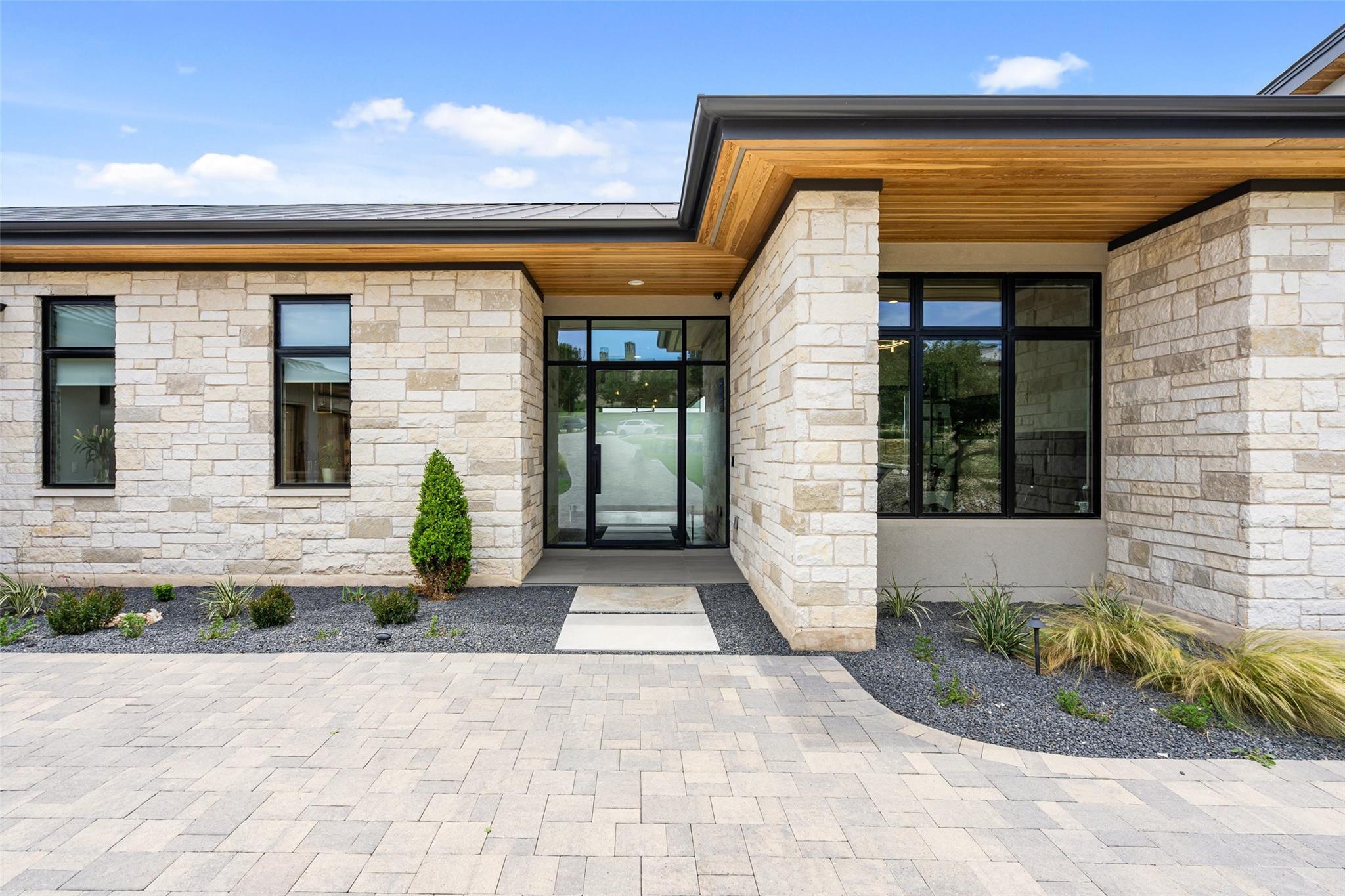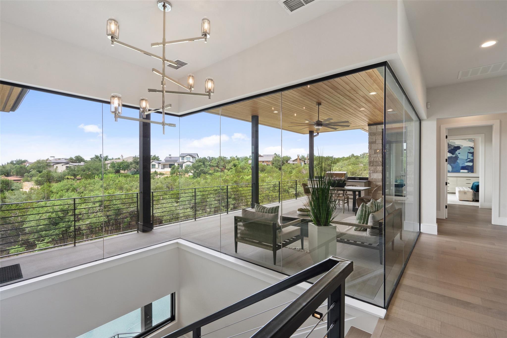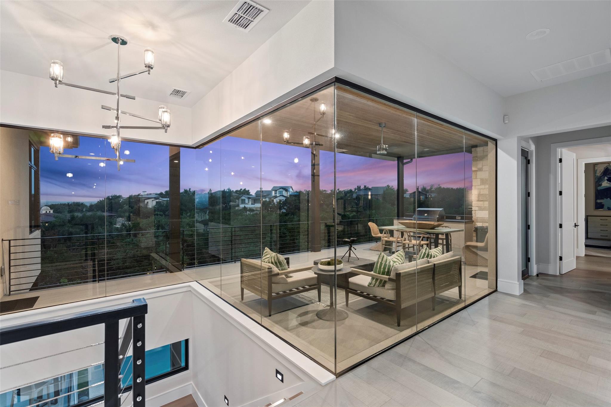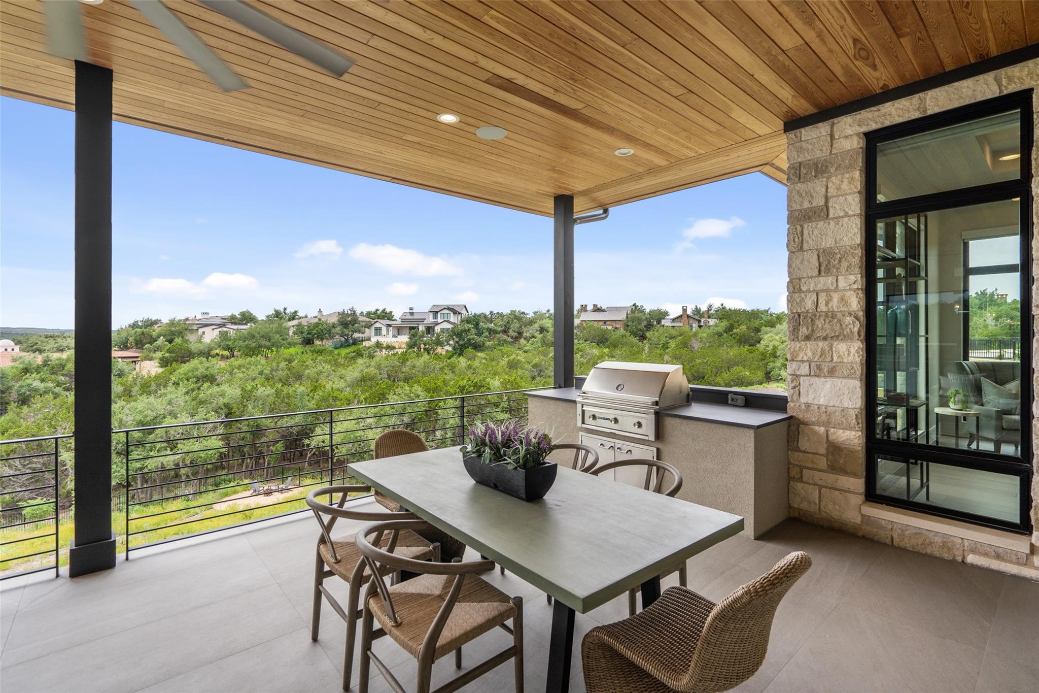 Nestled in a peaceful cul-de-sac, where every detail has been meticulously crafted. This stunning 5-bedroom, 5-bath estate boasts unparalleled views of rolling hills. As you step inside, you're greeted by walls of glass that frame the breathtaking vistas, seamlessly blending the indoors with outdoors. Triangulo Brazilian oak floors grace the main level. The gourmet kitchen features custom cabinetry, Thermador appliances, including a built-in coffee maker, and two walk-in pantries. Entertain guests in the formal dining area, or unwind in the living room, adorned with oak wood flooring and floor-to-ceiling limestone fireplace. The adjacent wet bar with an ice maker adds an extra touch of elegance. Retreat to the luxurious primary suite, where automatic shades, wood floors, and panoramic views create a serene atmosphere. The ensuite primary bath offers a spa-like experience with quartz countertops, dual sinks, a Victoria and Albert soaking tub, and a separate shower with multiple shower heads. The expansive walk-in closet with custom built-ins ensures ample storage space. With three bedrooms on the main level, including the primary, and two additional bedrooms on the lower level, there's plenty of room for family and guests. Each bedroom boasts an ensuite bathroom and walk-in closet with built-ins. Entertainment awaits on the lower level, where a spacious game room, complete with a wet bar opens onto covered decks with a fireplace. Step outside to the negative edge pool and spa, or dine alfresco on the upper-level covered deck with its own outdoor kitchen. Additional features include a study with a glass wall overlooking the views, a mudroom with built-in desk, large utility room, $120,000 worth of professional audio-visual equipment, landscape lighting, and a whole house reverse osmosis water system. With over 1400 square feet of covered decks, this one-acre estate offers the perfect blend of indoor and outdoor living in this hill country haven.