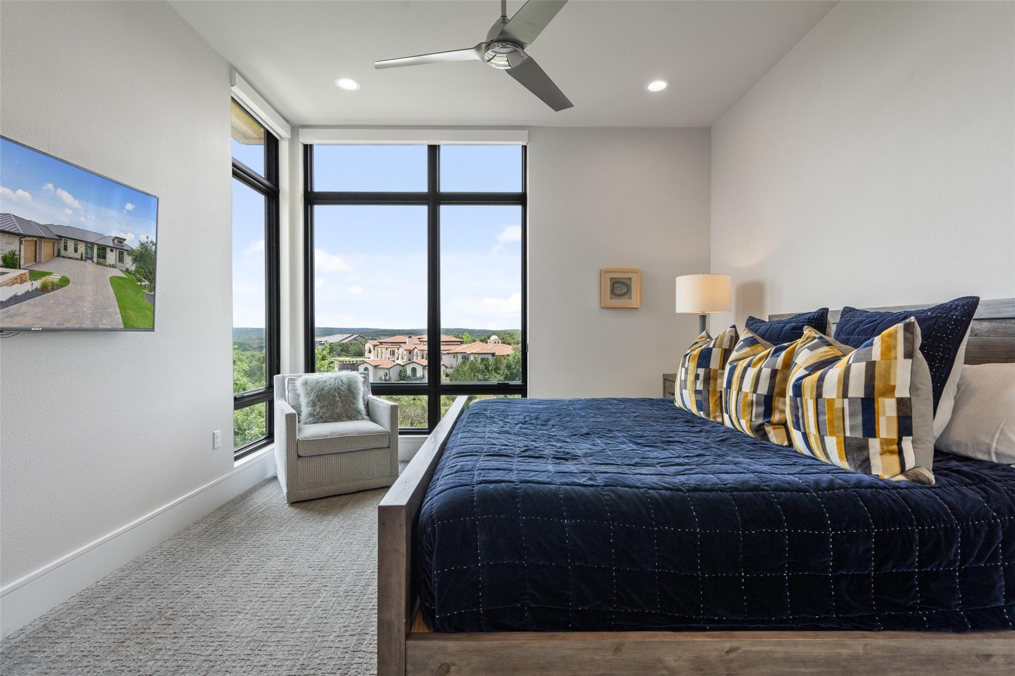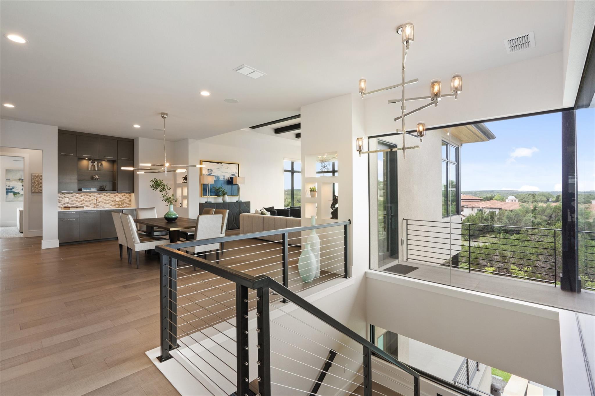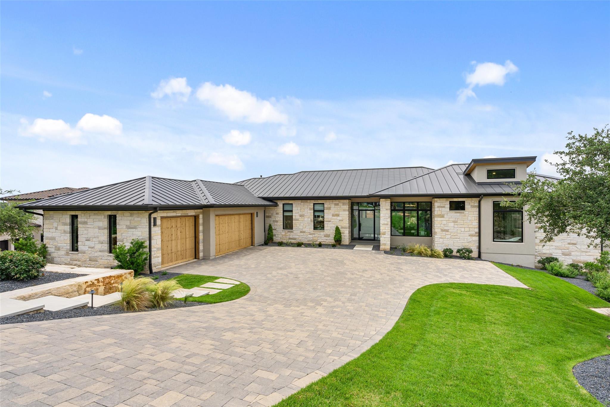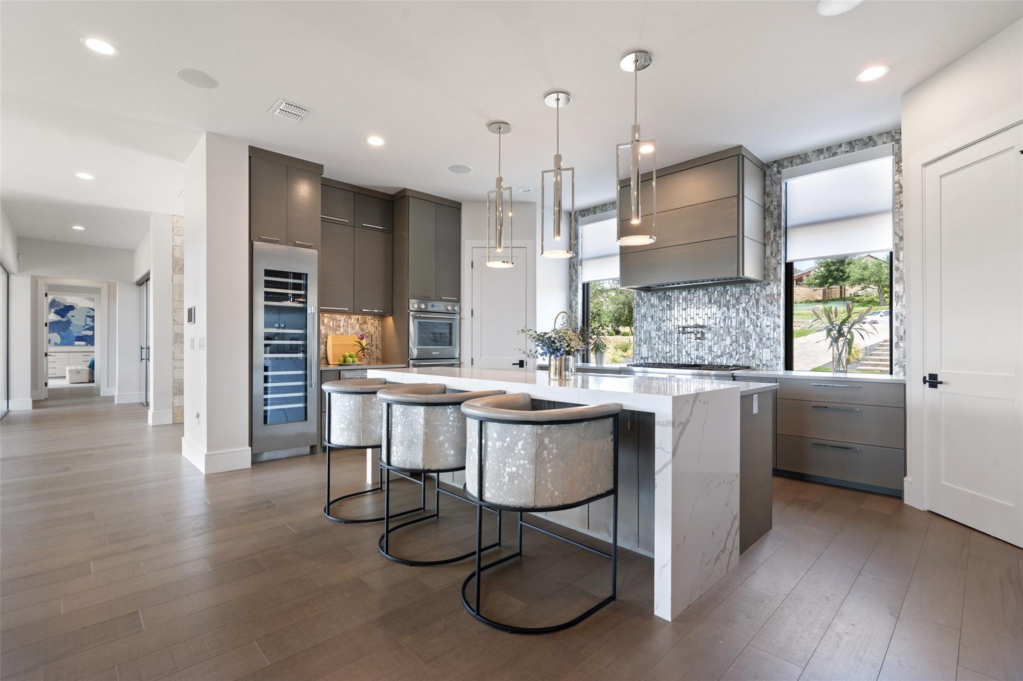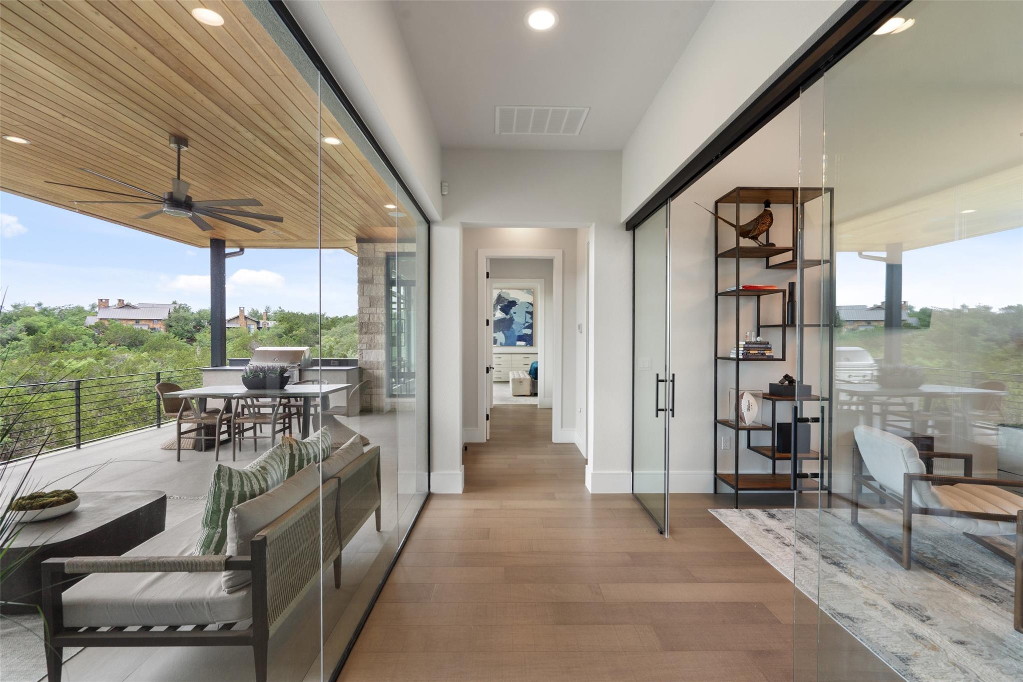 Nestled in a peaceful cul-de-sac, where every detail has been meticulously crafted. This stunning 5-bedroom, 5-bath estate boasts unparalleled views of rolling hills. As you step inside, you're greeted by walls of glass that frame the breathtaking vistas, seamlessly blending the indoors with outdoors. Triangulo Brazilian oak floors grace the main level. The gourmet kitchen features custom cabinetry, Thermador appliances, including a built-in coffee maker, and two walk-in pantries. Entertain guests in the formal dining area, or unwind in the living room, adorned with oak wood flooring and floor-to-ceiling limestone fireplace. The adjacent wet bar with an ice maker adds an extra touch of elegance. Retreat to the luxurious primary suite, where automatic shades, wood floors, and panoramic views create a serene atmosphere. The ensuite primary bath offers a spa-like experience with quartz countertops, dual sinks, a Victoria and Albert soaking tub, and a separate shower with multiple shower heads. The expansive walk-in closet with custom built-ins ensures ample storage space. With three bedrooms on the main level, including the primary, and two additional bedrooms on the lower level, there's plenty of room for family and guests. Each bedroom boasts an ensuite bathroom and walk-in closet with built-ins. Entertainment awaits on the lower level, where a spacious game room, complete with a wet bar opens onto covered decks with a fireplace. Step outside to the negative edge pool and spa, or dine alfresco on the upper-level covered deck with its own outdoor kitchen. Additional features include a study with a glass wall overlooking the views, a mudroom with built-in desk, large utility room, $120,000 worth of professional audio-visual equipment, landscape lighting, and a whole house reverse osmosis water system. With over 1400 square feet of covered decks, this one-acre estate offers the perfect blend of indoor and outdoor living in this hill country haven.