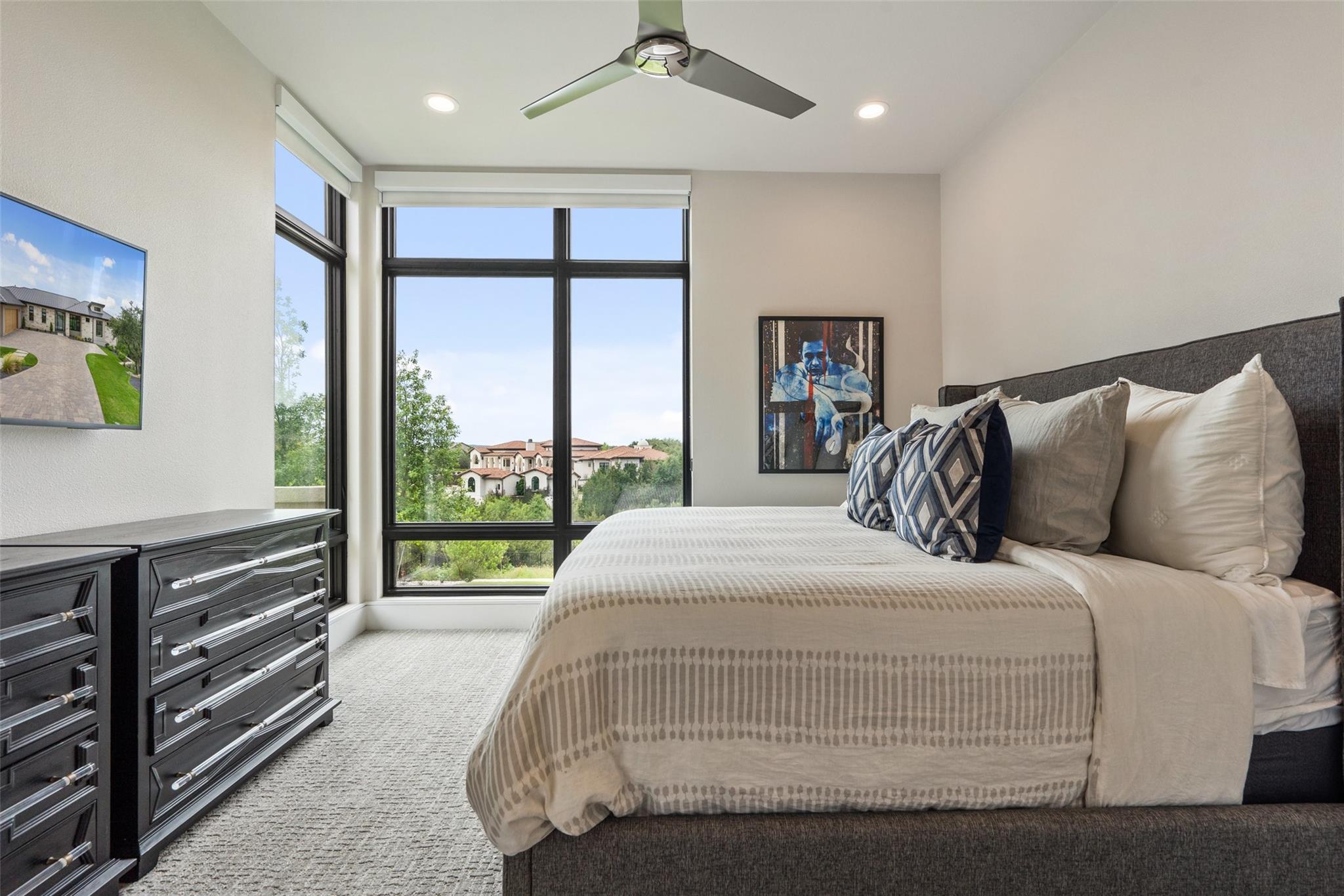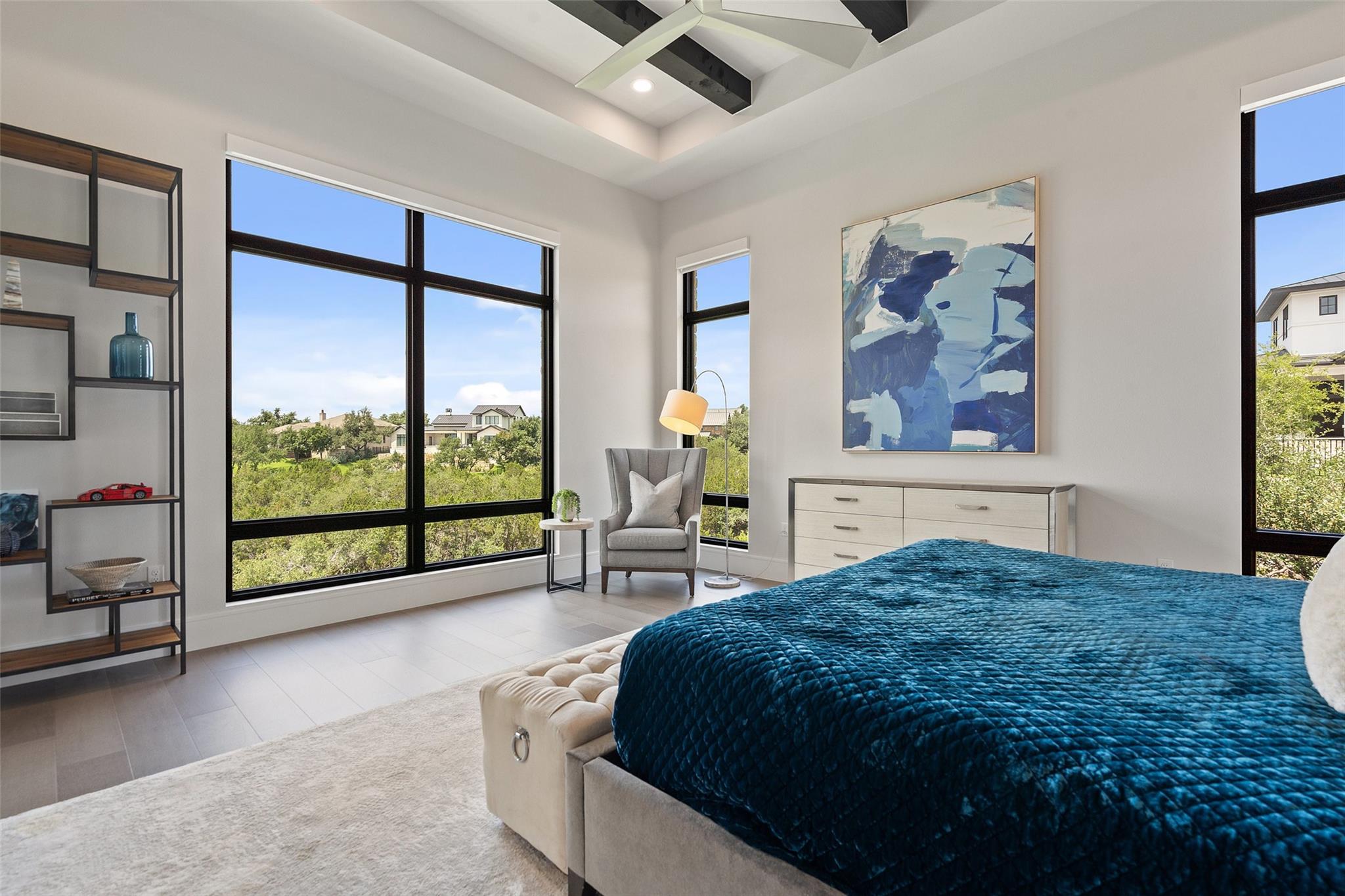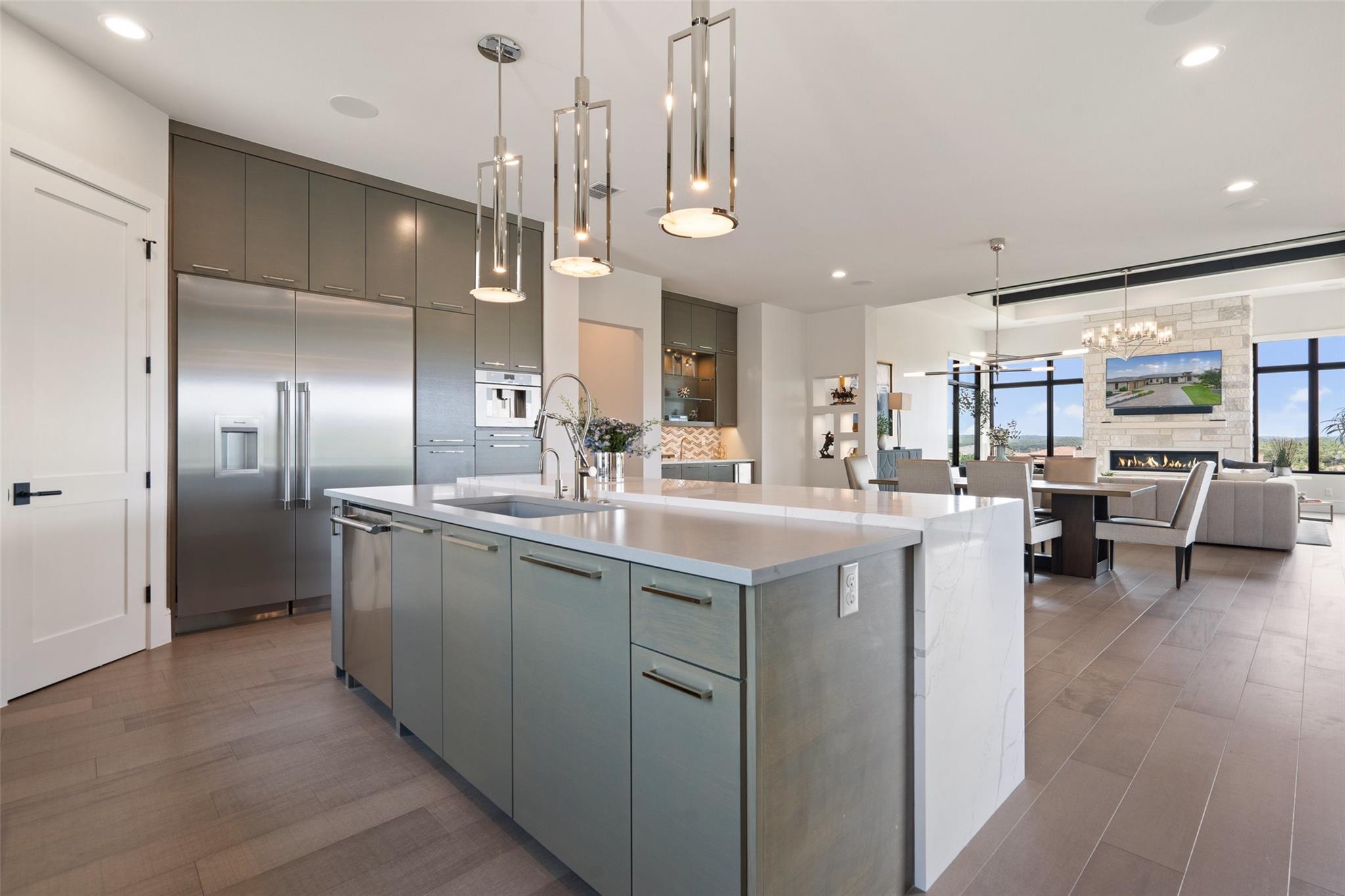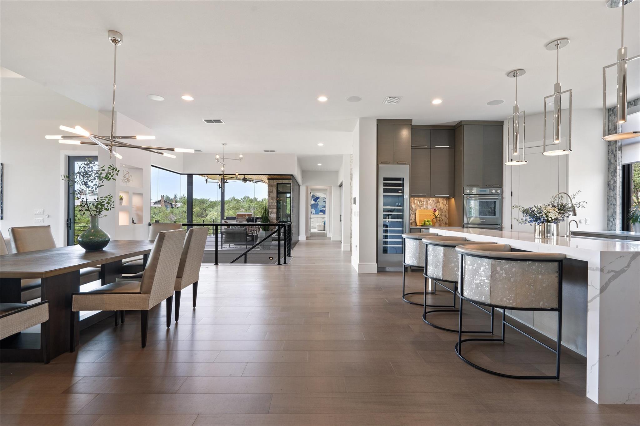 Nestled in a peaceful cul-de-sac, where every detail has been meticulously crafted. This stunning 5-bedroom, 5-bath estate boasts unparalleled views of rolling hills. As you step inside, you're greeted by walls of glass that frame the breathtaking vistas, seamlessly blending the indoors with outdoors. Triangulo Brazilian oak floors grace the main level. The gourmet kitchen features custom cabinetry, Thermador appliances, including a built-in coffee maker, and two walk-in pantries. Entertain guests in the formal dining area, or unwind in the living room, adorned with oak wood flooring and floor-to-ceiling limestone fireplace. The adjacent wet bar with an ice maker adds an extra touch of elegance. Retreat to the luxurious primary suite, where automatic shades, wood floors, and panoramic views create a serene atmosphere. The ensuite primary bath offers a spa-like experience with quartz countertops, dual sinks, a Victoria and Albert soaking tub, and a separate shower with multiple shower heads. The expansive walk-in closet with custom built-ins ensures ample storage space. With three bedrooms on the main level, including the primary, and two additional bedrooms on the lower level, there's plenty of room for family and guests. Each bedroom boasts an ensuite bathroom and walk-in closet with built-ins. Entertainment awaits on the lower level, where a spacious game room, complete with a wet bar opens onto covered decks with a fireplace. Step outside to the negative edge pool and spa, or dine alfresco on the upper-level covered deck with its own outdoor kitchen. Additional features include a study with a glass wall overlooking the views, a mudroom with built-in desk, large utility room, $120,000 worth of professional audio-visual equipment, landscape lighting, and a whole house reverse osmosis water system. With over 1400 square feet of covered decks, this one-acre estate offers the perfect blend of indoor and outdoor living in this hill country haven.