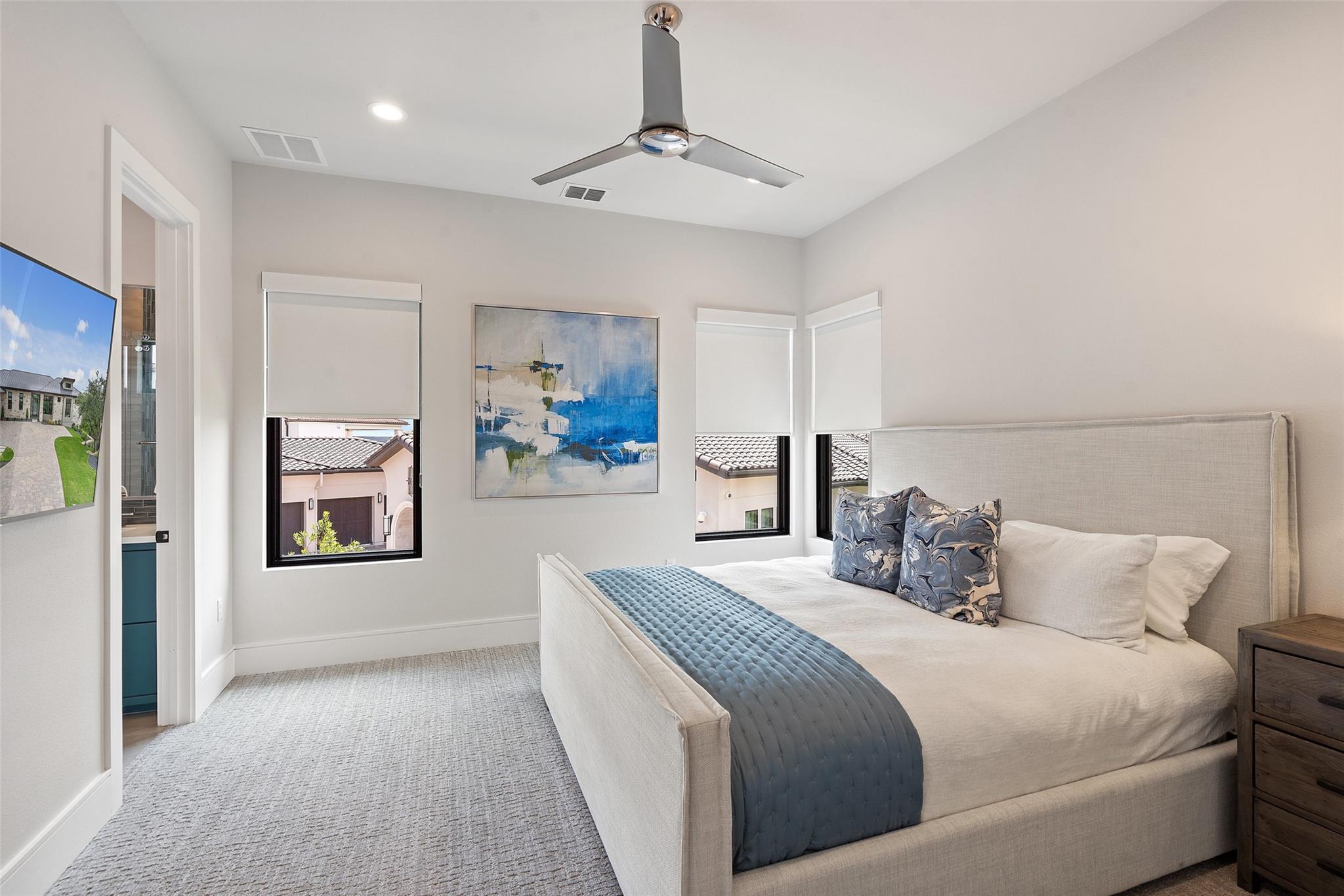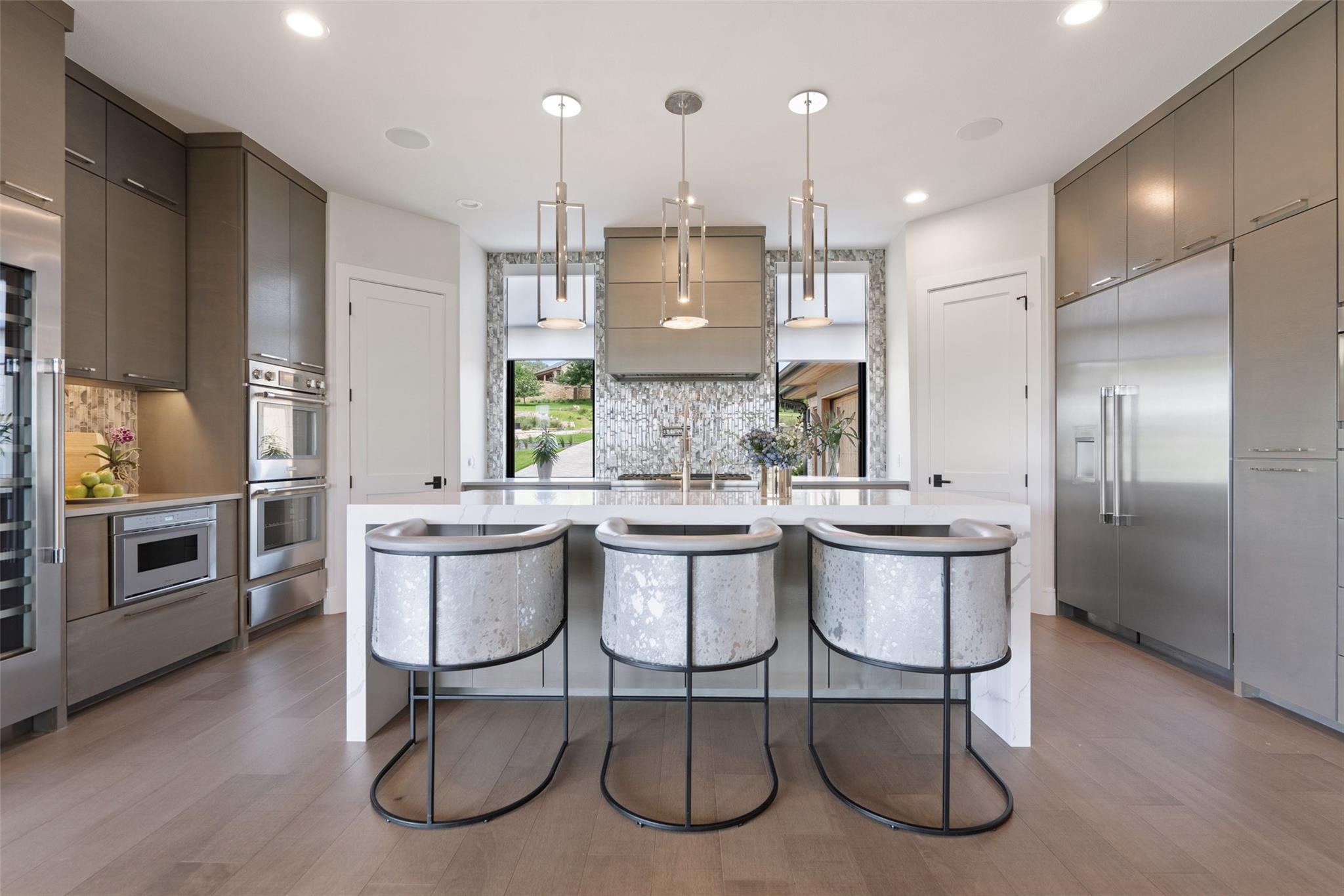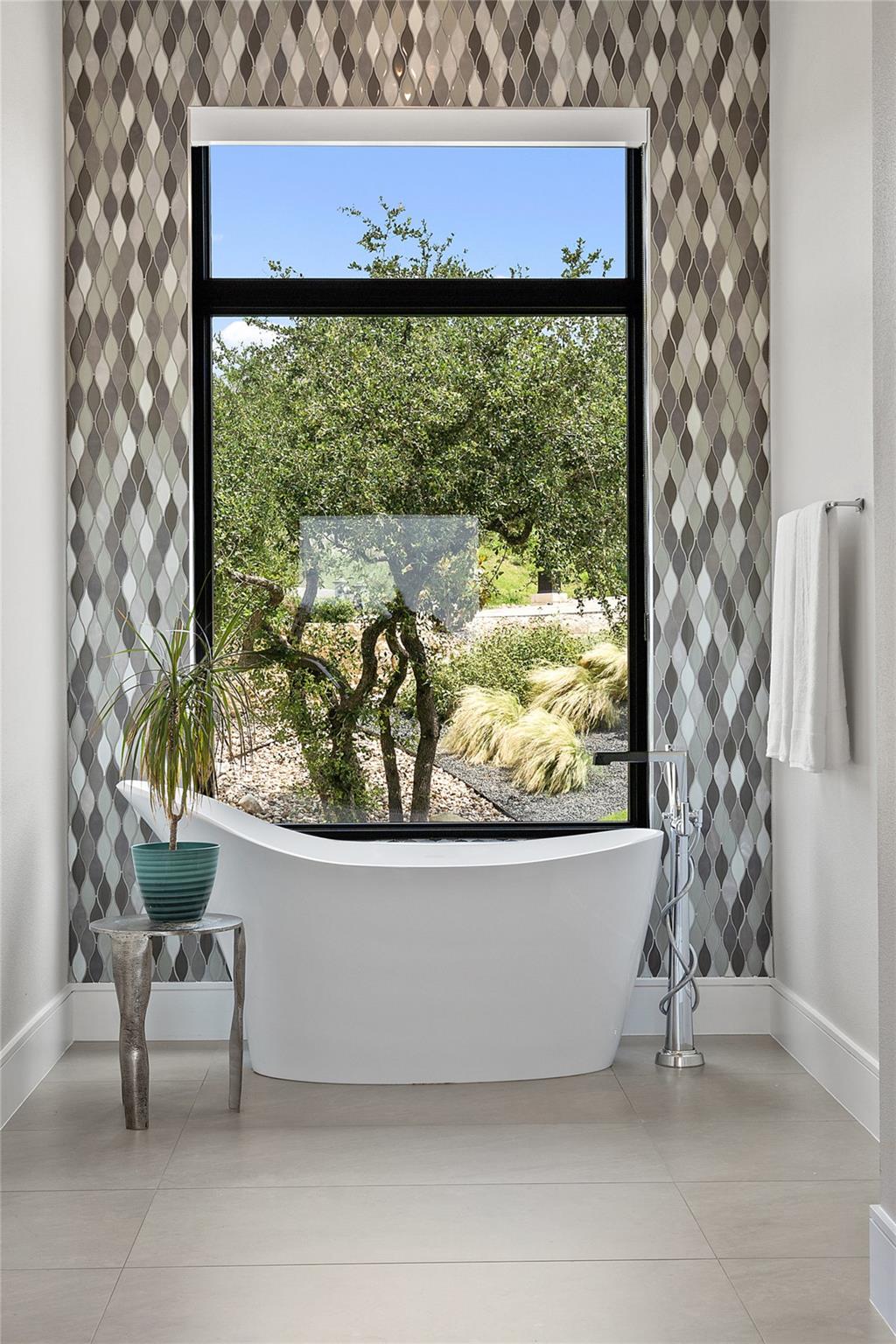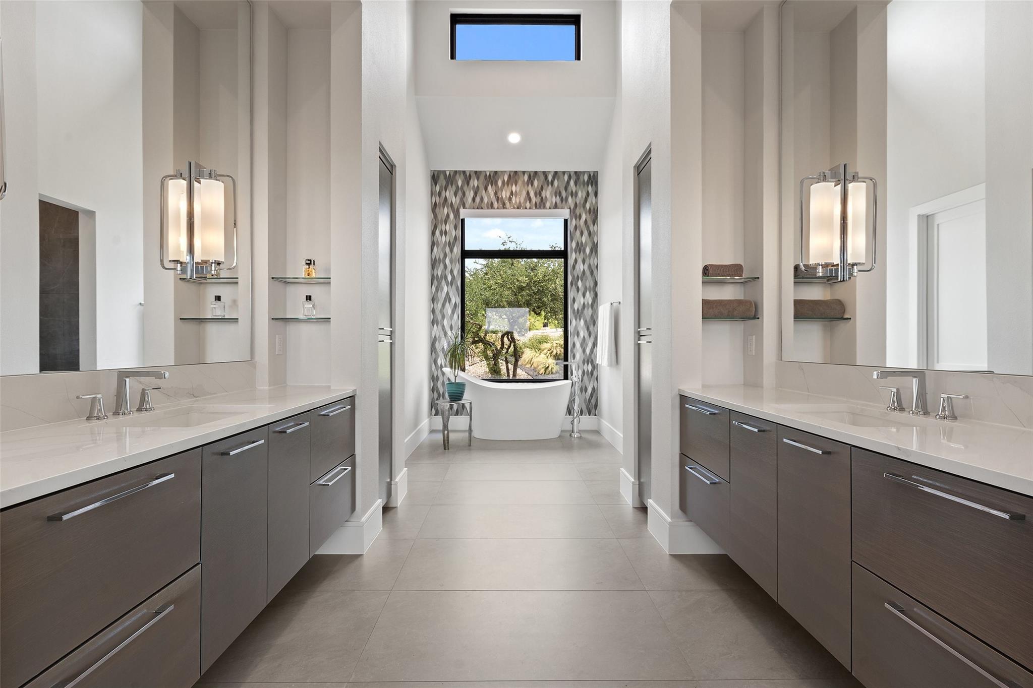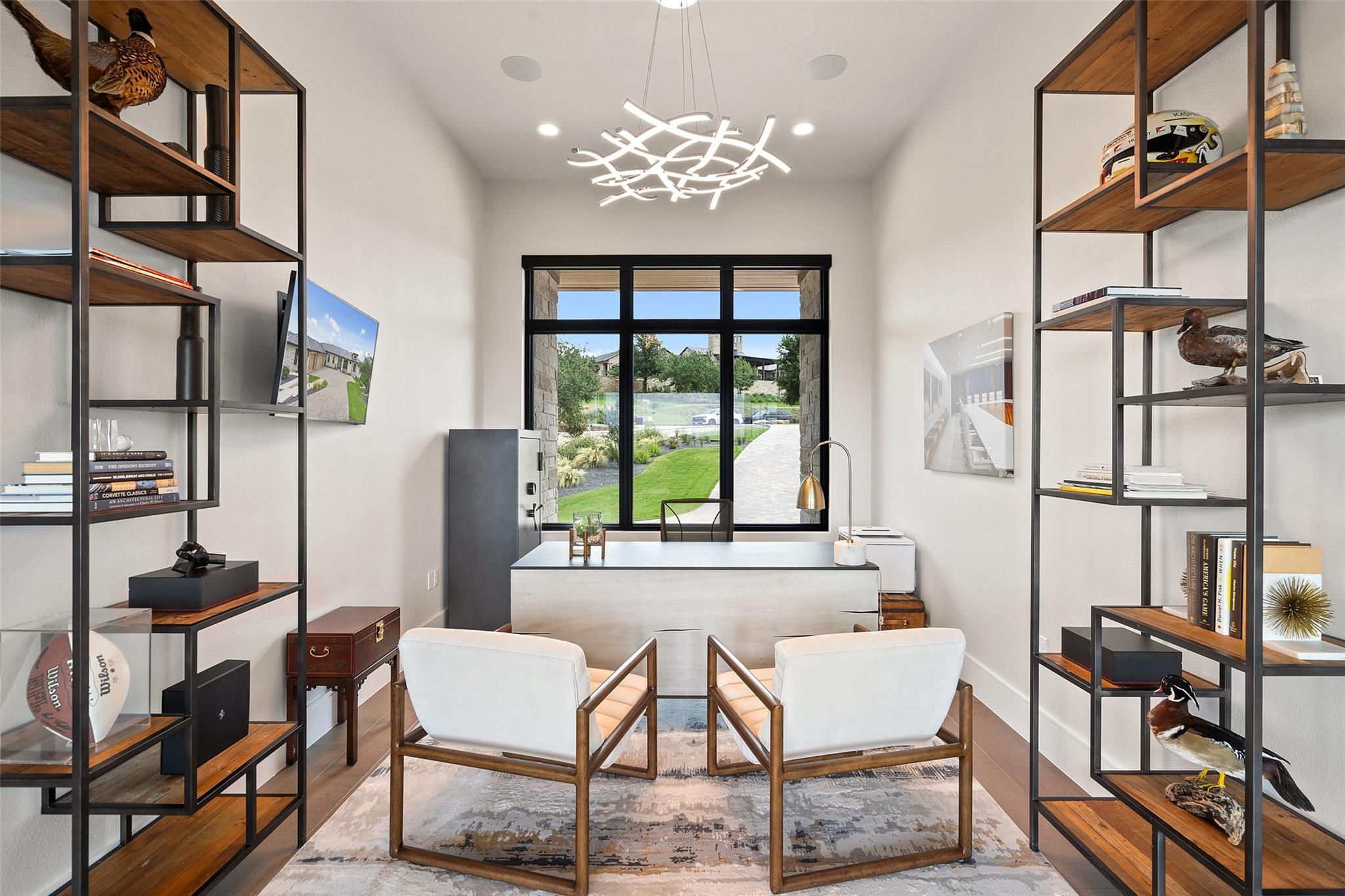 Nestled in a peaceful cul-de-sac, where every detail has been meticulously crafted. This stunning 5-bedroom, 5-bath estate boasts unparalleled views of rolling hills. As you step inside, you're greeted by walls of glass that frame the breathtaking vistas, seamlessly blending the indoors with outdoors. Triangulo Brazilian oak floors grace the main level. The gourmet kitchen features custom cabinetry, Thermador appliances, including a built-in coffee maker, and two walk-in pantries. Entertain guests in the formal dining area, or unwind in the living room, adorned with oak wood flooring and floor-to-ceiling limestone fireplace. The adjacent wet bar with an ice maker adds an extra touch of elegance. Retreat to the luxurious primary suite, where automatic shades, wood floors, and panoramic views create a serene atmosphere. The ensuite primary bath offers a spa-like experience with quartz countertops, dual sinks, a Victoria and Albert soaking tub, and a separate shower with multiple shower heads. The expansive walk-in closet with custom built-ins ensures ample storage space. With three bedrooms on the main level, including the primary, and two additional bedrooms on the lower level, there's plenty of room for family and guests. Each bedroom boasts an ensuite bathroom and walk-in closet with built-ins. Entertainment awaits on the lower level, where a spacious game room, complete with a wet bar opens onto covered decks with a fireplace. Step outside to the negative edge pool and spa, or dine alfresco on the upper-level covered deck with its own outdoor kitchen. Additional features include a study with a glass wall overlooking the views, a mudroom with built-in desk, large utility room, $120,000 worth of professional audio-visual equipment, landscape lighting, and a whole house reverse osmosis water system. With over 1400 square feet of covered decks, this one-acre estate offers the perfect blend of indoor and outdoor living in this hill country haven.