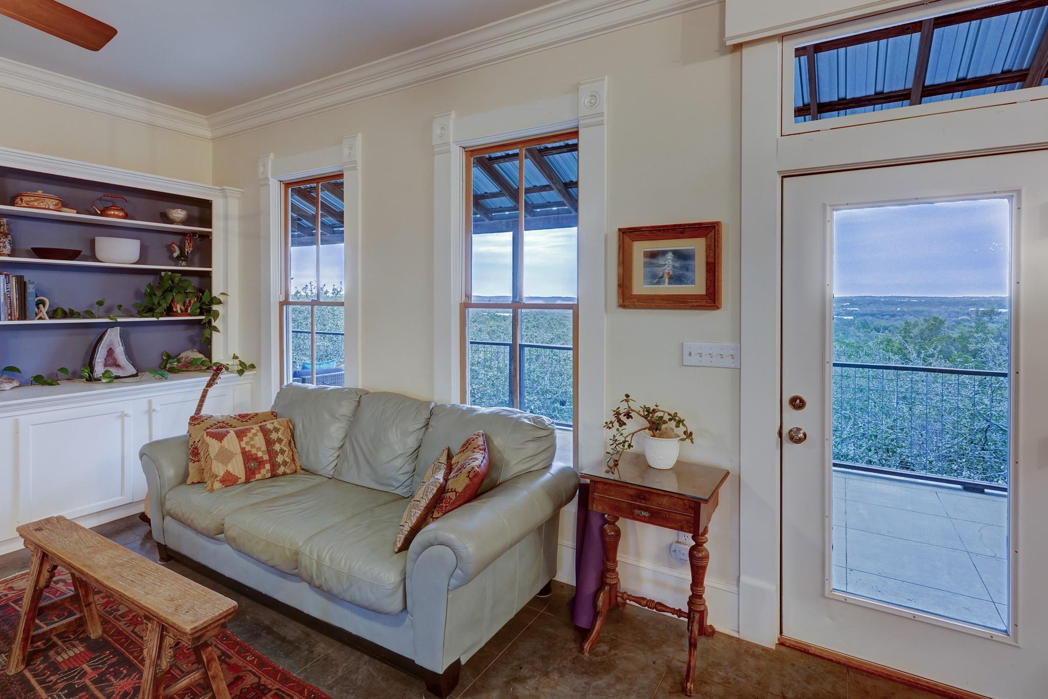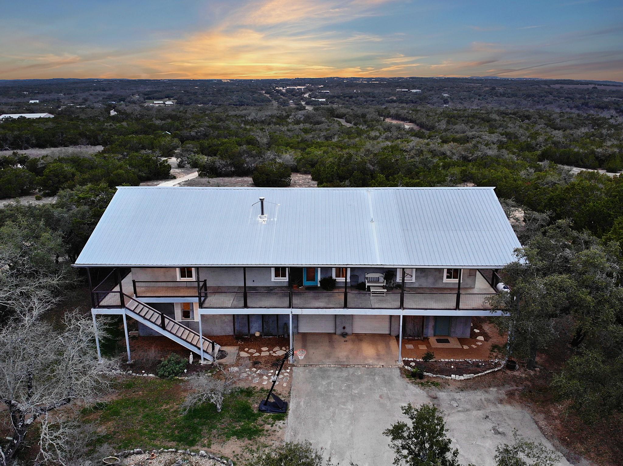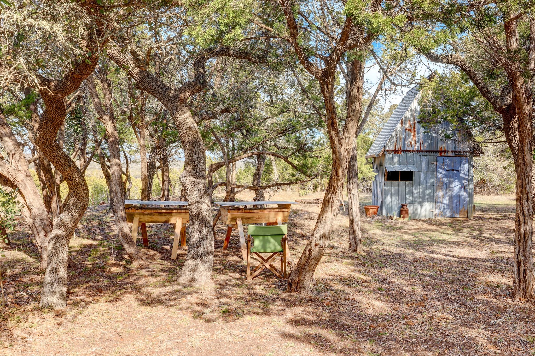 Significant Price Reduction! Must see it to appreciate its exquisite beauty! Truly amazing, tranquil 11.87 +/- acres of unrestricted land, offers one of the best sunset views in Central Texas. The home features ease of indoor/outdoor living, and entertaining is easy with its wrap around balcony and multiple outdoor spaces! Gated entrance, private and secluded, fully fenced property. There is an existing wildlife exemption and much lower tax rate. There are so many possibilities, including commercial uses or an equestrian facility. The home is on a 20,000 gallon rainwater cistern with state-of-the-art filtration system. There is a year-round garden, hunting is permissible and a gun range is on site. Quick access to Fitzhugh Road which is famous for breweries, wineries and venues! The hacienda-style home (per TCAD) and downstairs living quarters (measured) total 2,306 sq ft and were custom built in 1994 with 10 ft ceilings. The room with full bath downstairs can be used as an office, guest bedroom or flex space. Wake up and enjoy your mornings on the fabulous, full wrap around porch with views of the peaceful grounds and Hill Country. The home features custom crown molding, reclaimed bead-board ceilings in the bathrooms and concrete floors. Updates include gorgeous granite countertops in the kitchen and bathroom. The property also offers a guest cottage and commercial potential. The charming guest cottage measures at 414 square foot cottage has a full kitchen, bathroom, two loft areas for sleeping and is separately fenced. The cottage sits tucked away on the property, and has a separate utility meter. There is also a 50 amp RV electrical hookup. The spacious pull through garage offers a workshop. This is a truly unique and gorgeous property adorned with mature trees in a premiere location. The possibilities are endless! Buyer to independently verify measurements, as they are not guaranteed.