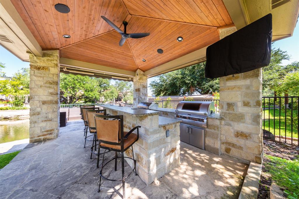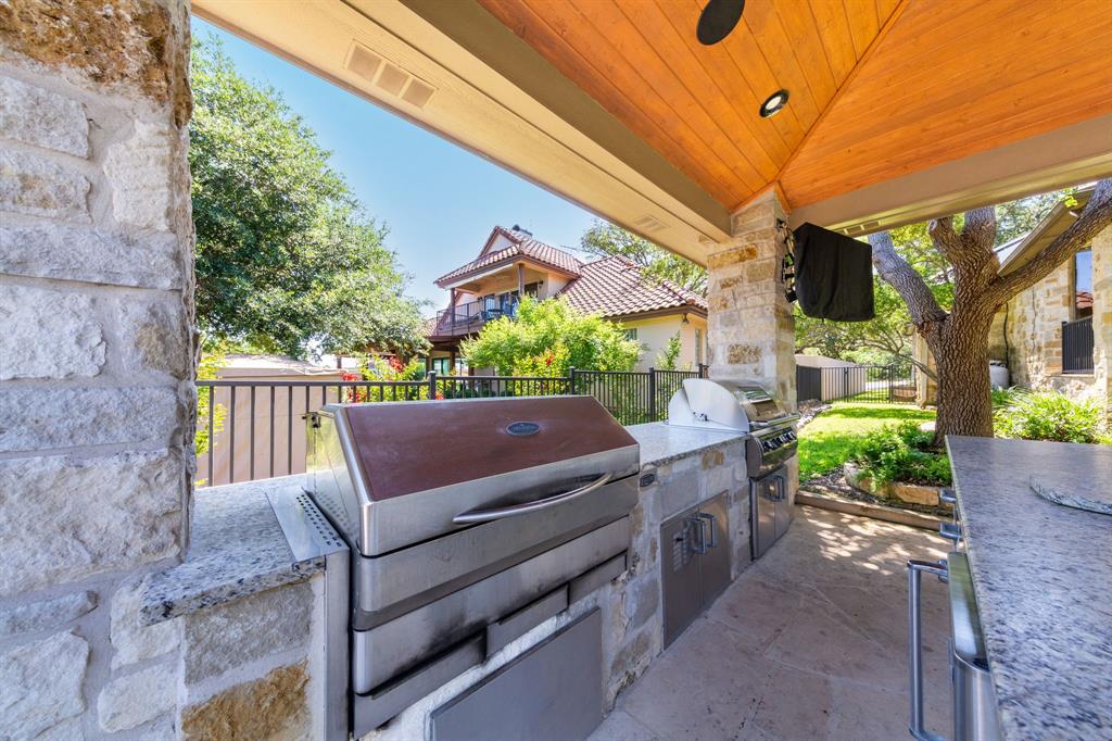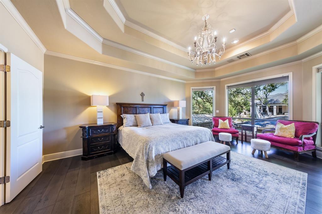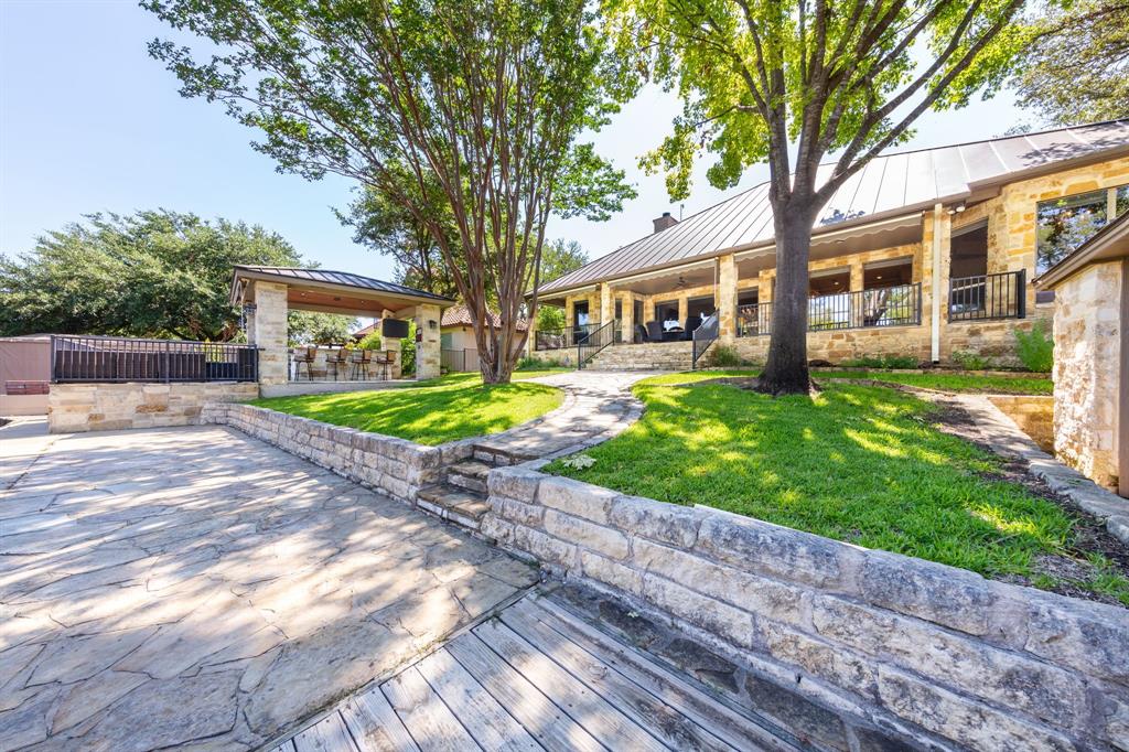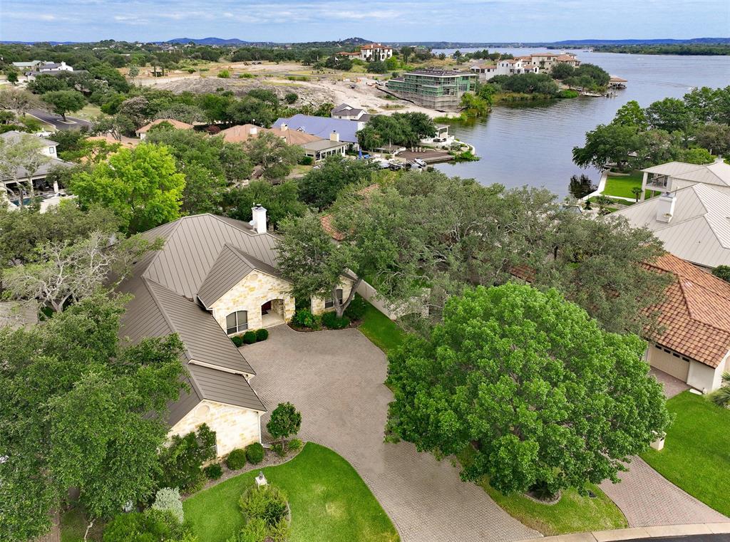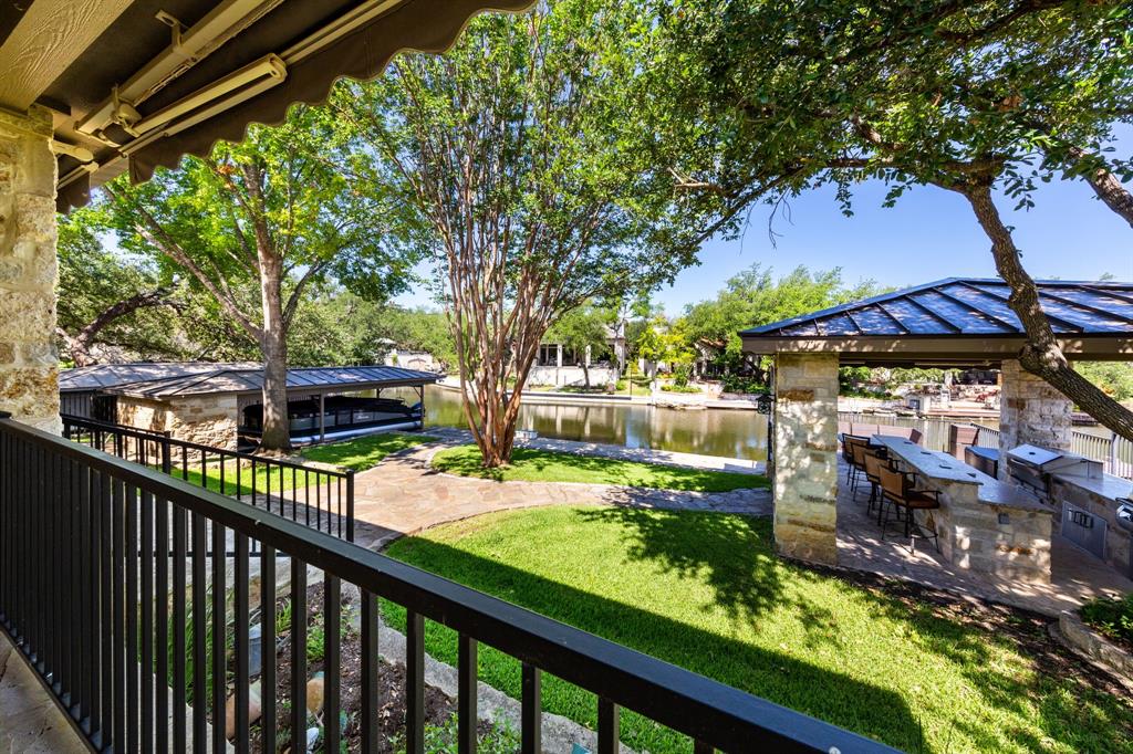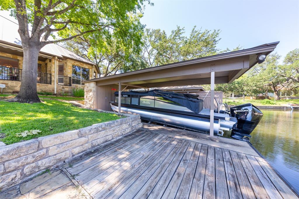 Enjoy tranquil waterfront living from this lovely, single story Lake LBJ home that is nestled in a protected cove just seconds from open water. This 4 bedroom, 3.5 bath home features a great room that’s open to the dining, kitchen, and breakfast areas that boasts soaring ceilings and gas fireplace as well as a split-bedroom plan offering privacy and comfort to all. Upon entry, your eyes will be drawn to the wall-to-wall windows in the great room that frame views to the covered patio and beyond to the waterfront, integrating the indoors and out seamlessly. The beautifully updated kitchen features a Subzero refrigerator and wine storage unit, Wolf gas cooktop and double ovens, walk-in pantry, breakfast bar, prep sink on the center island and a cozy breakfast area. Pendant lighting, quartz countertops and a brilliant tile backsplash make this heart of the home shine! The sizable master suite has a sitting area and outdoor patio access, a spa-like bath with double vanities, jetted tub and walk-in shower plus an enormous walk-in closet, accessible to the adjacent laundry room. Two dedicated guest rooms each feature walk-in closets and en-suite baths while the current home office could convert to a bedroom with closet and full bath just steps away. Outside the covered patio finds ample space for family & friends to gather before watching the game under the pergola that shades the lakeside bar & grilling station. 2 PWC lifts and a covered boat slip with lift make trips out on the lake stress-free. Don't miss it!