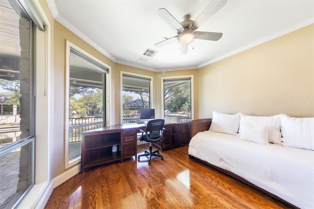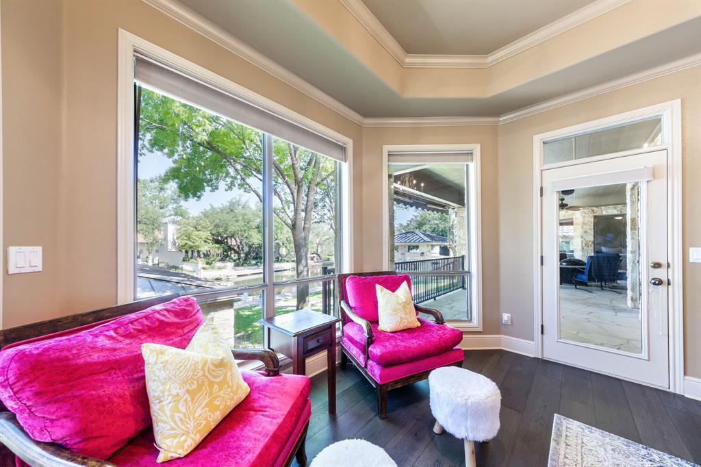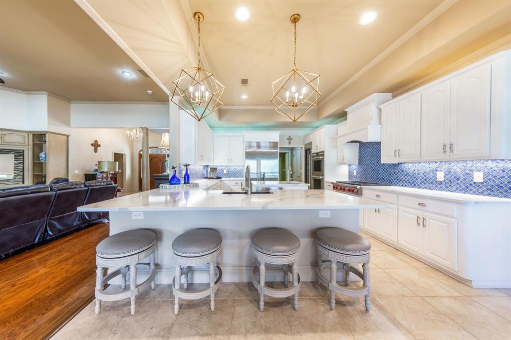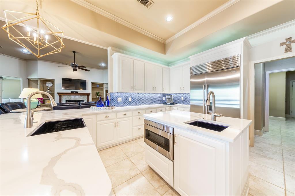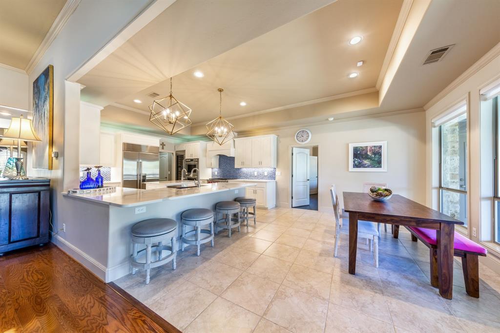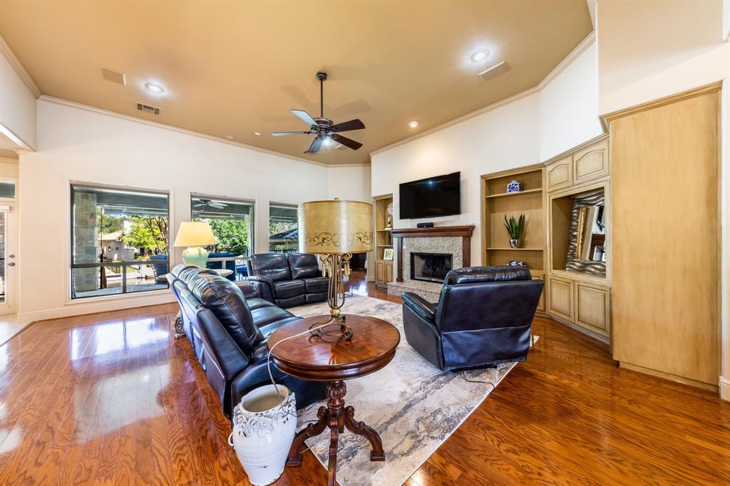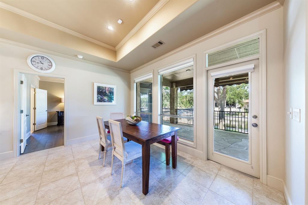 Enjoy tranquil waterfront living from this lovely, single story Lake LBJ home that is nestled in a protected cove just seconds from open water. This 4 bedroom, 3.5 bath home features a great room that’s open to the dining, kitchen, and breakfast areas that boasts soaring ceilings and gas fireplace as well as a split-bedroom plan offering privacy and comfort to all. Upon entry, your eyes will be drawn to the wall-to-wall windows in the great room that frame views to the covered patio and beyond to the waterfront, integrating the indoors and out seamlessly. The beautifully updated kitchen features a Subzero refrigerator and wine storage unit, Wolf gas cooktop and double ovens, walk-in pantry, breakfast bar, prep sink on the center island and a cozy breakfast area. Pendant lighting, quartz countertops and a brilliant tile backsplash make this heart of the home shine! The sizable master suite has a sitting area and outdoor patio access, a spa-like bath with double vanities, jetted tub and walk-in shower plus an enormous walk-in closet, accessible to the adjacent laundry room. Two dedicated guest rooms each feature walk-in closets and en-suite baths while the current home office could convert to a bedroom with closet and full bath just steps away. Outside the covered patio finds ample space for family & friends to gather before watching the game under the pergola that shades the lakeside bar & grilling station. 2 PWC lifts and a covered boat slip with lift make trips out on the lake stress-free. Don't miss it!